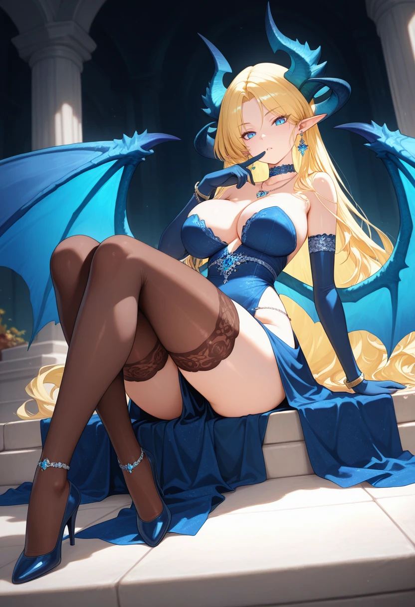 biancamyth_nekoforge,1girl,blonde hair,parted bangs,blue eyes,pointy ears,horns,dragon horns,blue dragon wings,large breasts,jewelry,earrings,