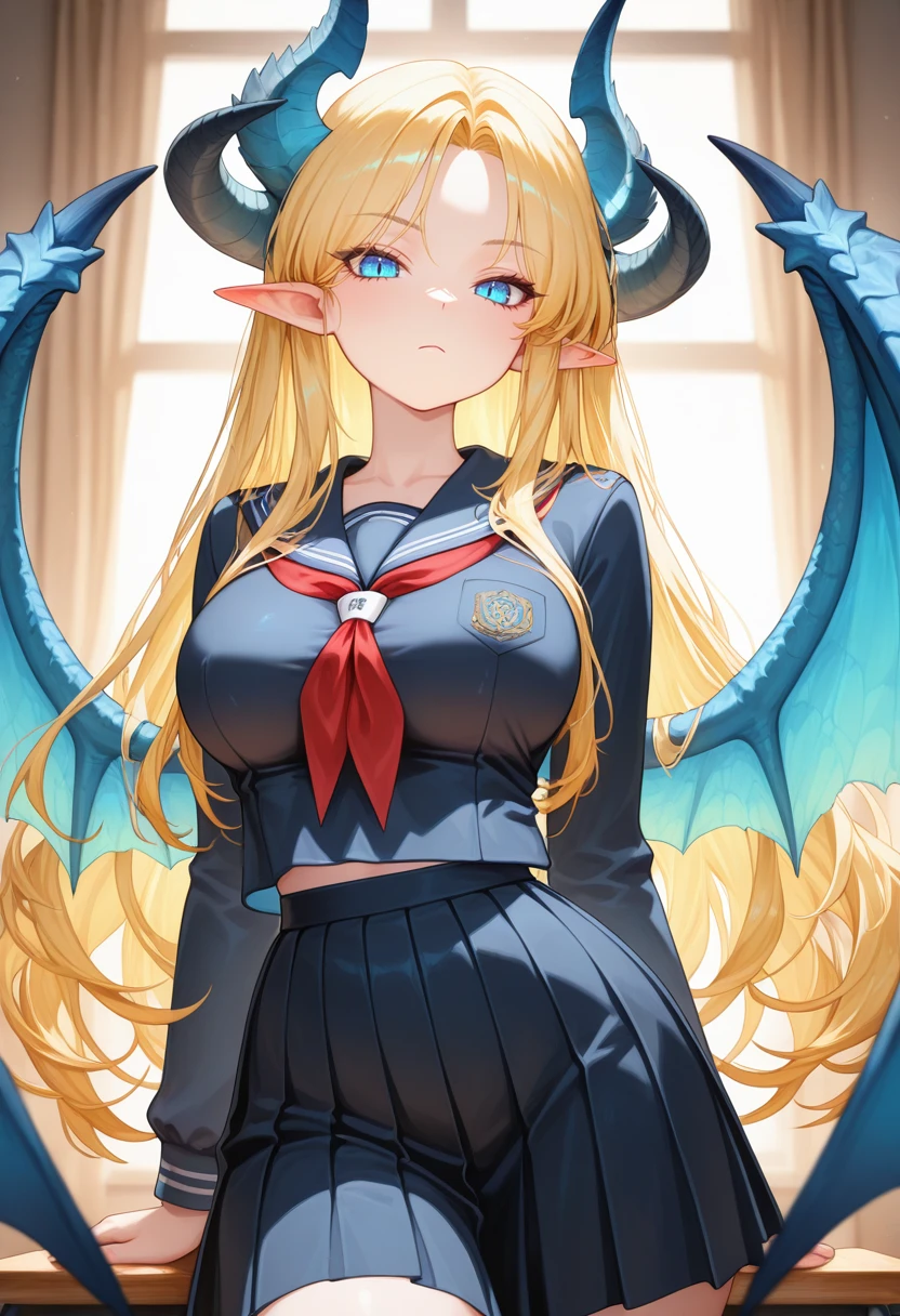 biancals_nekoforge,1girl,blonde hair,long hair,blue eyes,pointy ears,horns,dragon horns,blue dragon wings,