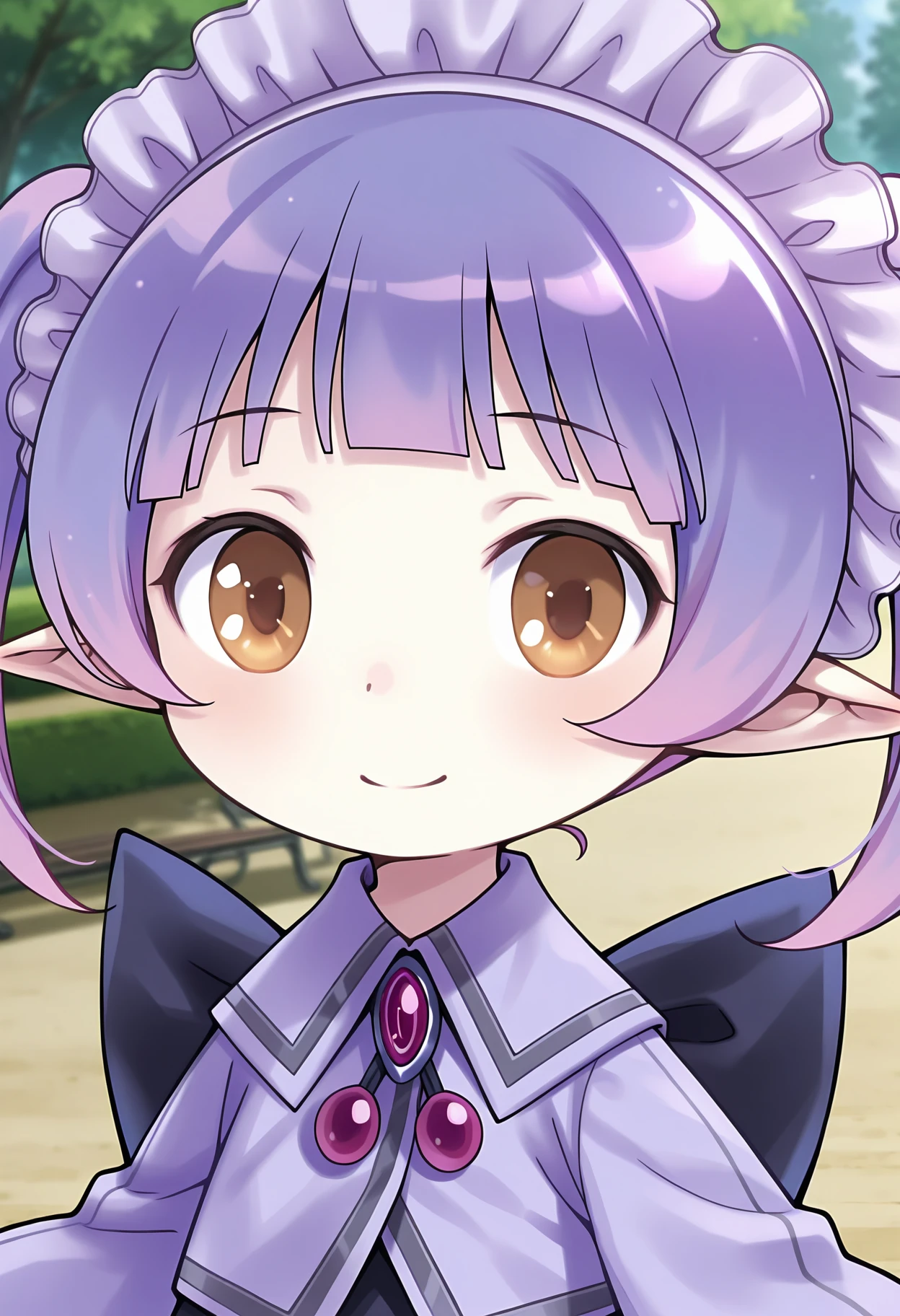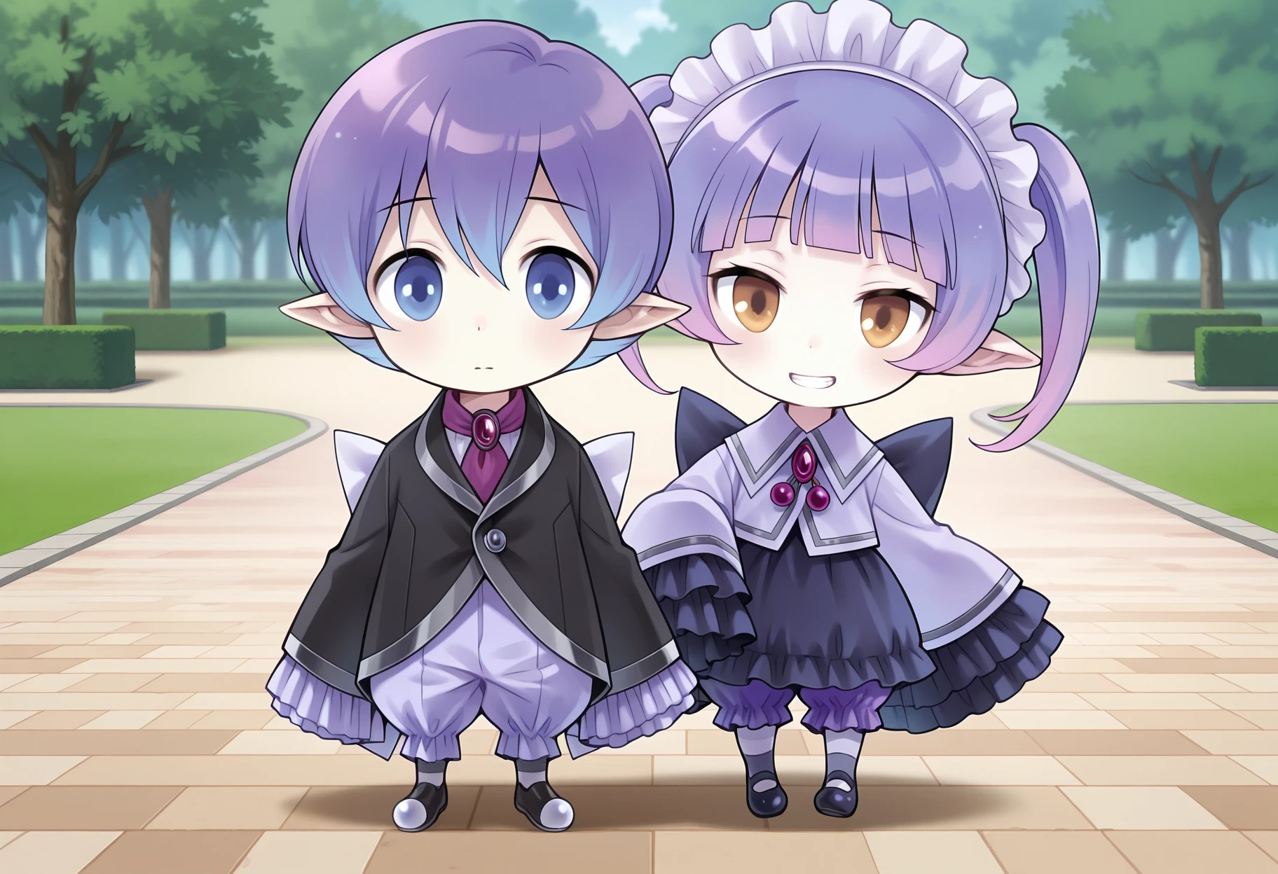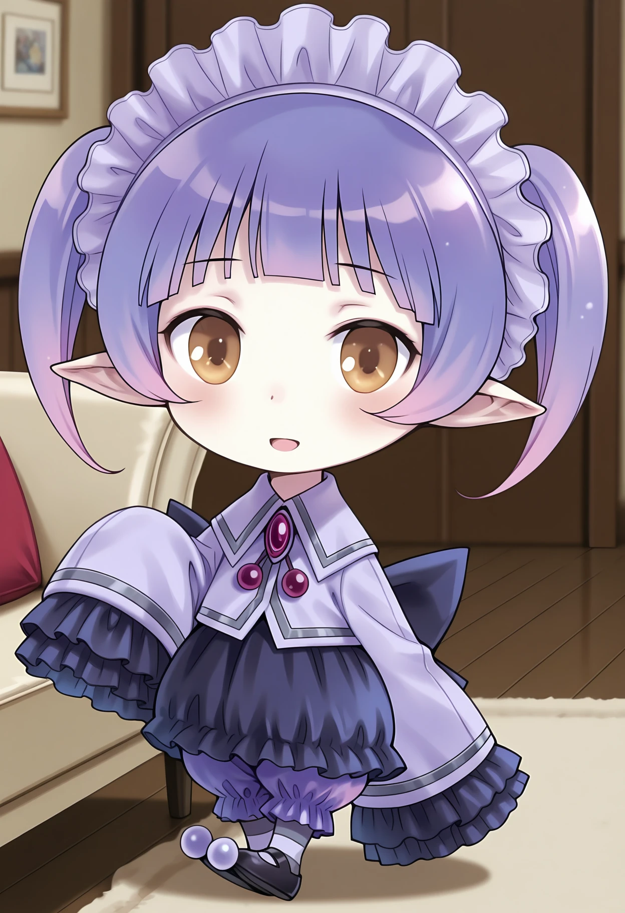 1girl, solo, chibi, twintails, brown eyes, purple hair, pointy ears,<lora:IllustriousXL Atelier Chim V2:1>