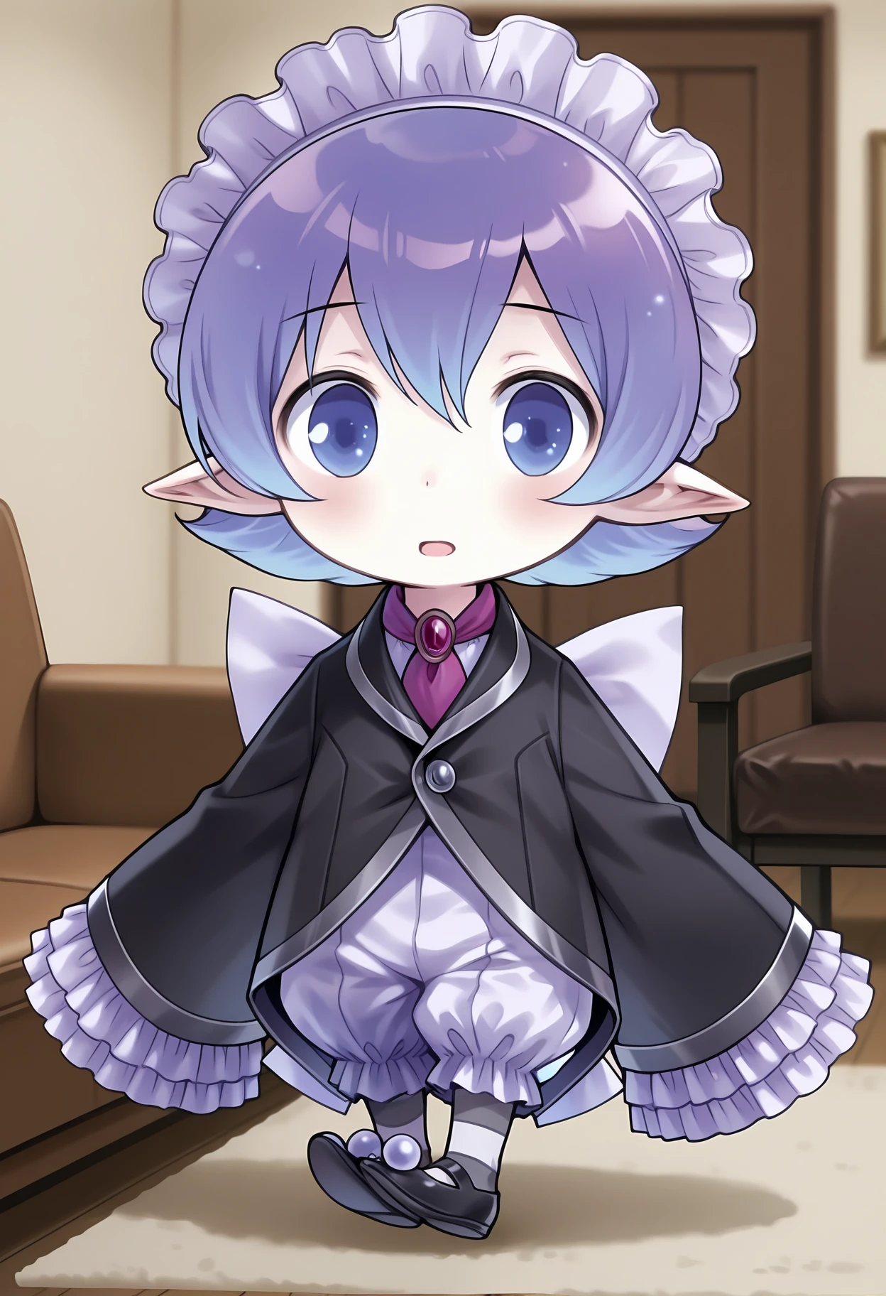 1boy, solo, chibi, short hair, blue eyes, purple hair, pointy ears,<lora:IllustriousXL Atelier Chim V2:1>