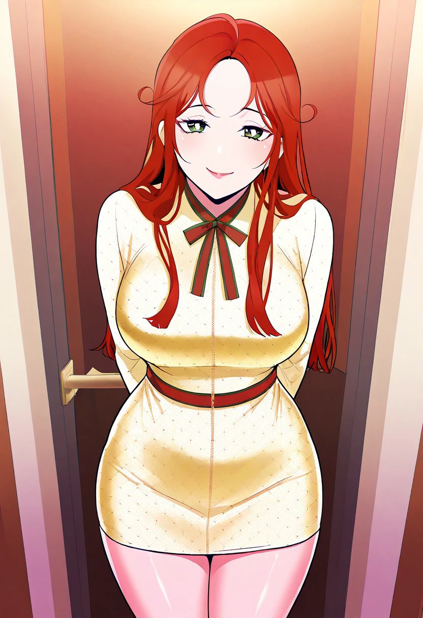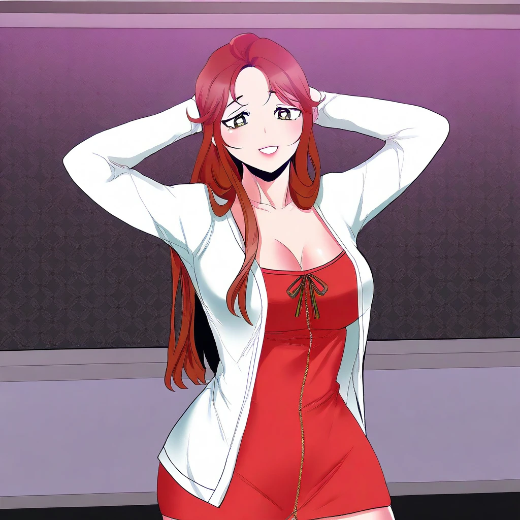1. ((beautiful long-sleeves white cardigan, beautiful red dress, huge cleavage, obscene cleavage, )) + black sandal, grey panties,