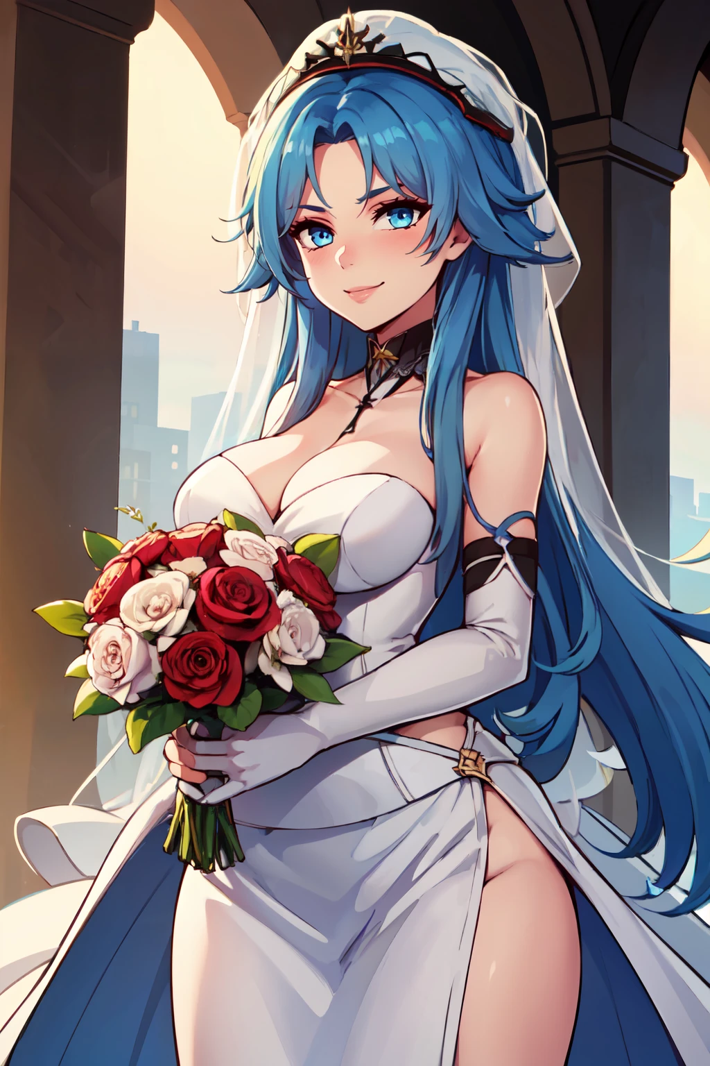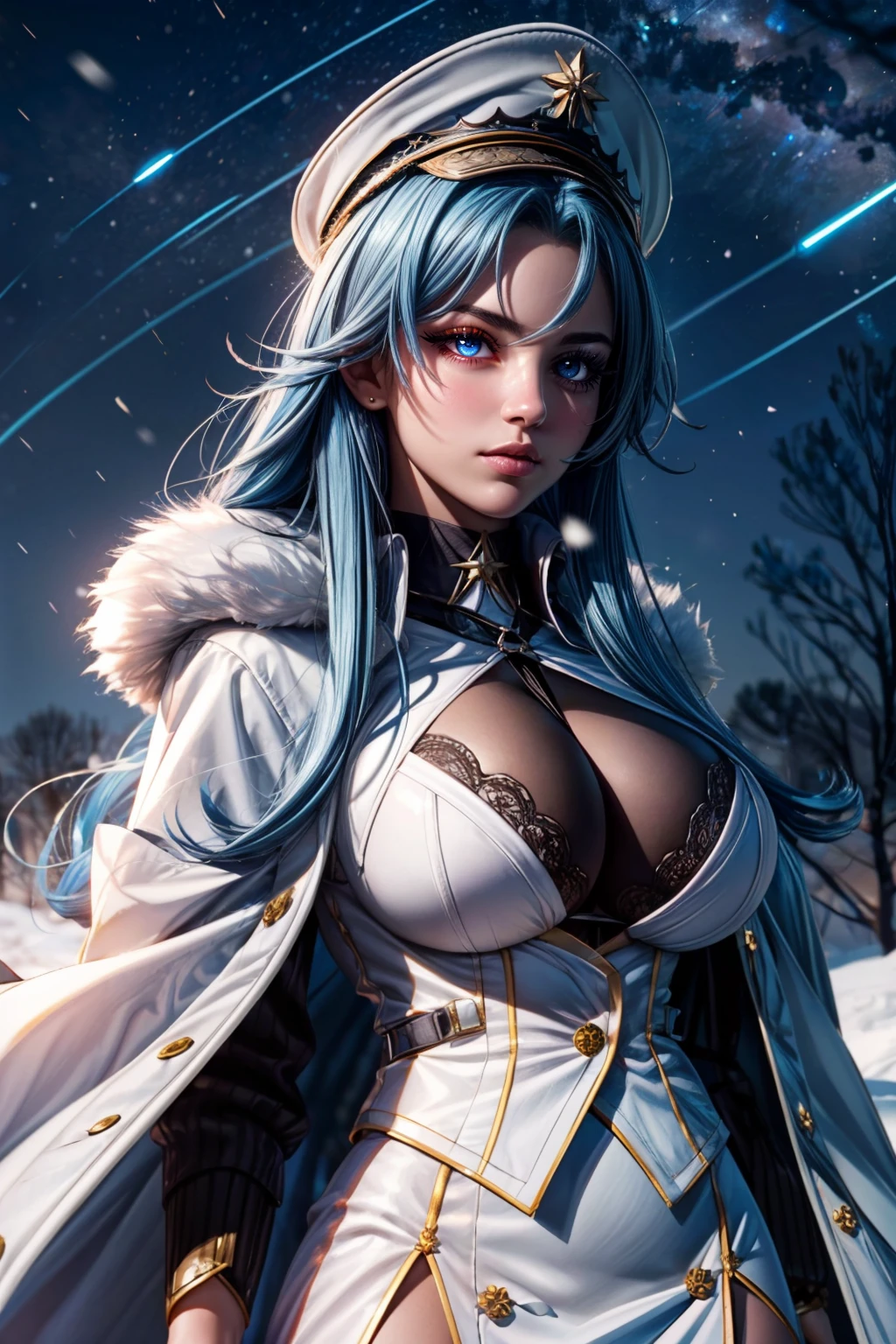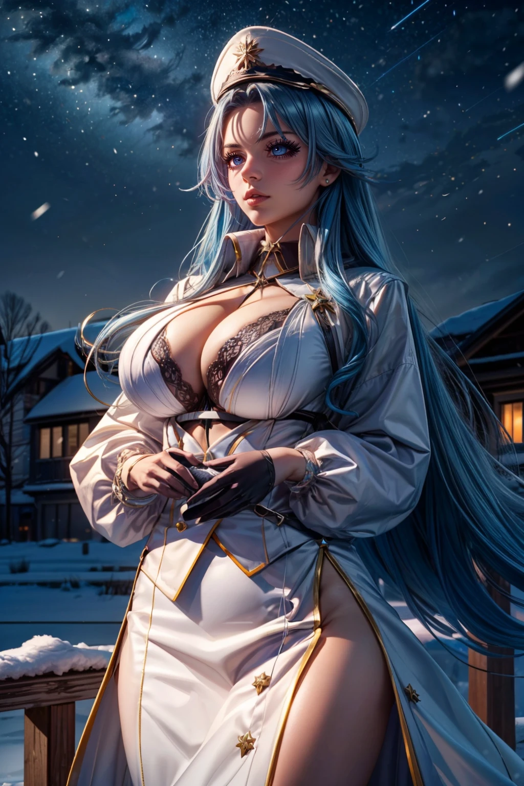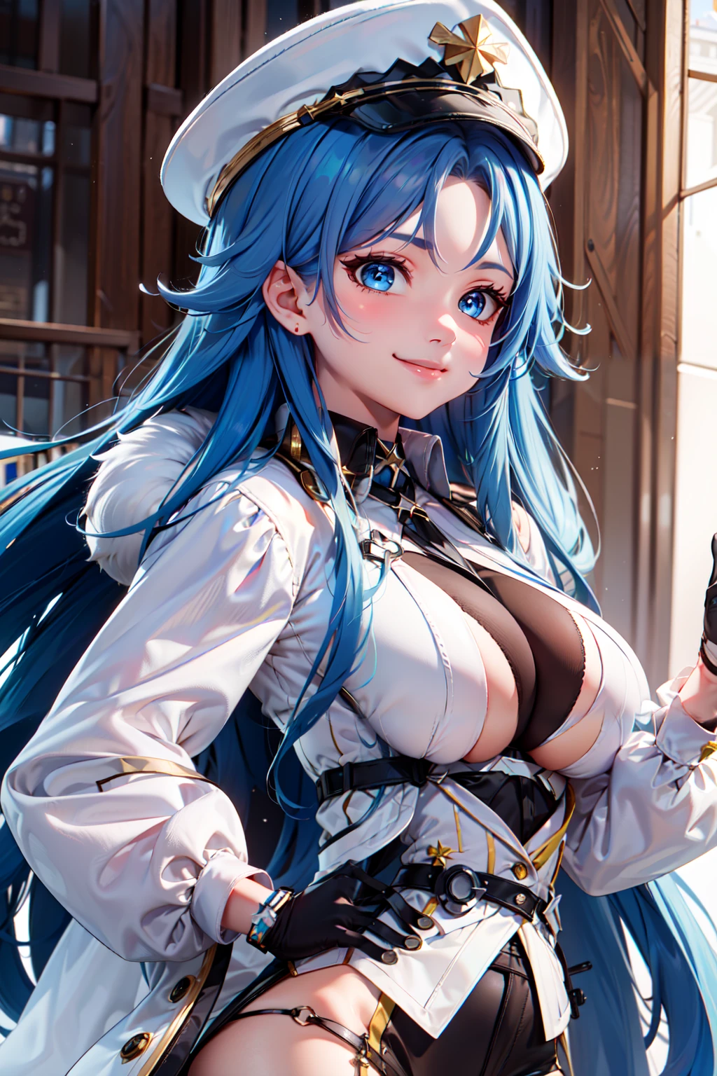 zzBelorussiya, blue hair, long hair, blue eyes, very long hair, bangs, parted bangs, hat, white headwear, bare shoulders, white coat, peaked cap, black gloves, fur-trimmed coat, long sleeves