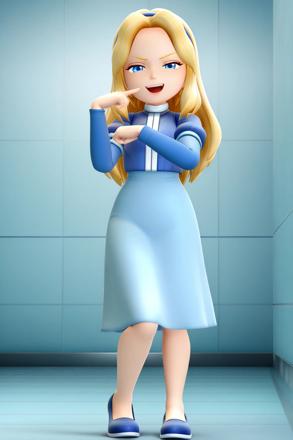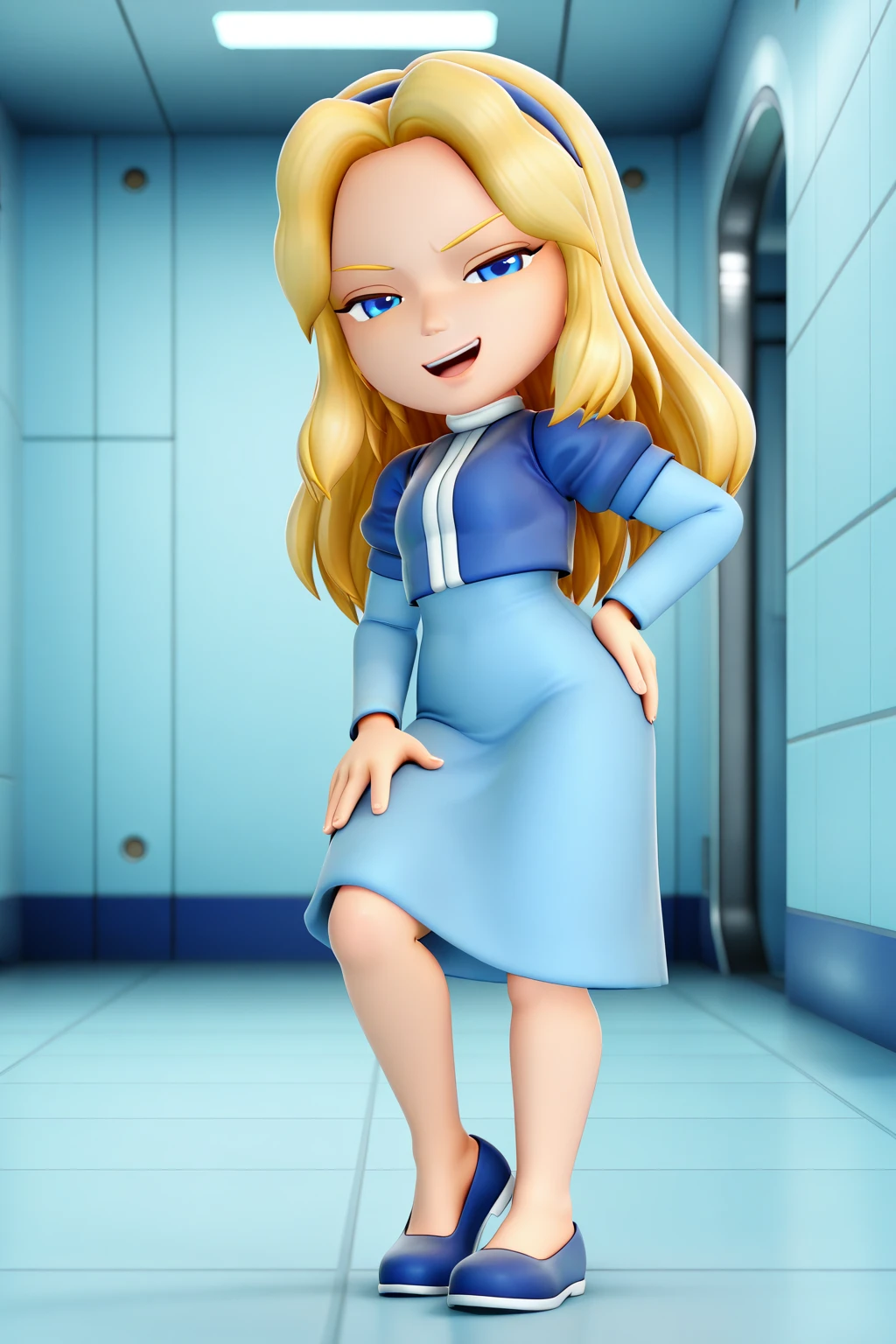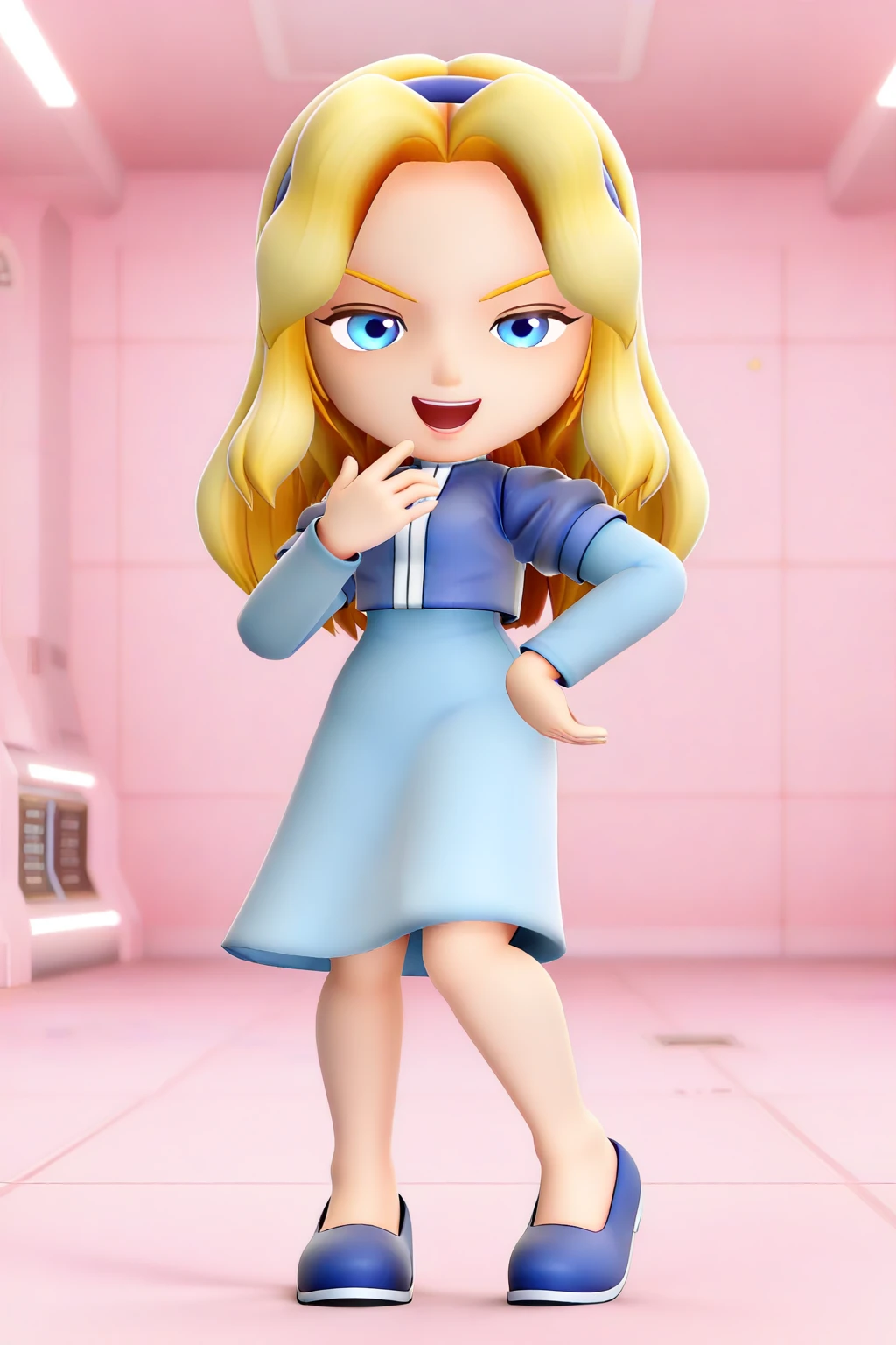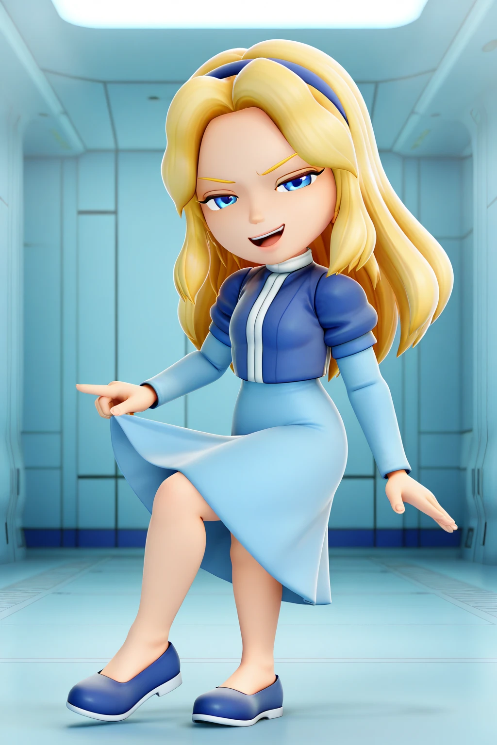 1girl, 3d, chibi, full body, solo, masterpiece, highly detailed, exquisite detail, high definition, best quality, ultra highres, MariaSS, fair skin, blonde hair, long hair, blue headband, azure eyes, mist blue long-sleeve dress, darker blue bodice with white vertical stripe, high collar, knee-length skirt, blue loafers, cute, smirked face