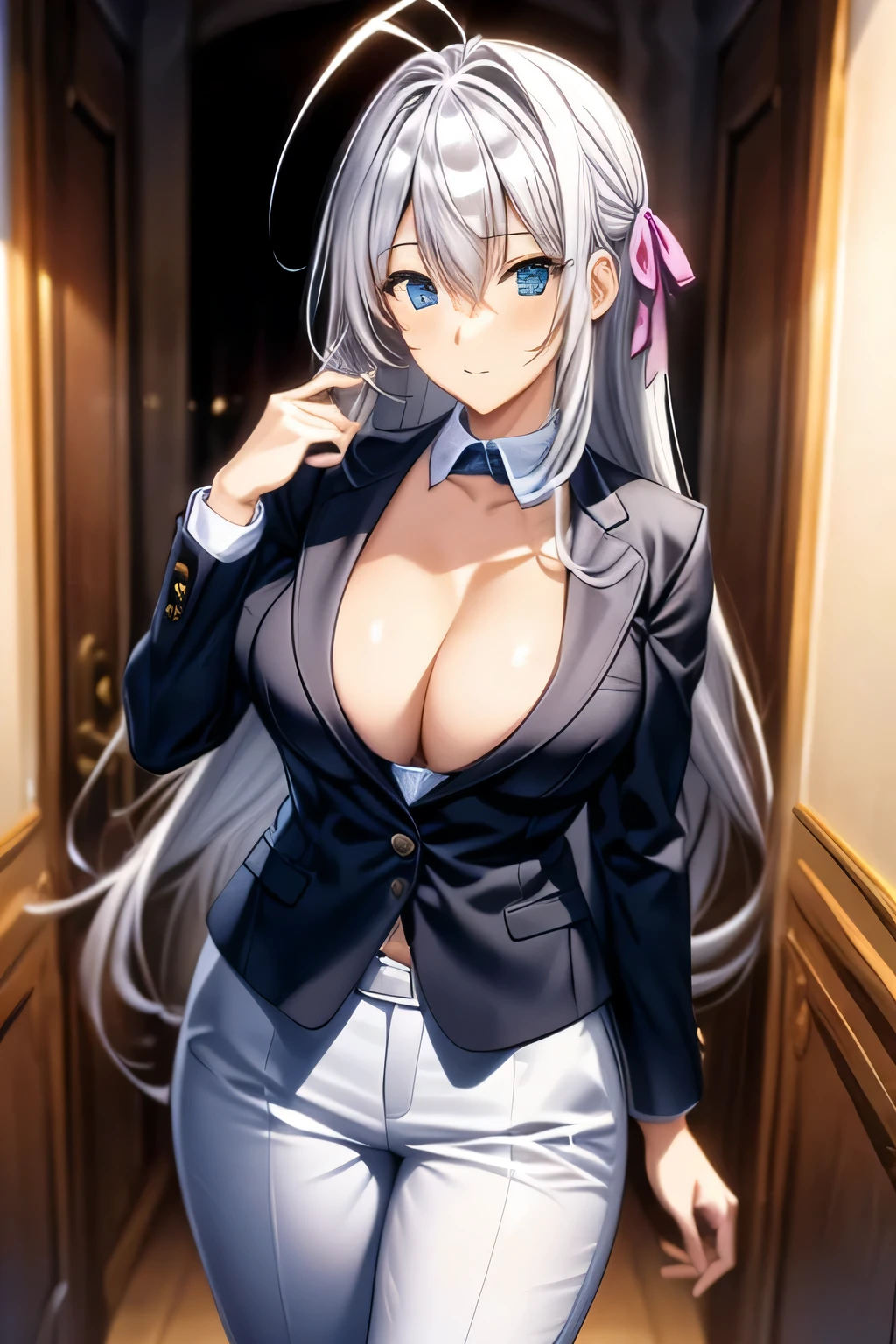 weisse_a, hair ribbon, antenna hair, straight long hair, silver hair with a slight blue tinge,
