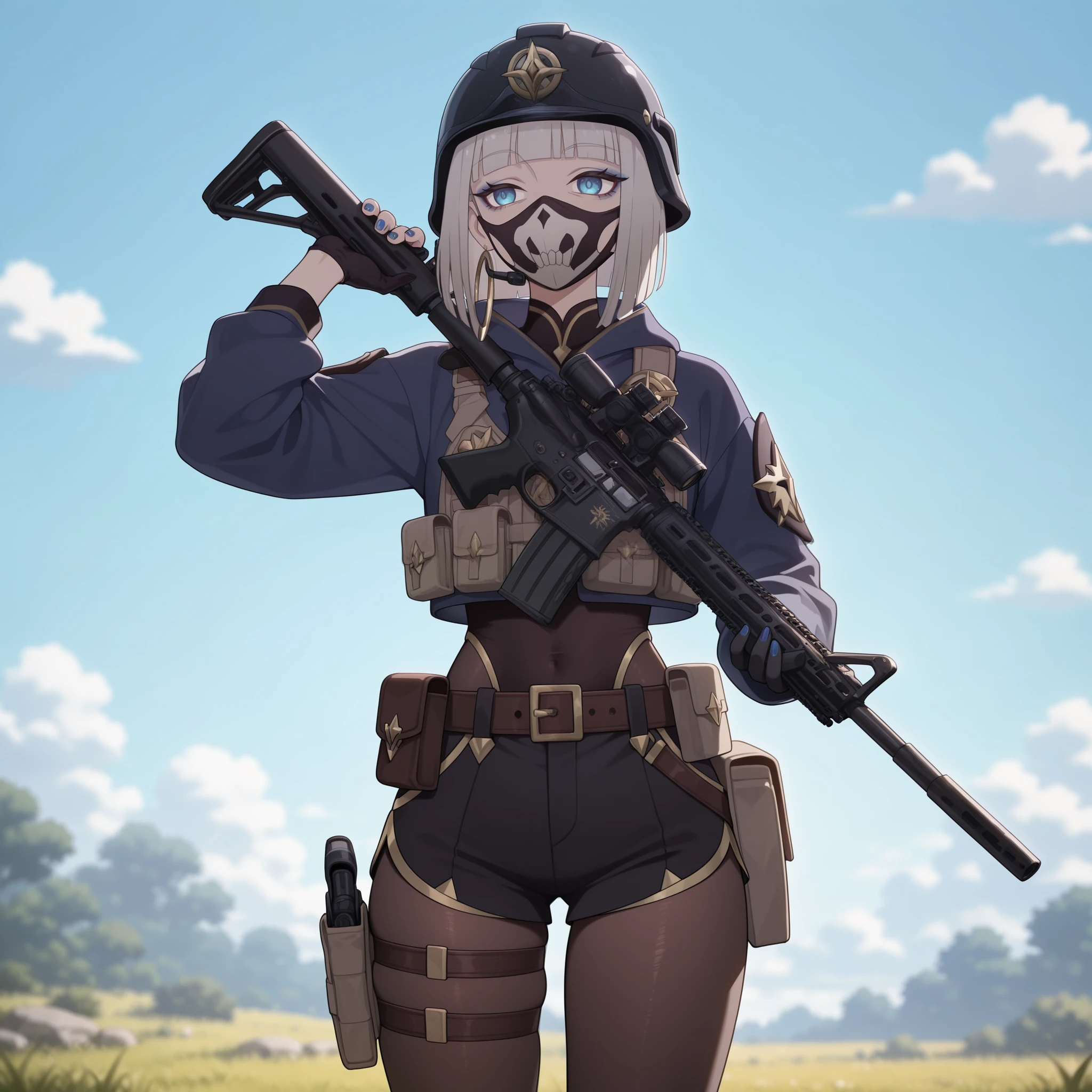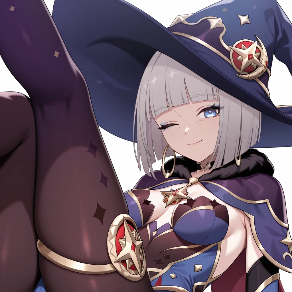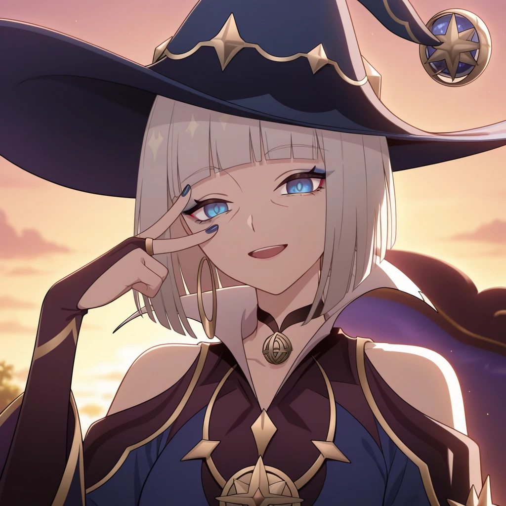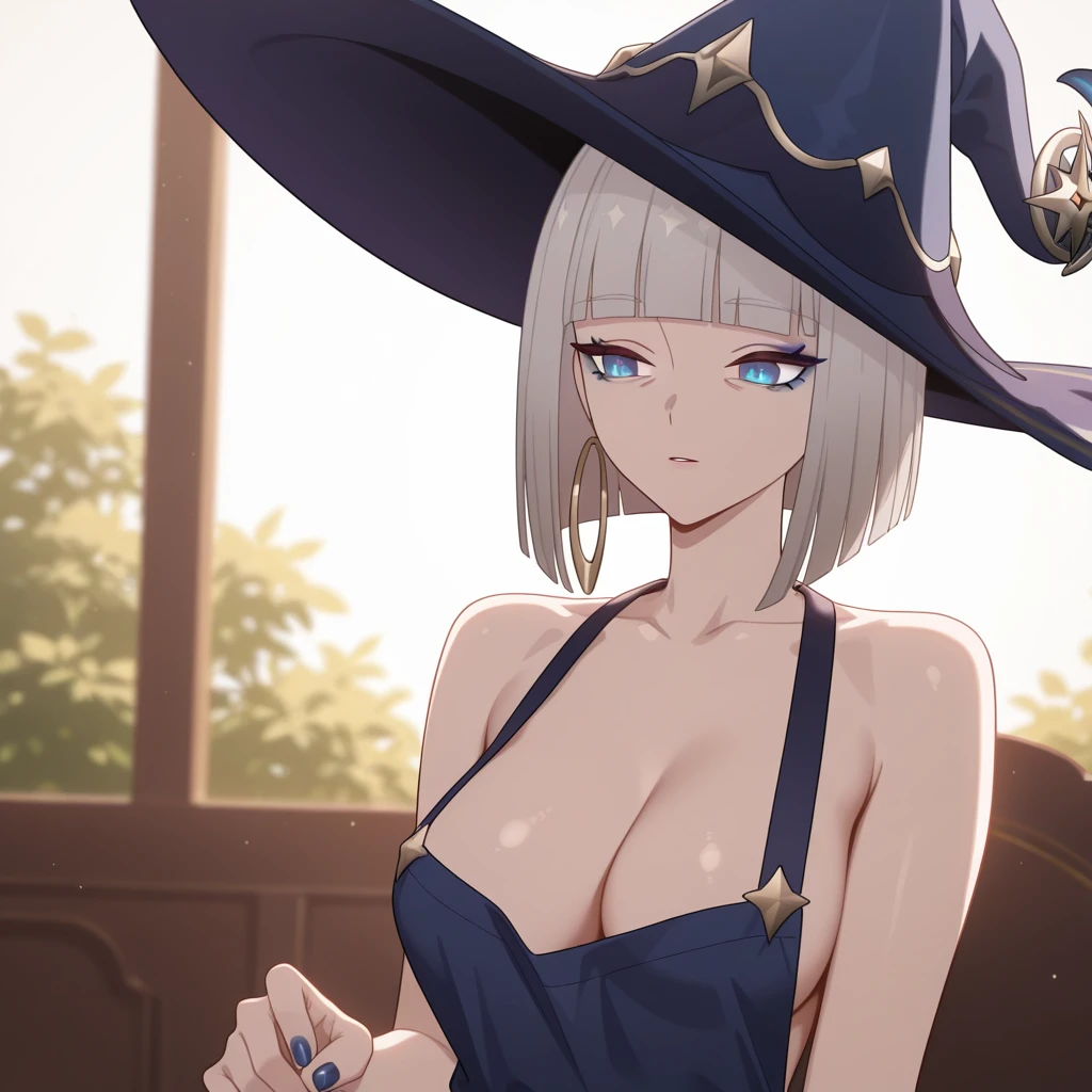 Appearance: 1girl, mature female, blue eyes, makeup, eyeliner, blue eyeshadow, nail polish, blue nails, jewelry, hoop earrings, short hair, grey hair, bob cut, blunt bangs, blunt ends