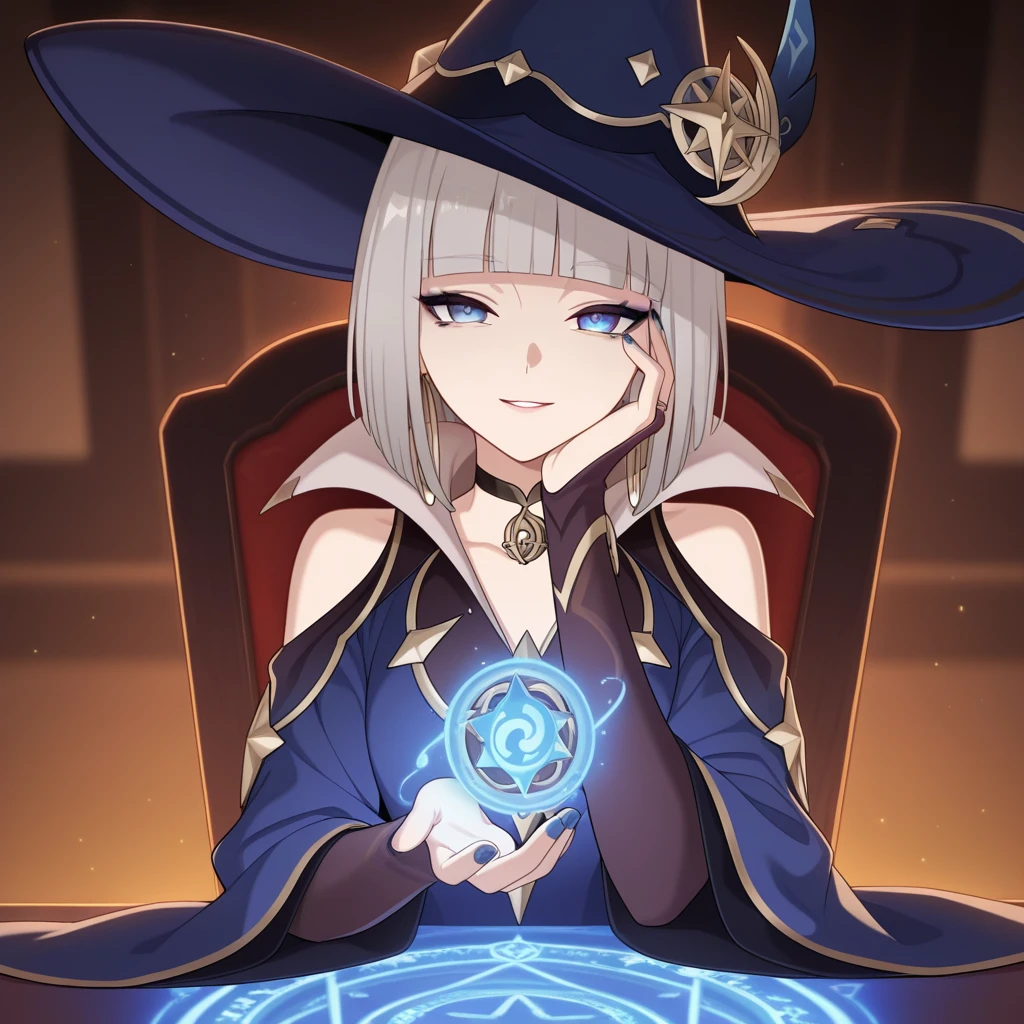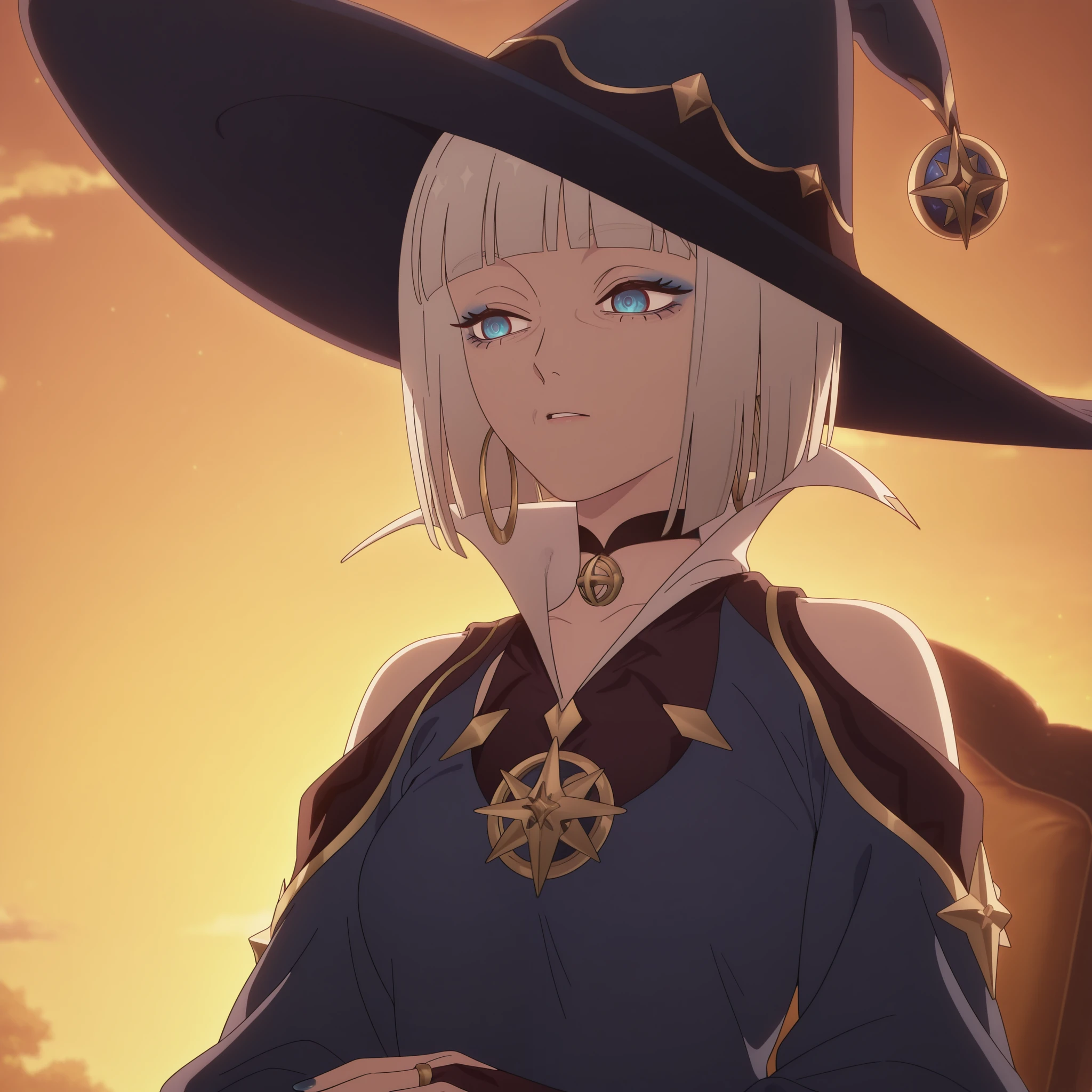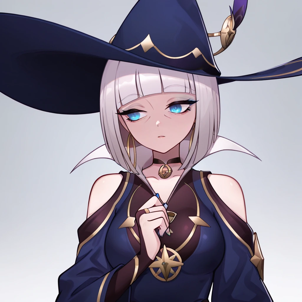 Clothing: witch hat, blue headwear, star ornament, pendant choker, black choker, bridal gauntlets, blue dress, popped collar, shoulder cutout, bare shoulders, wide sleeves, long sleeves
