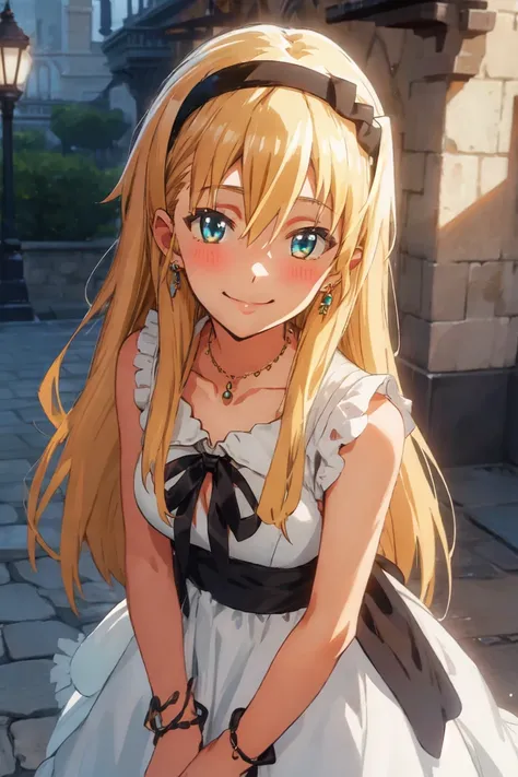 dress, jewelry, hairband, sleeveless, necklace, white dress, black hairband, ribbon