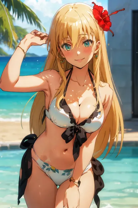 hair ornament, cleavage, jewelry, swimsuit, flower, bikini, earrings, hair flower, white bikini, front-tie top, hibiscus, blush, smile, large breasts, collarbone, side-tie bikini bottom, white bikini