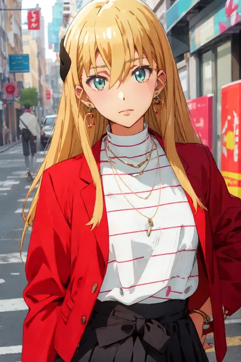 bangs, skirt, shirt, long sleeves, jewelry, jacket, white shirt, earrings, striped, black skirt, necklace, bracelet, open jacket, casual, red jacket, high-waist skirt, striped shirt, medium skirt