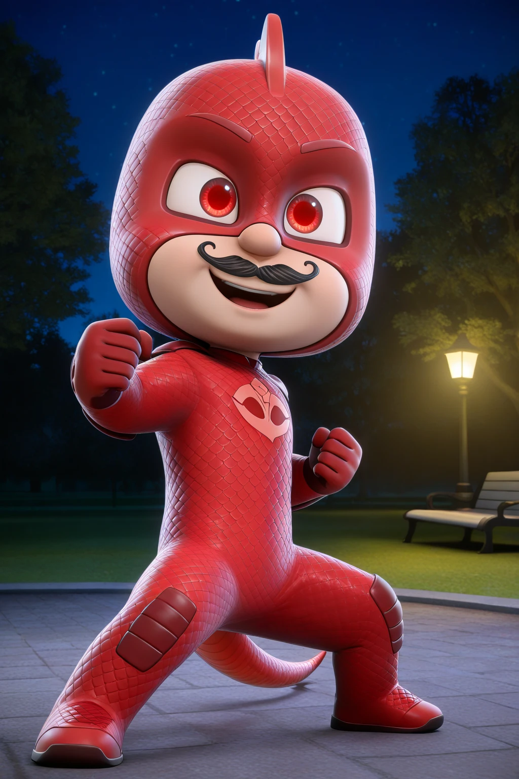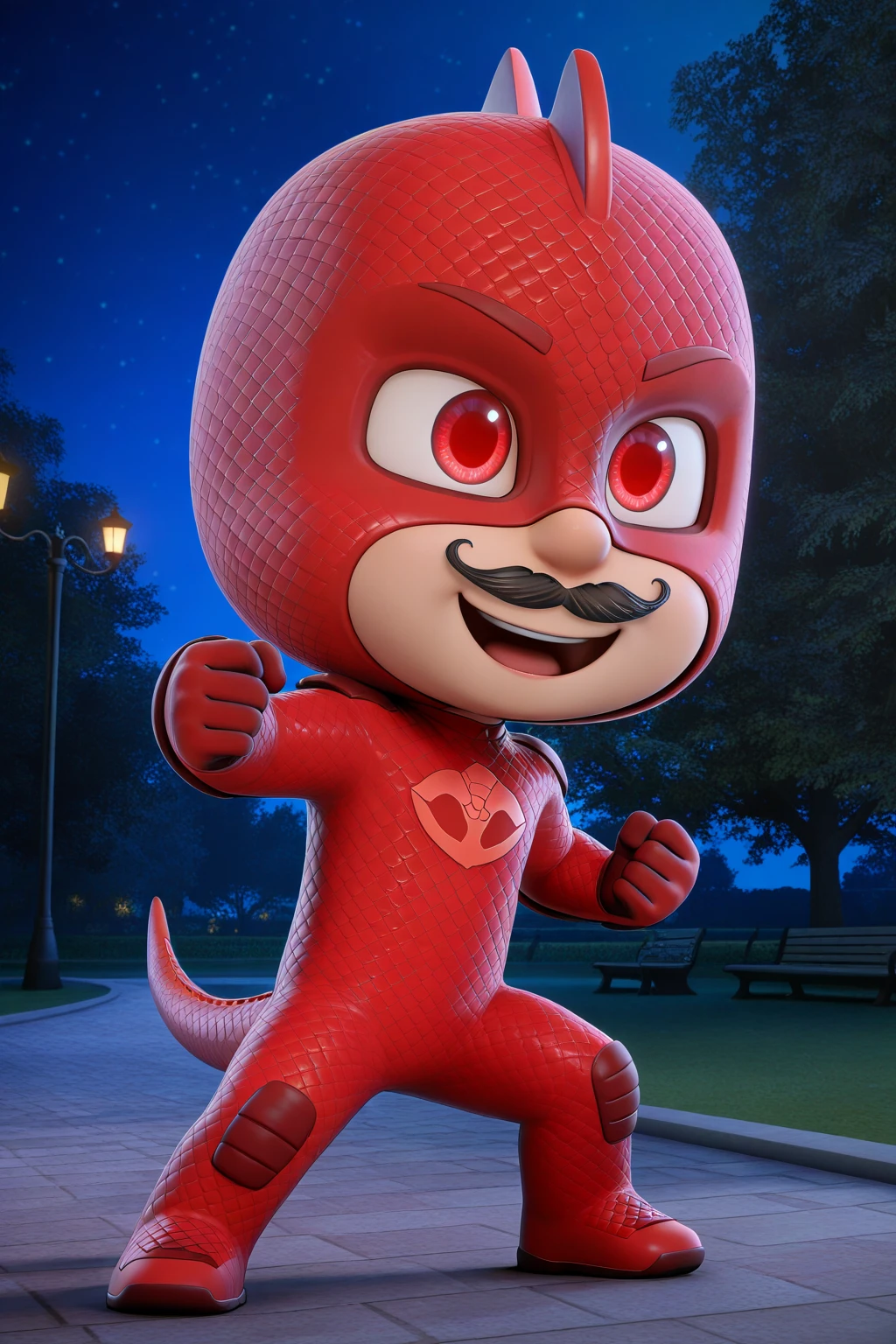 1boy, chibi, 3d, full body, solo, masterpiece, highly detailed, exquisite detail, high definition, best quality, ultra highres, LizardoEG, pale skin, red masks, masks, crest on his head, black mustache, red tail, crimson eyes, red , clean bodysuits, artificial scales, cute, mischievous face, night time, perfect lighting