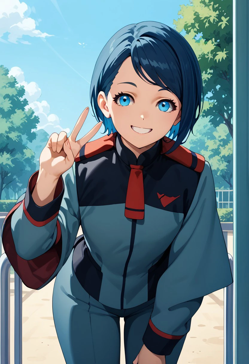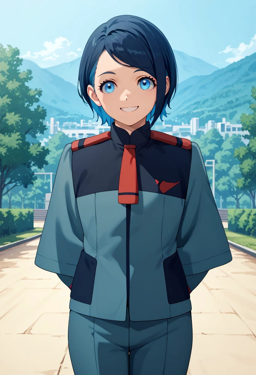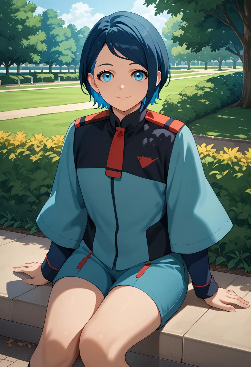 nika, blue eyes, multiple hair color, uniform, shorts,