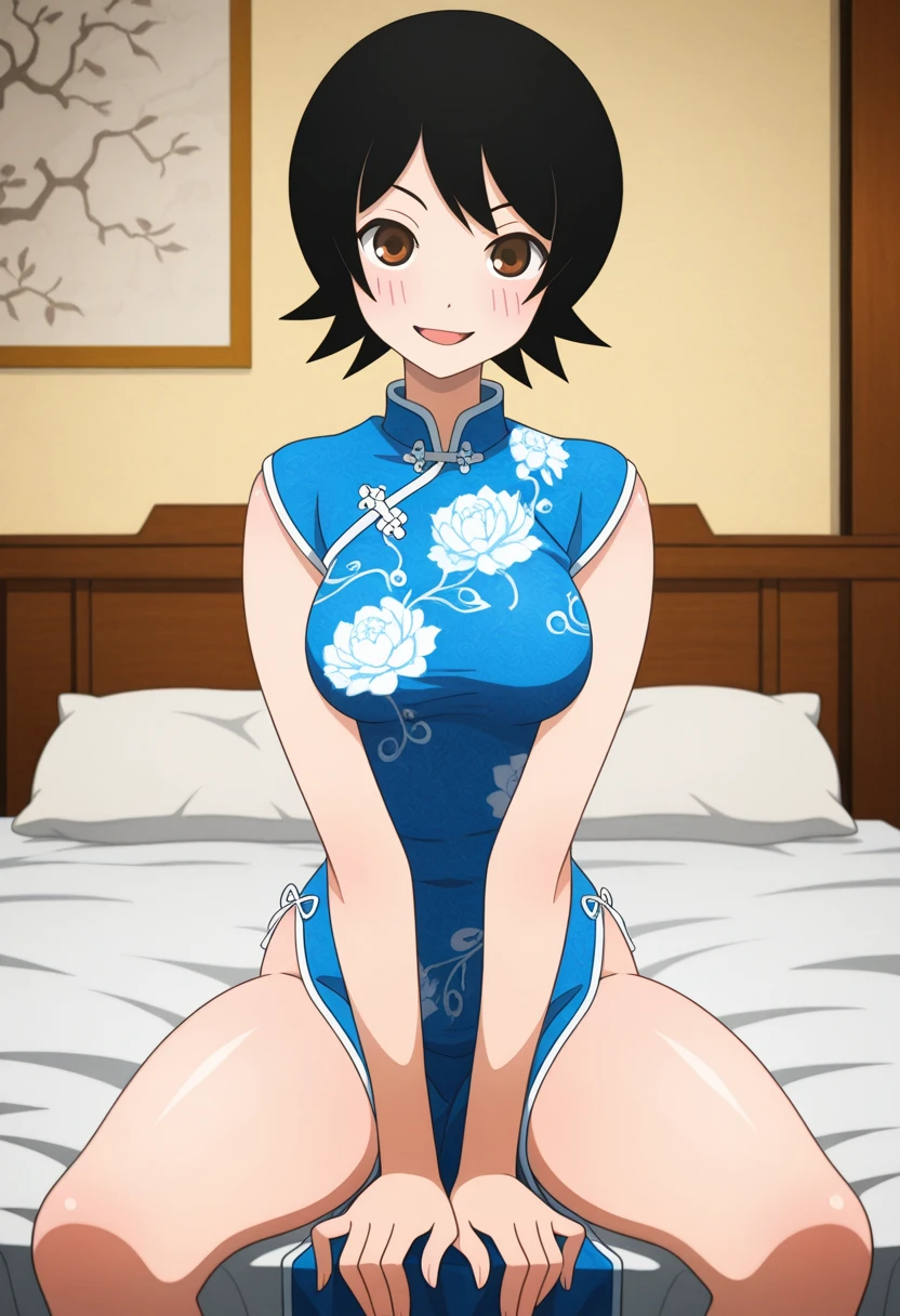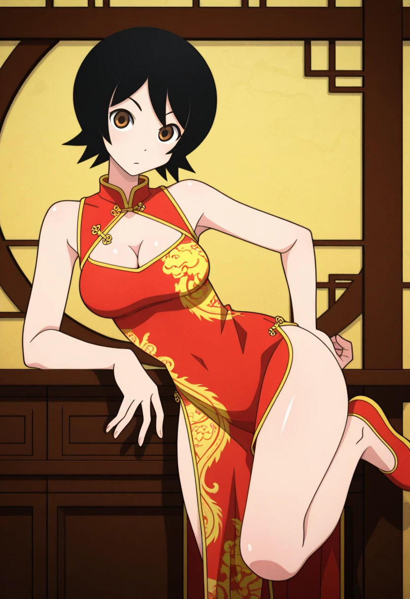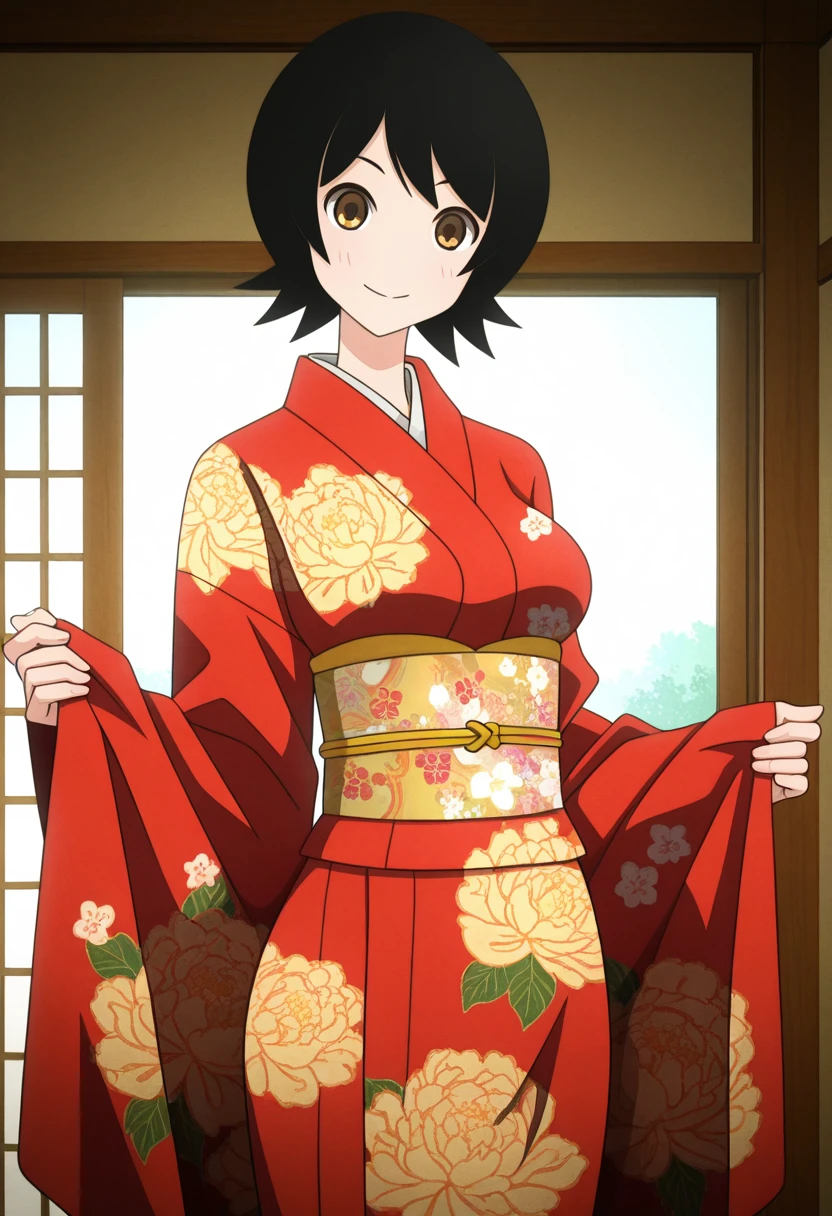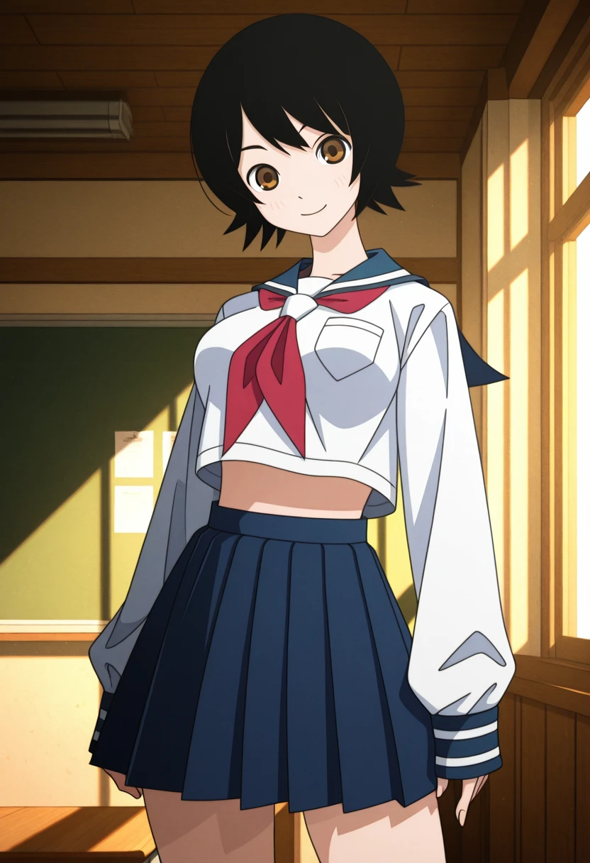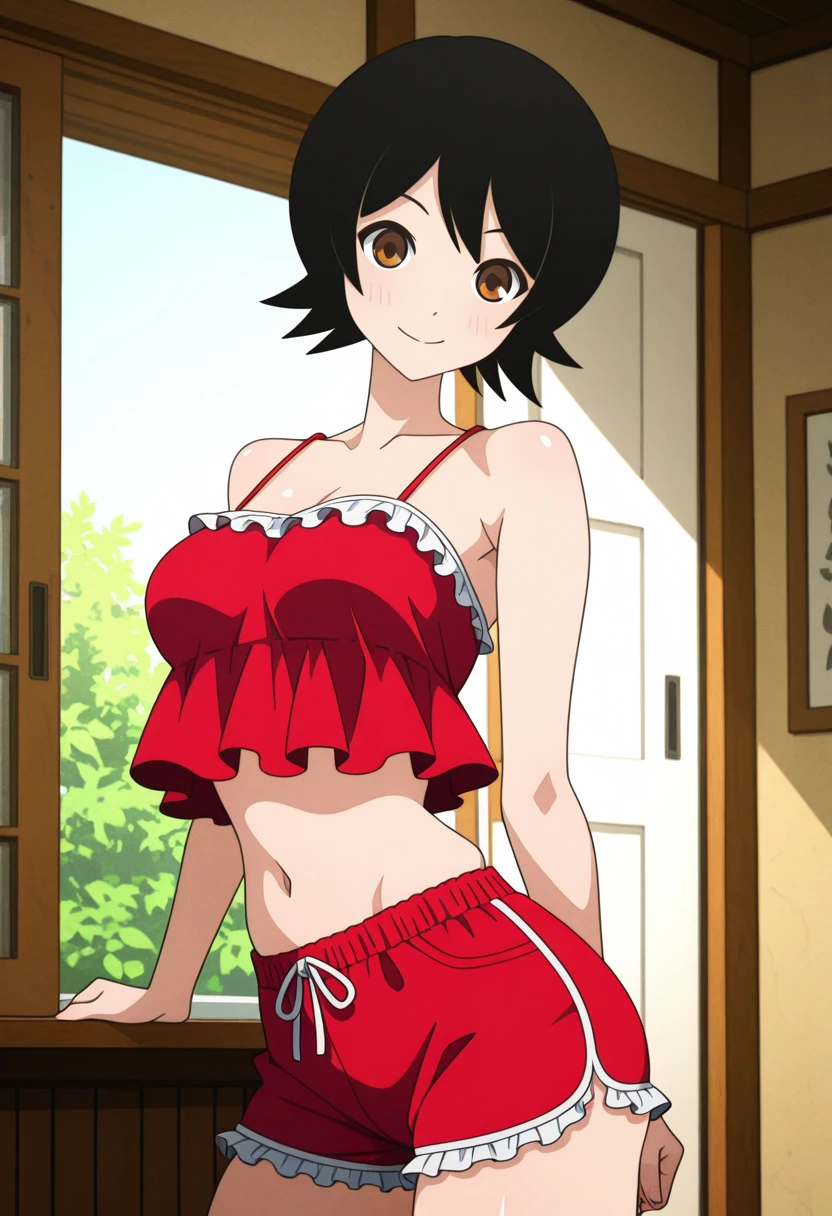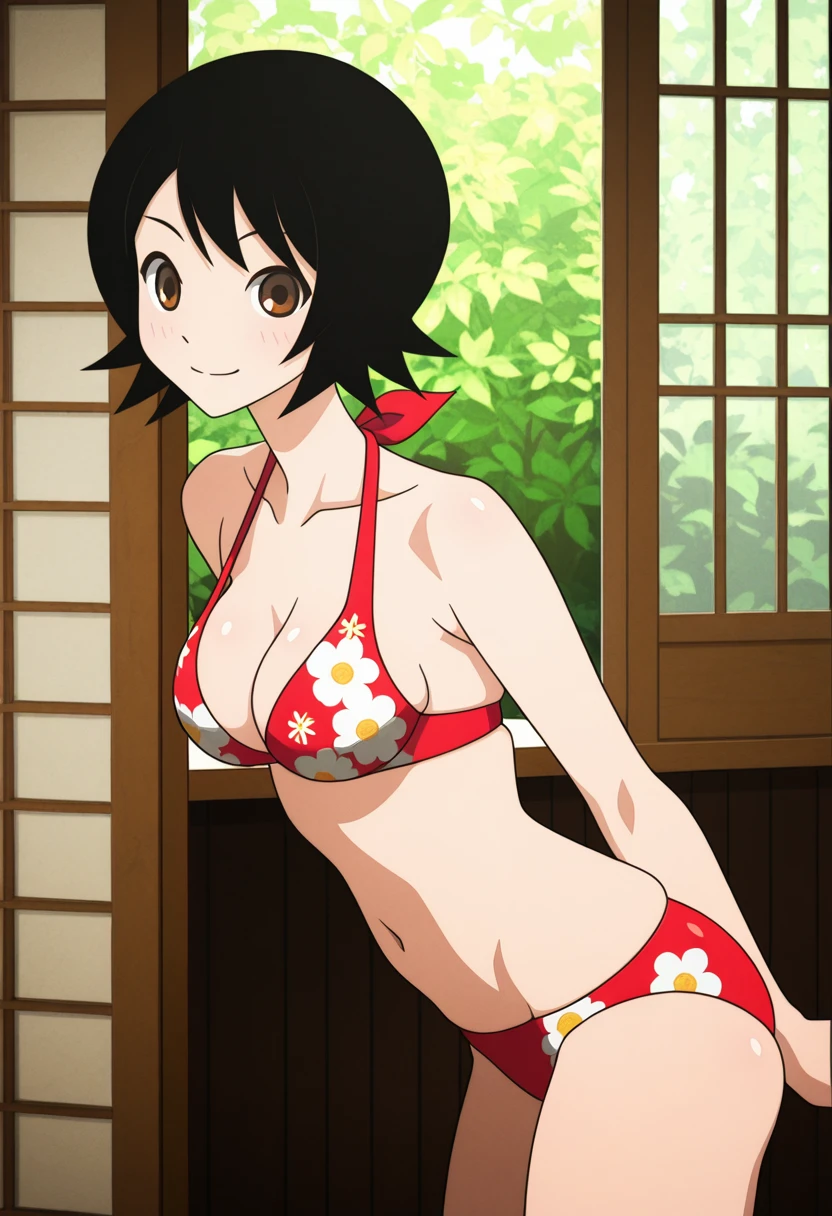 namiww, brown eyes, black hair, short hair, bangs, medium breasts,