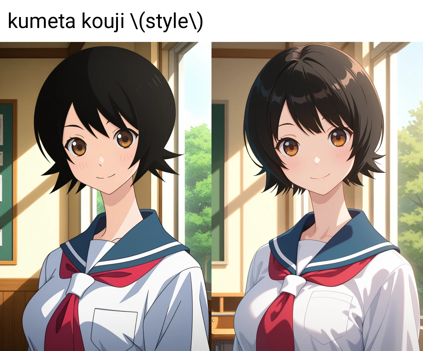 プロンプトに"kumeta kouji \(style\)"を追加する方が、再現度が高くなるようです。