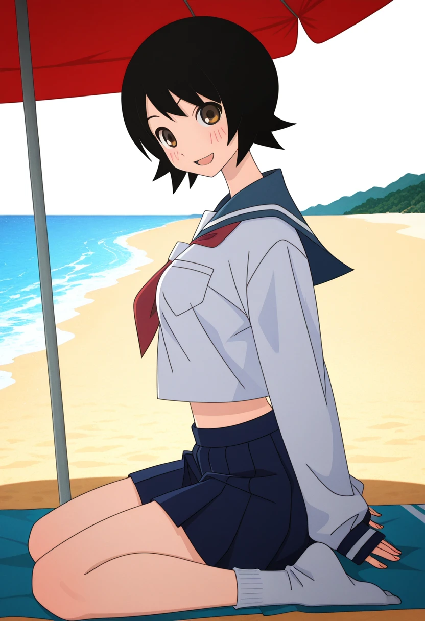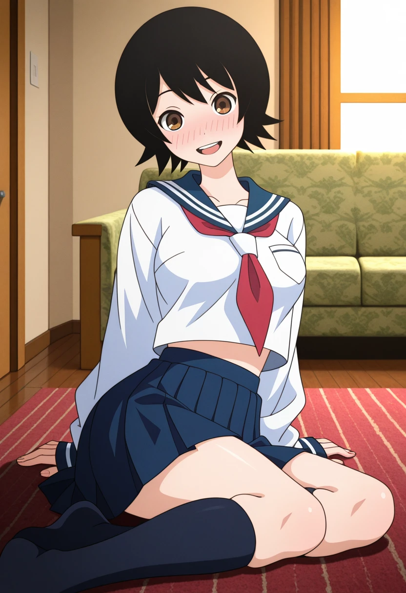 school uniform, serafuku, blue sailor collar, red neckerchief, long sleeves, sleeves past wrists, midriff, blue pleated skirt, socks, loafers,