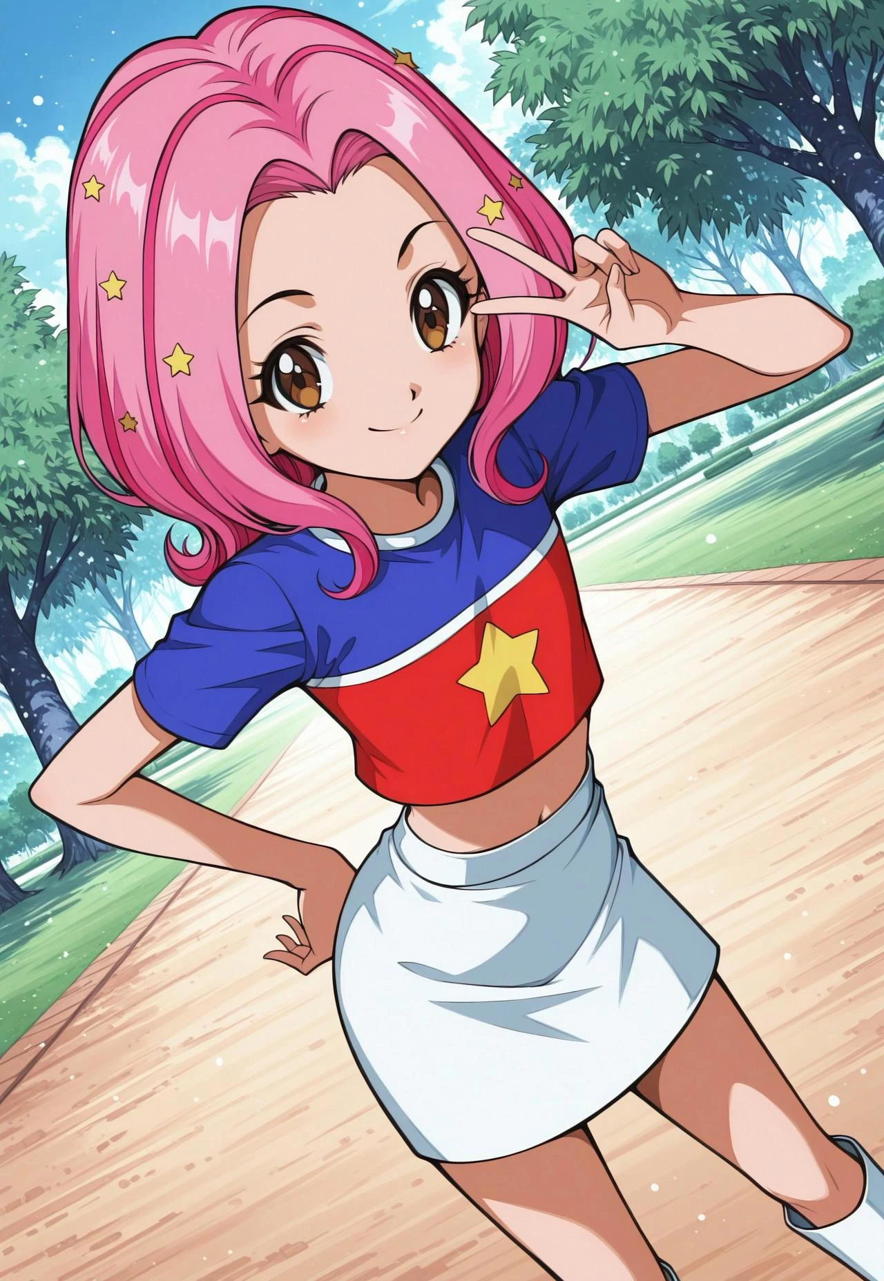 MimiDigi, 1girl, solo, pink hair, multicoloured hair, star hair ornament, brown eyes, croptop, plain white skirt, white knee boots