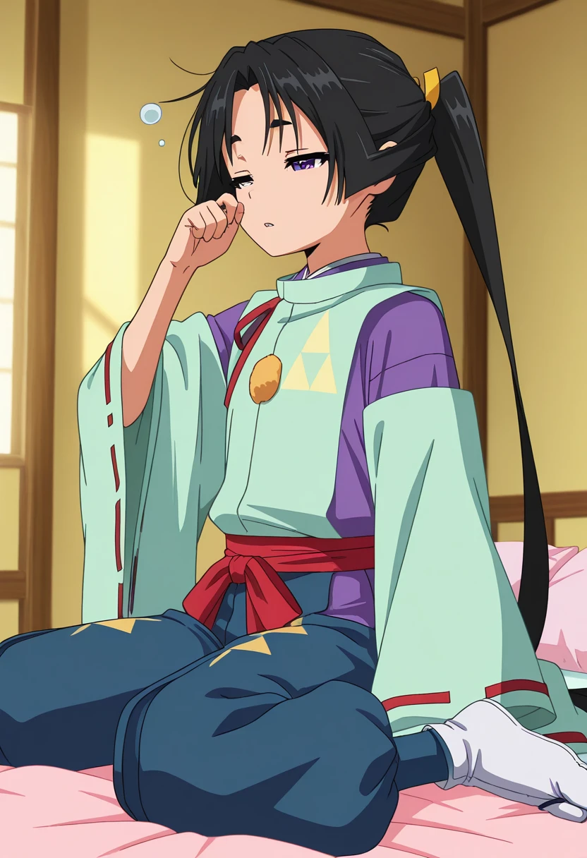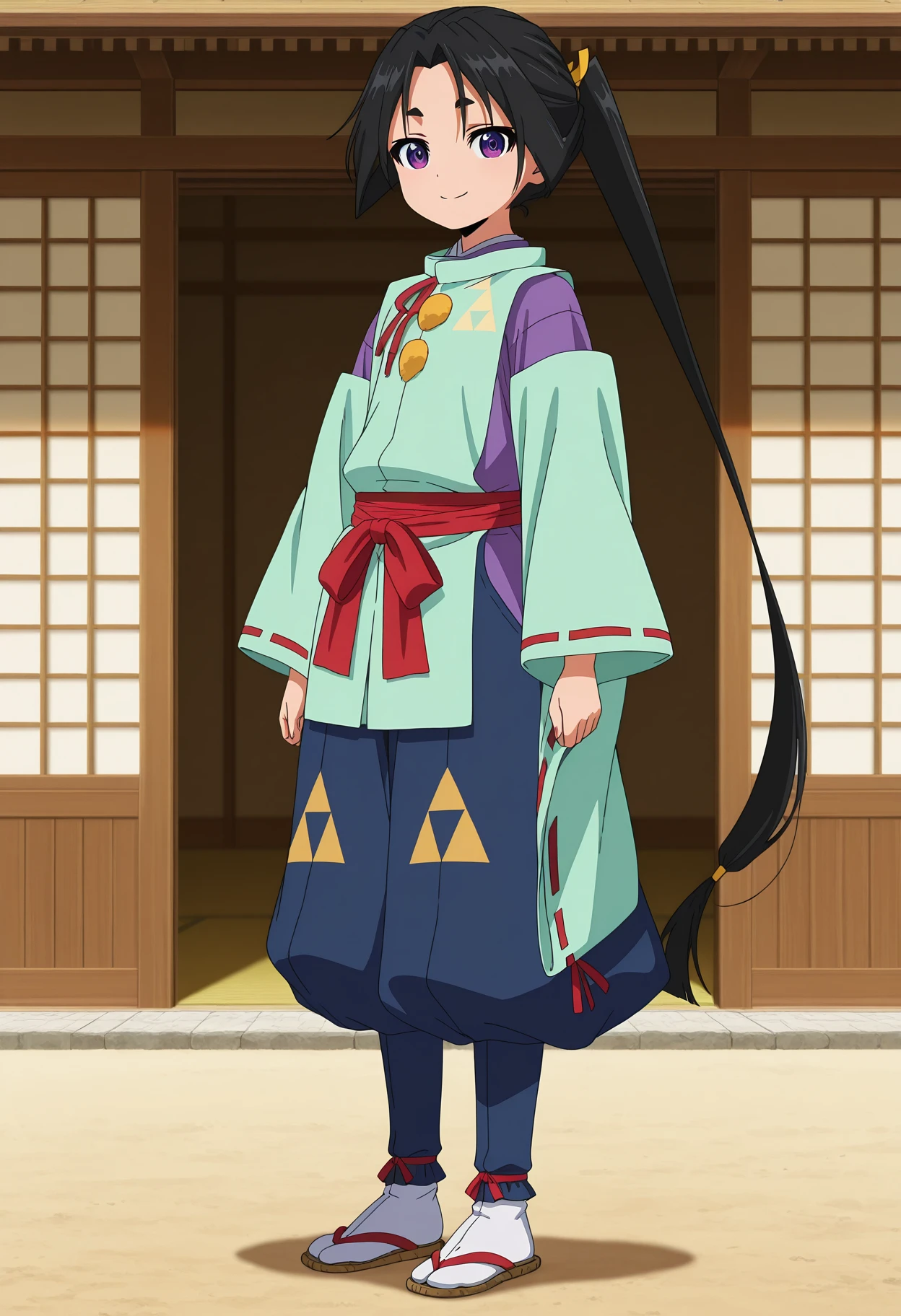 - kariginu, red ribbon, light green kimono, purple kimono, detached sleeves, wide sleeves, ribbon-trimmed sleeves, red sash, blue pants, puffy pants, tabi, zouri,