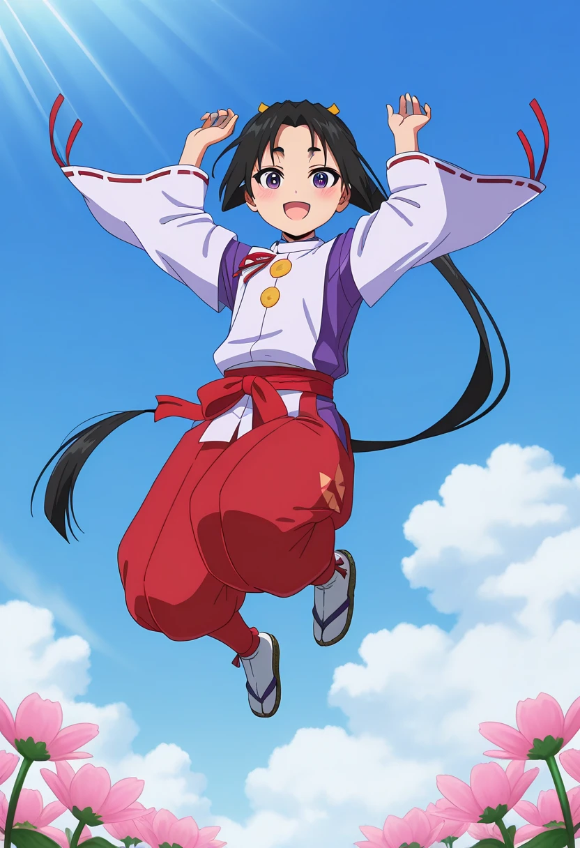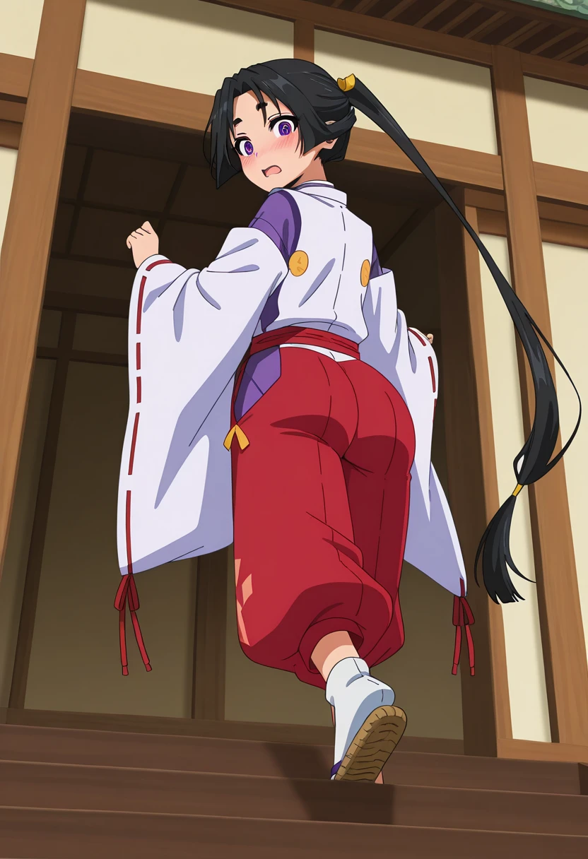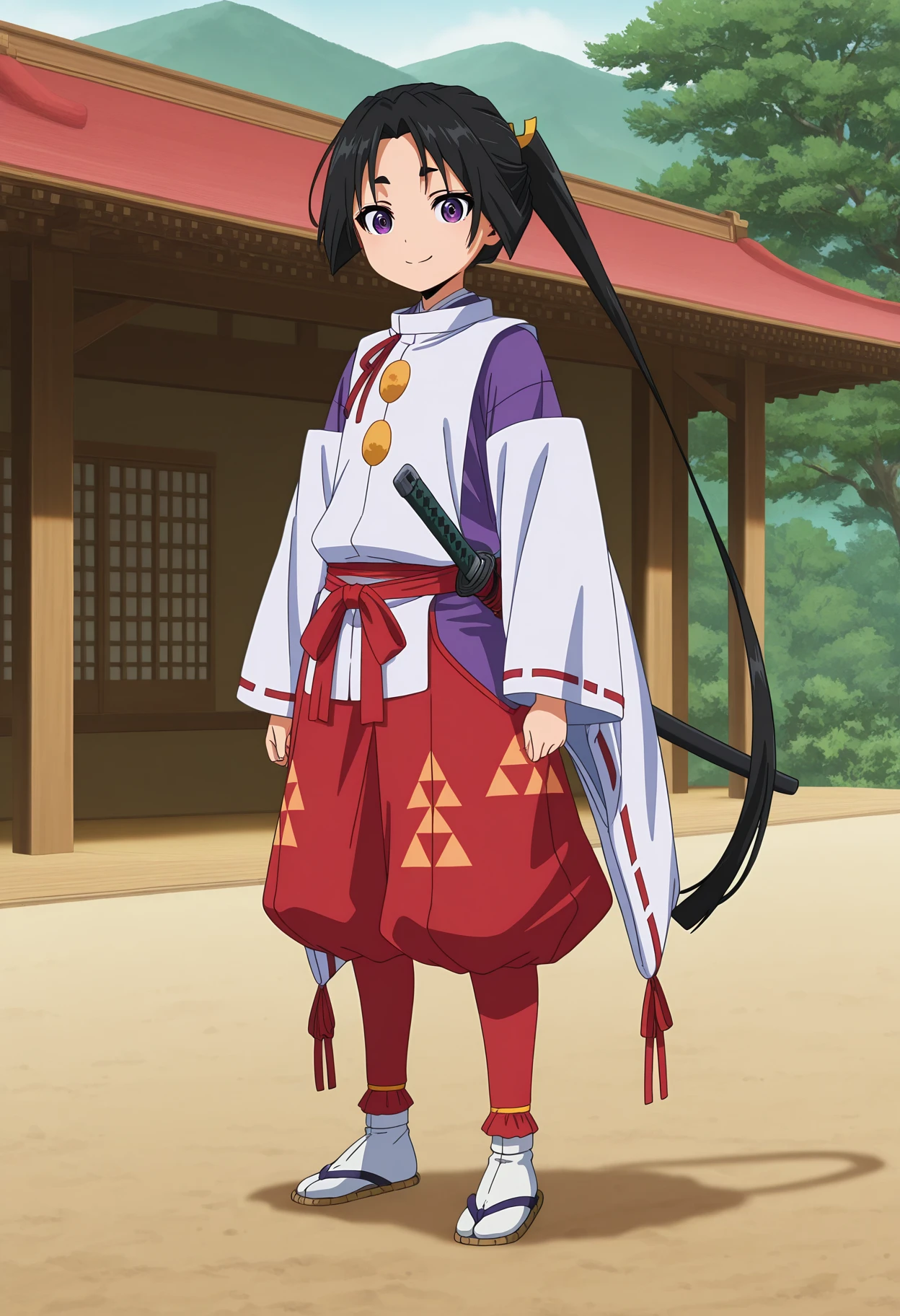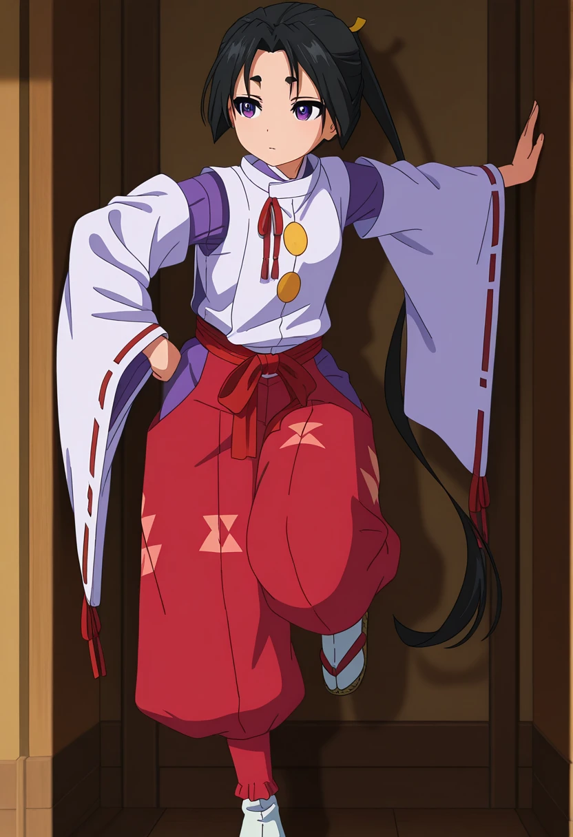 - kariginu, red ribbon, white kimono, purple kimono, detached sleeves, wide sleeves, ribbon-trimmed sleeves, red sash, red pants, puffy pants, hip vent, tabi, zouri,