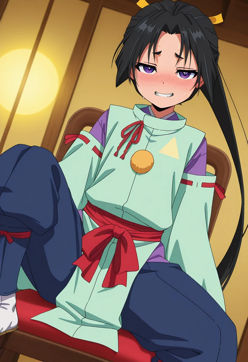 1boy, tokiyukiww, purple eyes, thick eyebrows, short eyebrows, black hair, very long hair, parted bangs, ponytail, hair ribbon, yellow ribbon,