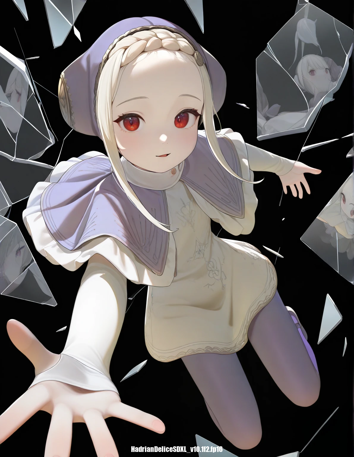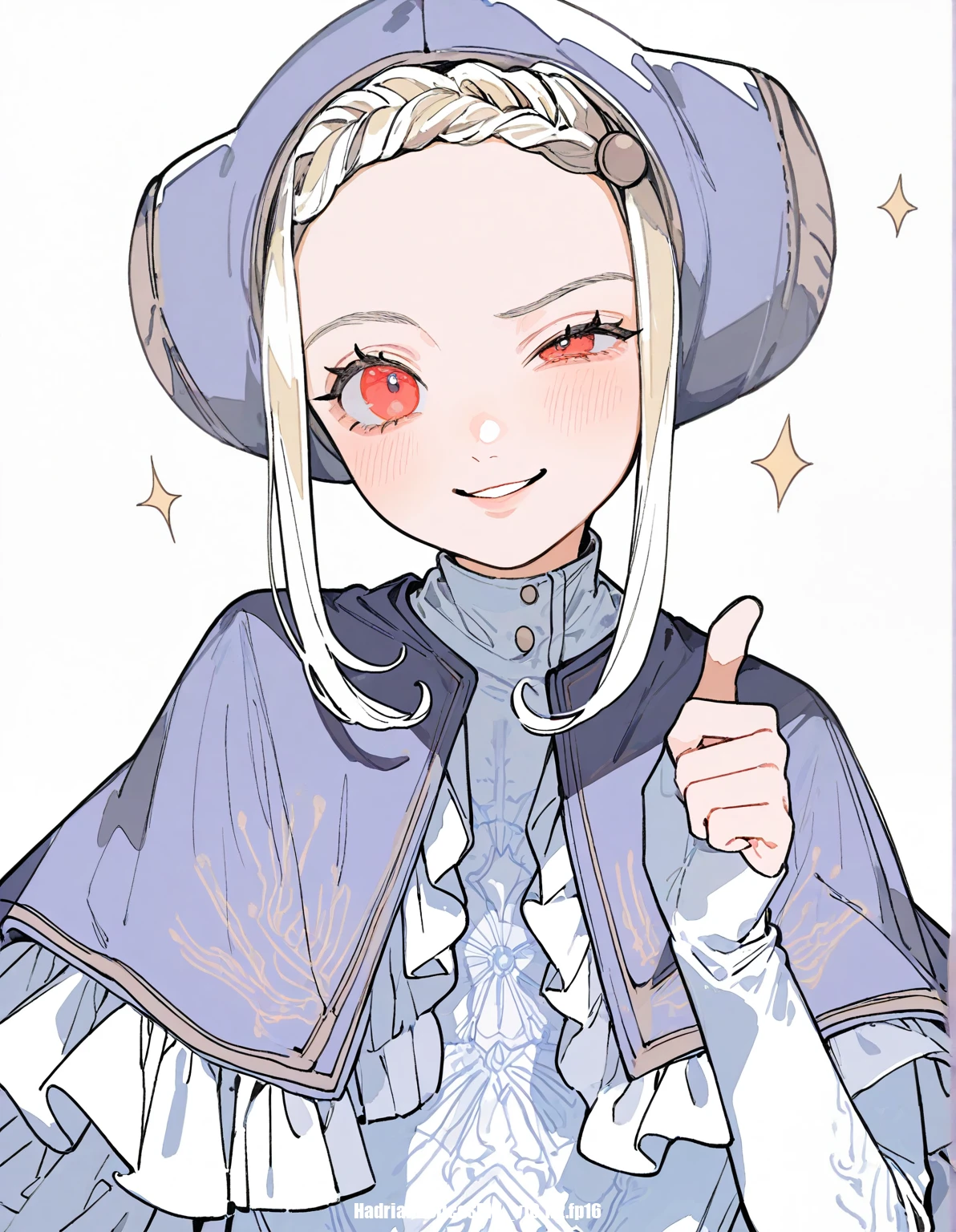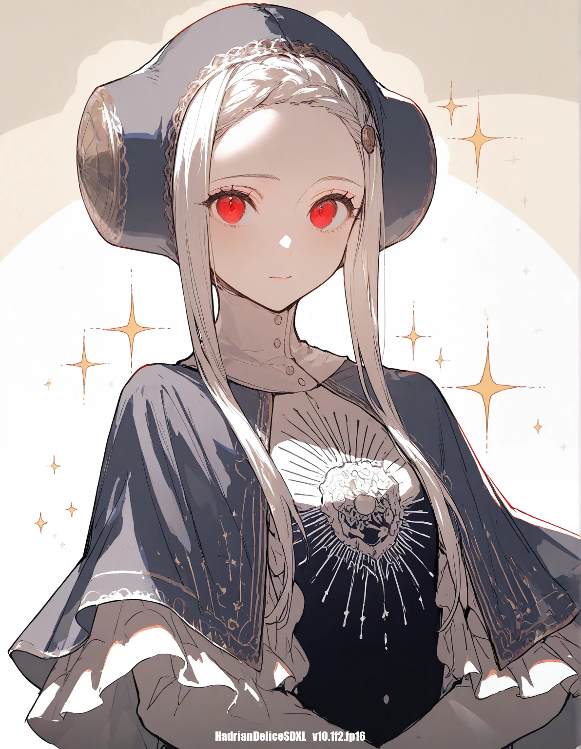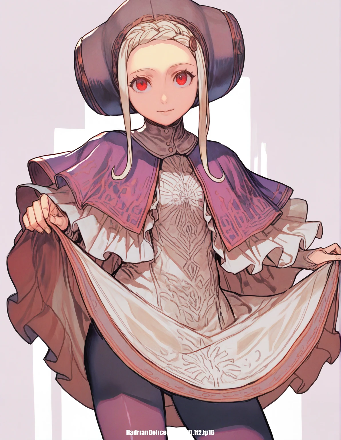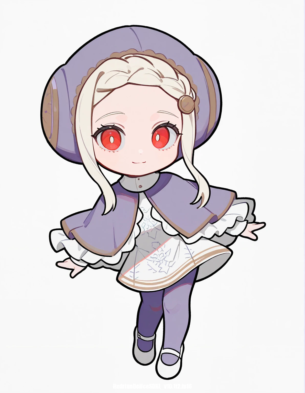 capelet, dress, escoffion, purple pantyhose, sidelocks, white mary janes, red eyes