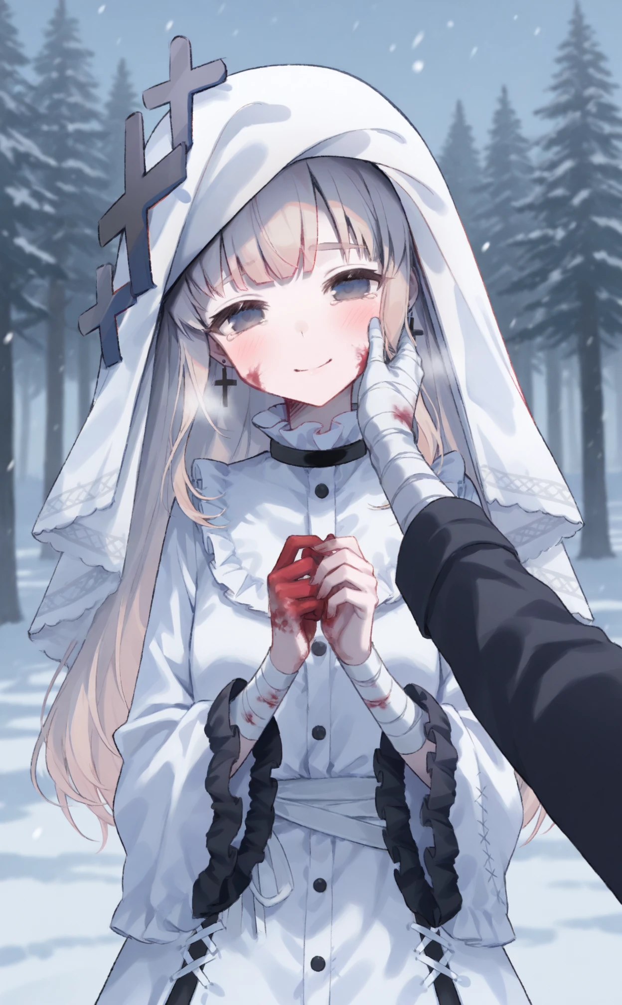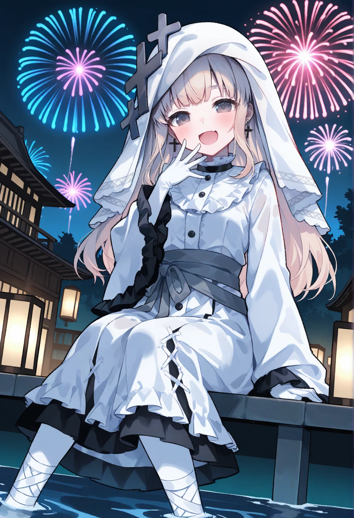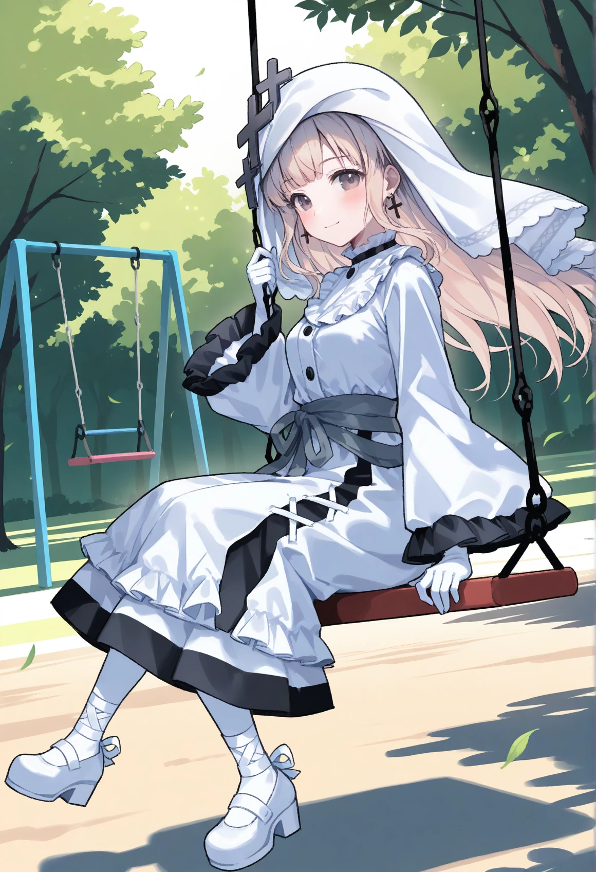all tag:hikami meruru,nun,sidelocks,white veil,cross hair ornament,cross earrings,black choker,frilled collar,white collar,frilled dress,white dress,frilled sleeves,wide sleeves,white gloves,grey sash,white pantyhose,ankle lace-up,platform footwear,white footwear,
