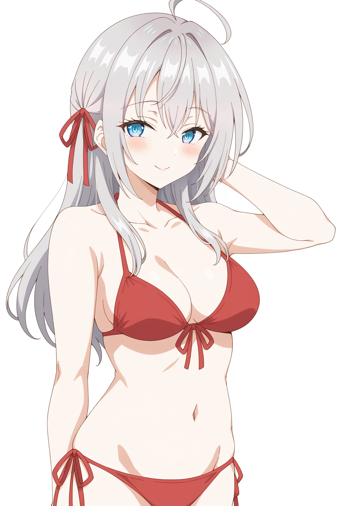 Promp: Alya_llts, blush, breasts, blue eyes, long hair, grey hair, sidelocks, bangs, ahoge, bow, ribbon, hair ribbon, small breasts,
