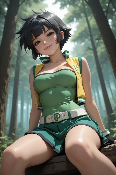 Buttercup_pgz,medium breasts, black hair , short hair,belt, green shirt,yellow sleeveless jacket,fingerless gloves, strapless, green skirt, green vest