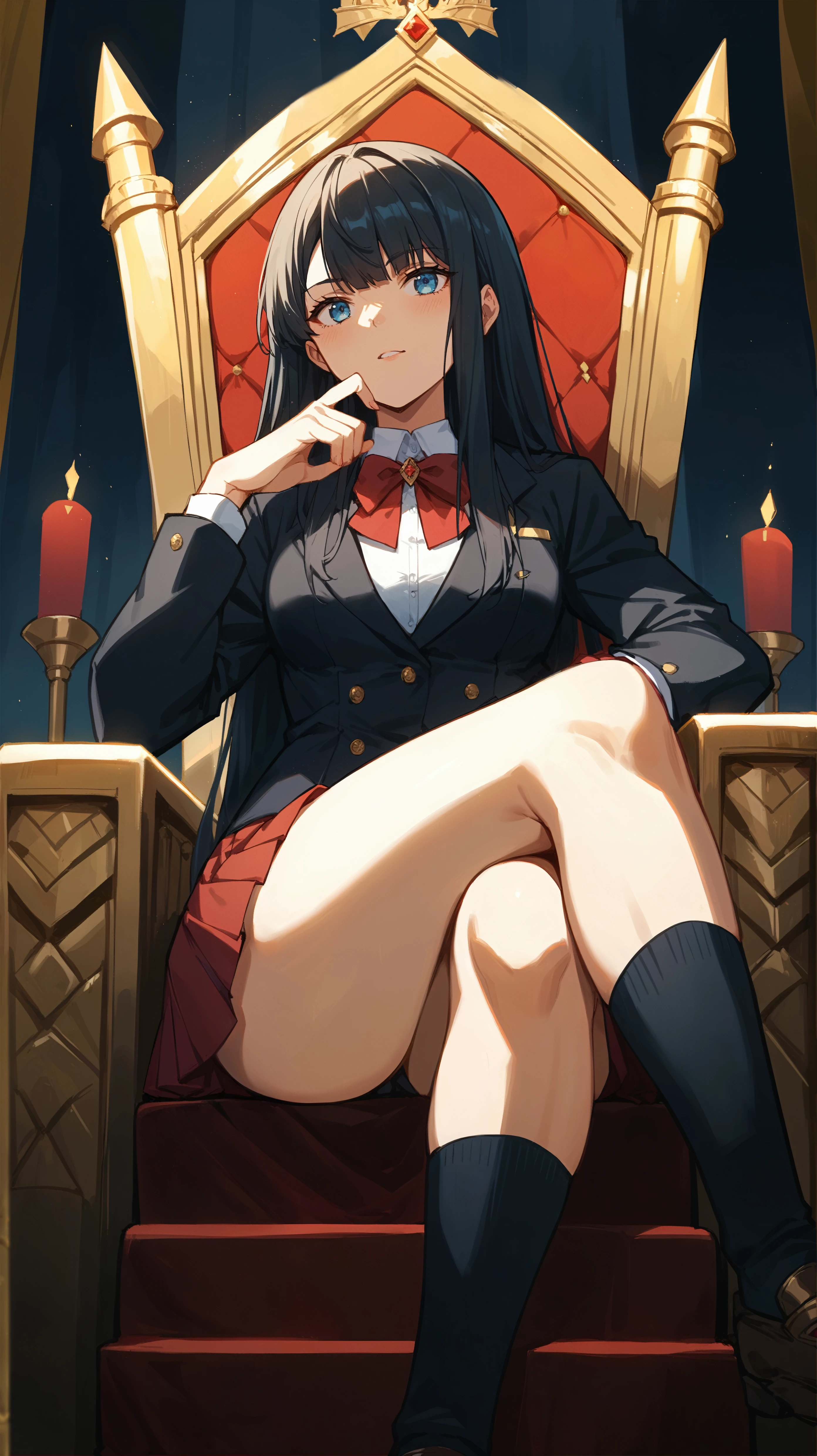 long hair, black hair, bangs, blue eyes, school uniform, black jacket, red skirtlong hair, black hair, bangs, blue eyes, white outfit, green trim, white shorts, black legwearDescription