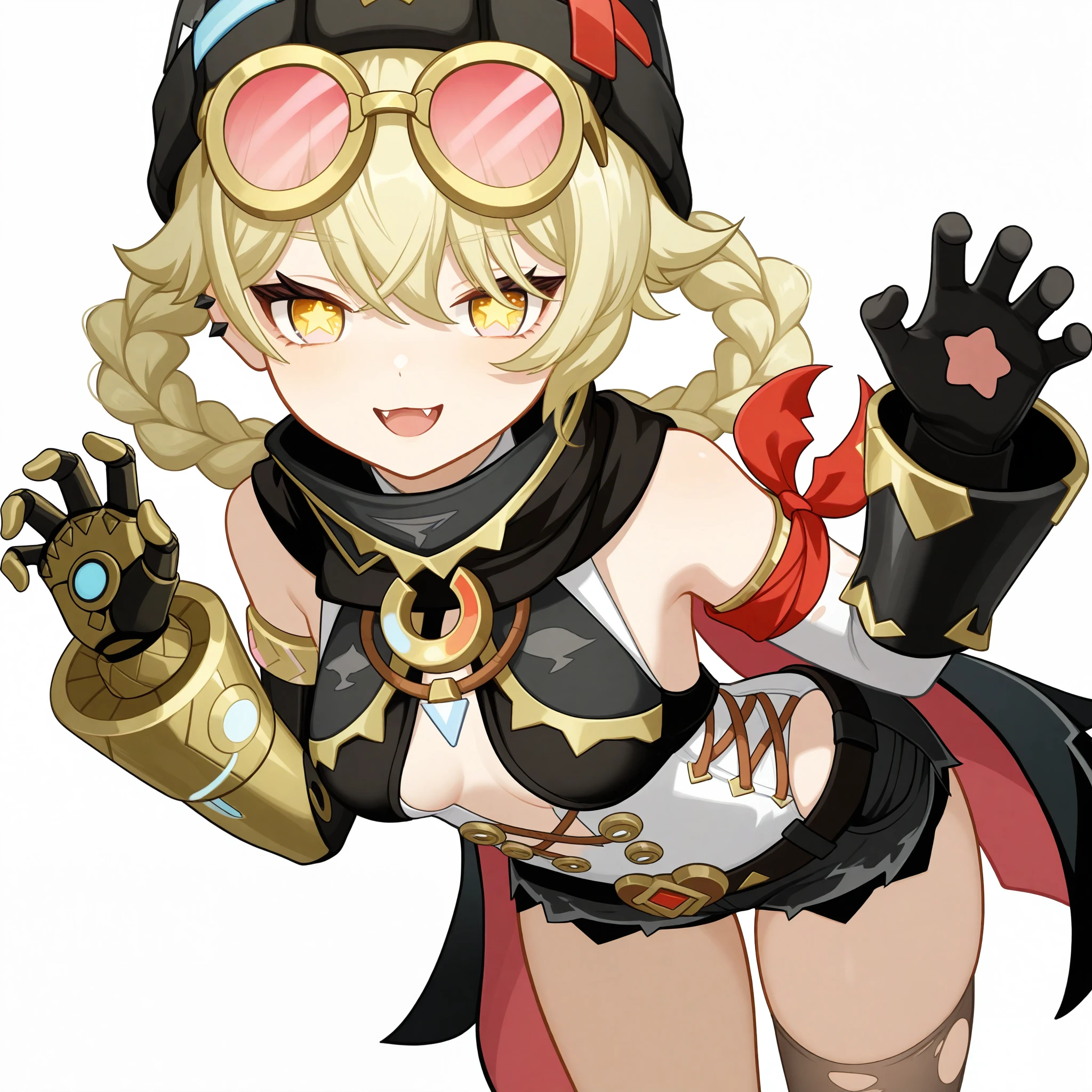 Jahoda \(genshin impact\),star-shaped pupils,twin braids,cat hat,black headwear,goggles on head,服装 (outfit)