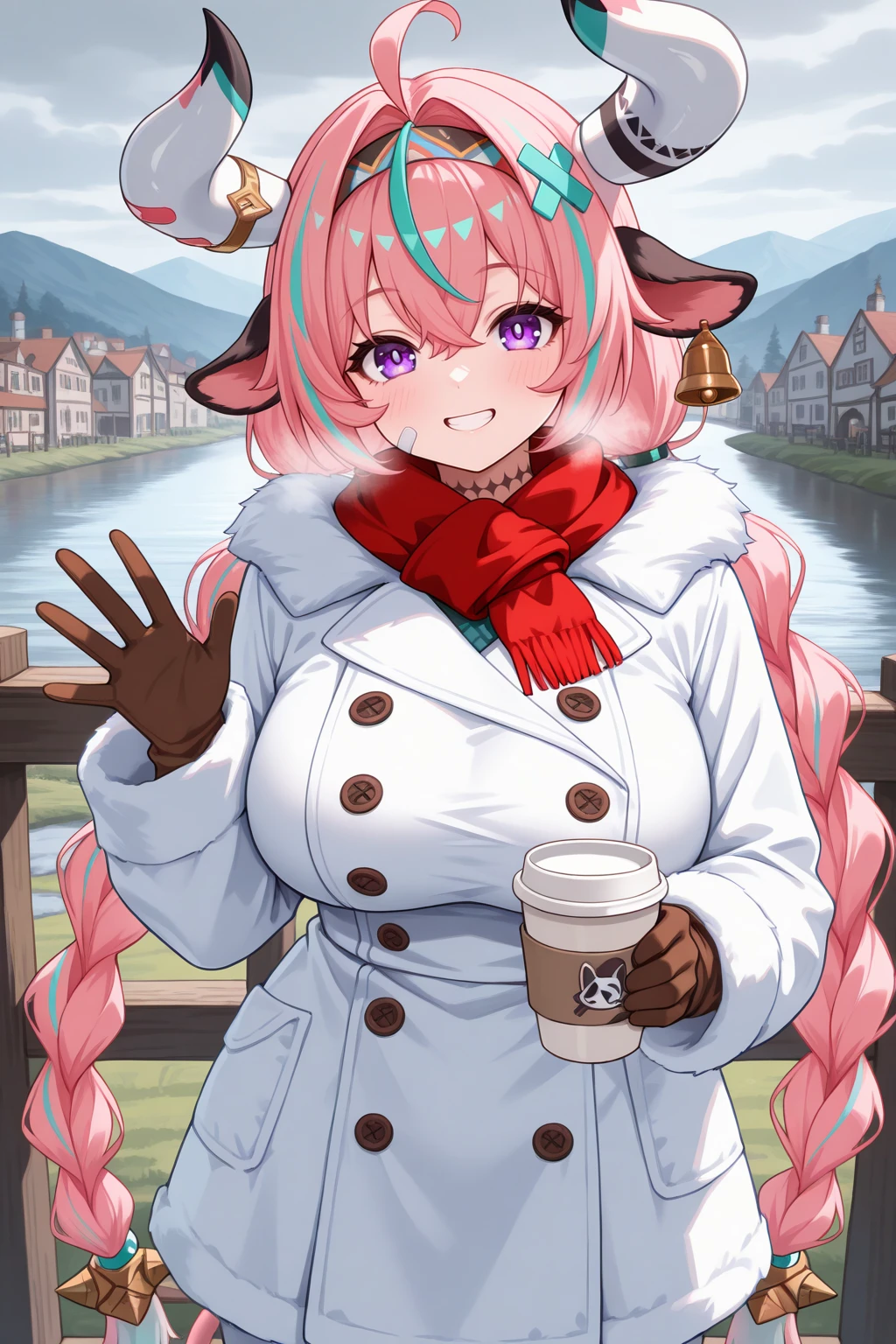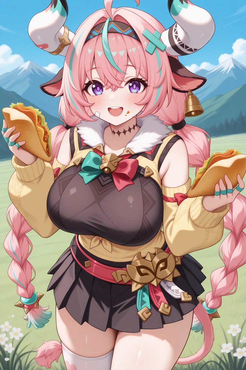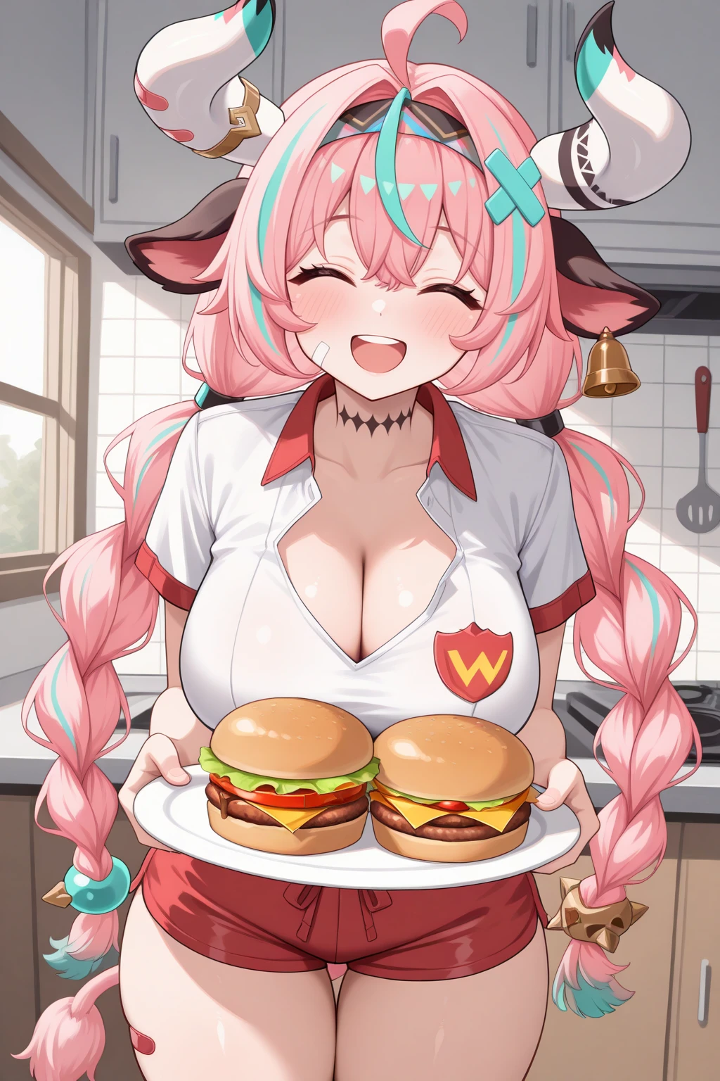 Appearance : v4r3s4, large breasts, cow girl, cow horns, mismatched horns, multicolored horns, bandaid on horn, cow tail, pink tail, cow ears, purple eyes, two-tone hair, pink hair, aqua hair, streaked hair, ahoge, hair intakes, hair between eyes, crossed bangs, twintails, twin braids, x hair ornament, long hair, horn ornament, ear bell, neck tattoo, multicolored hairband, bandaid on cheek