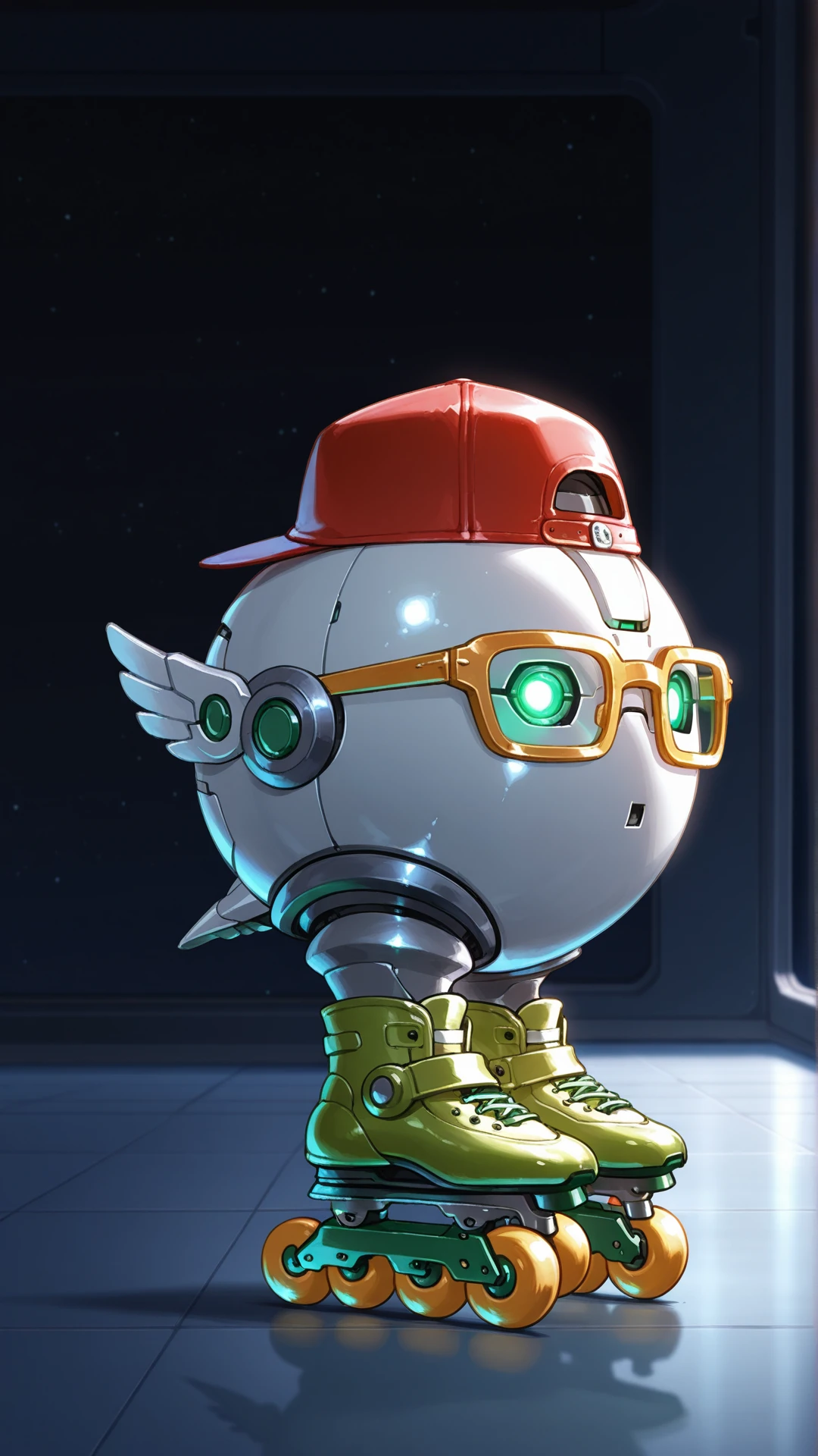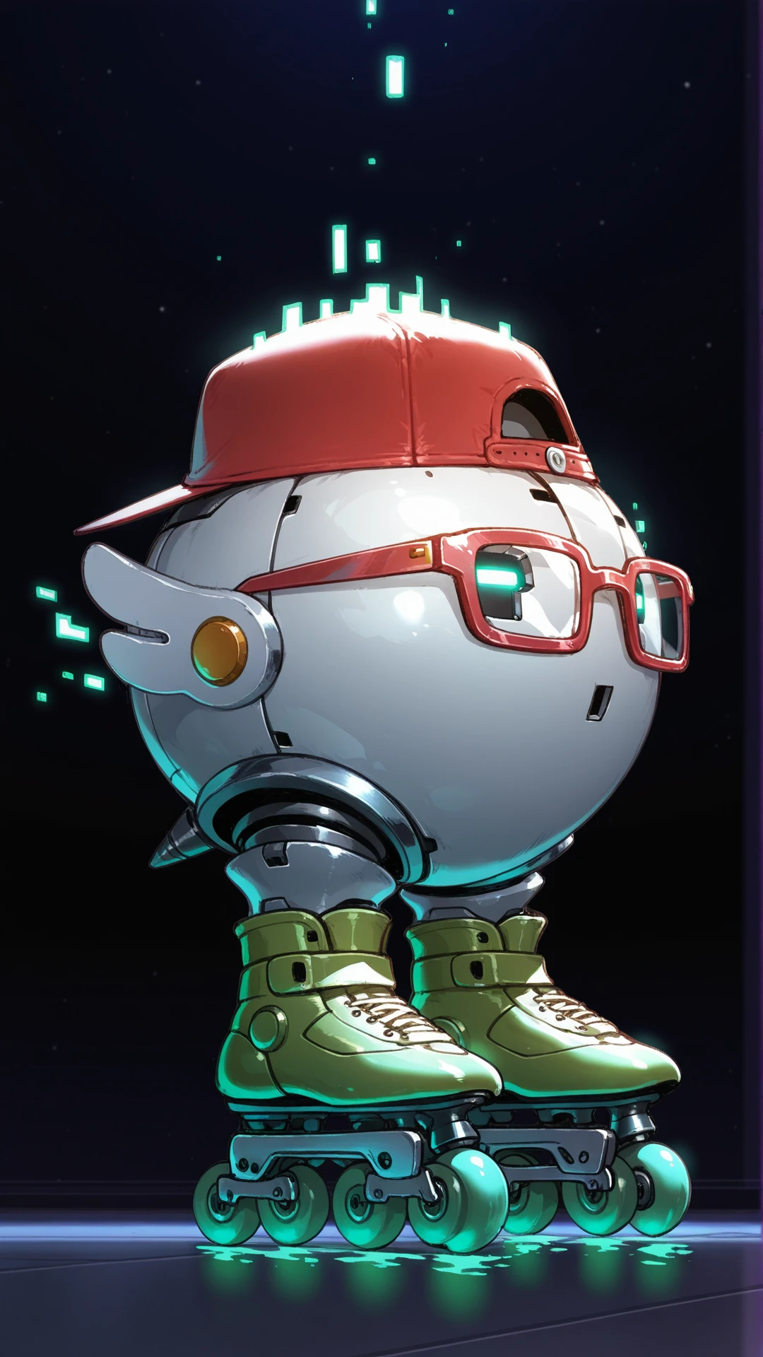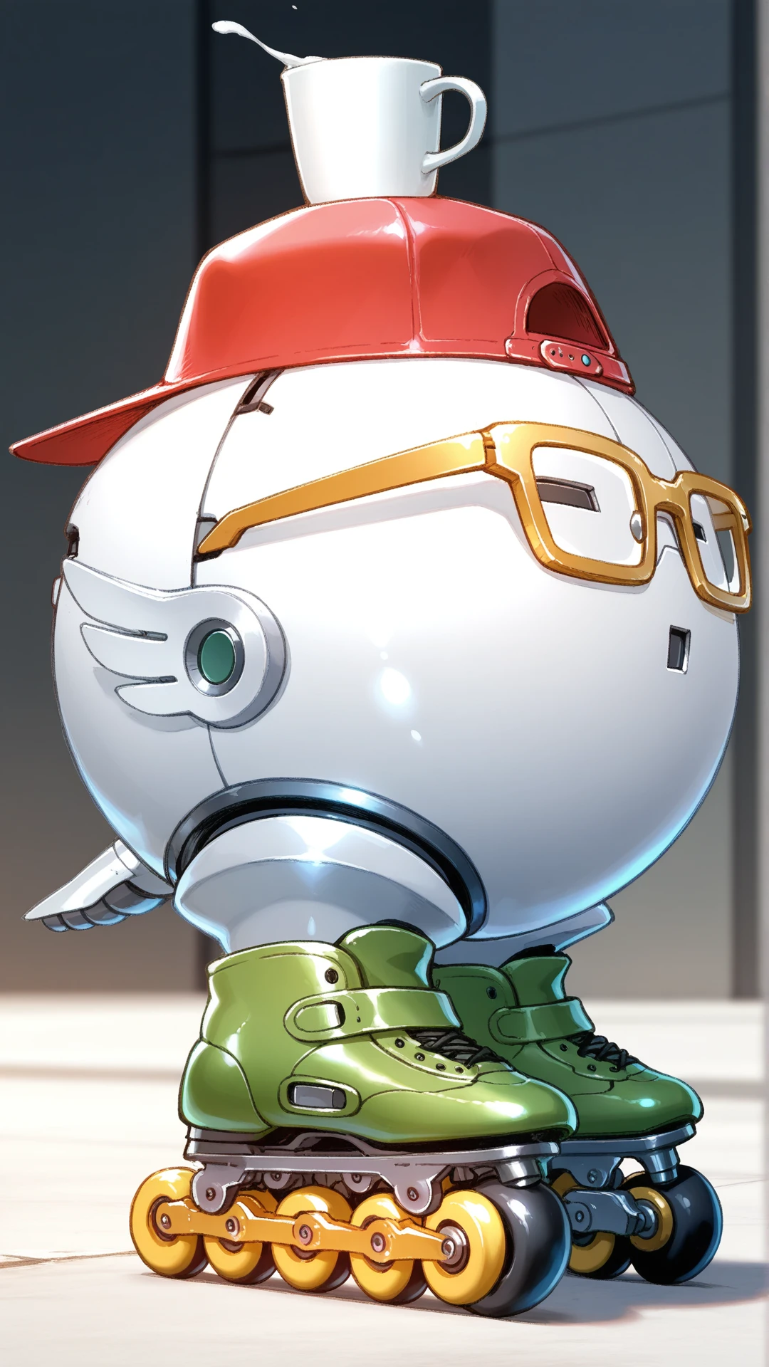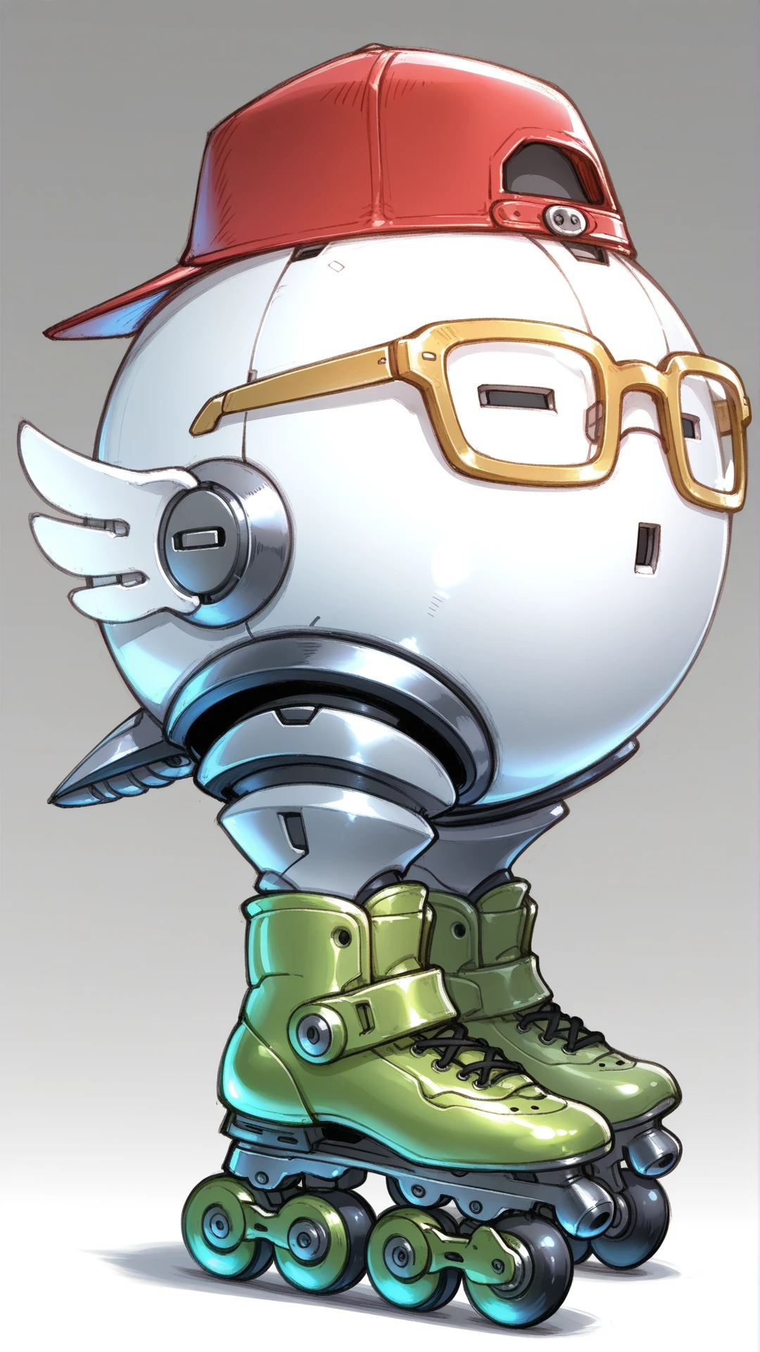cube \(live a live\),no humans,roller skates, inline skates, wings, glasses,red baseball cap, backwards hat, robot, mechanization, green footwear, white wings,
