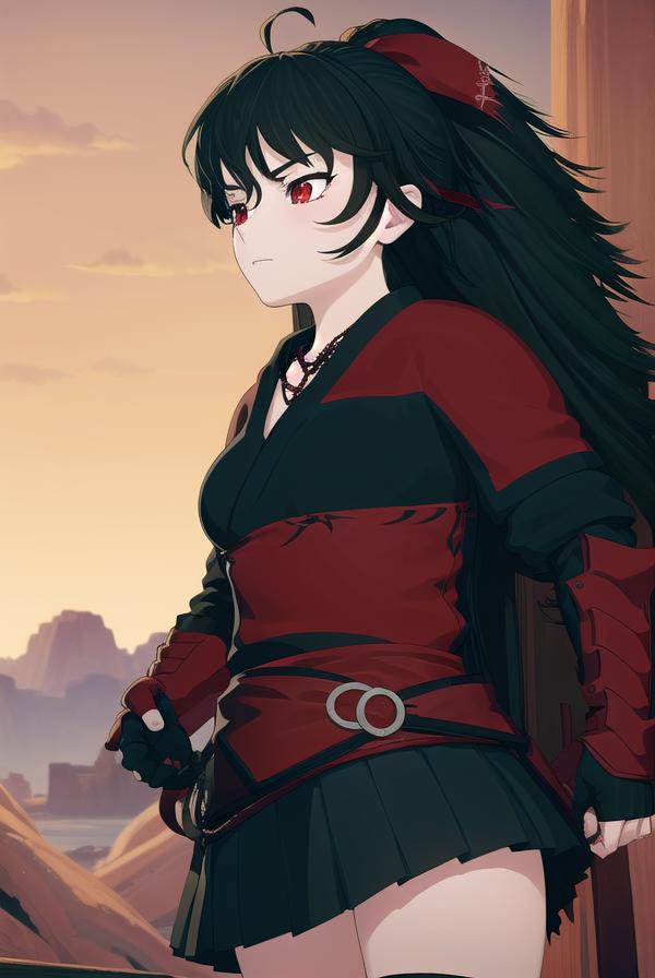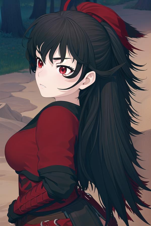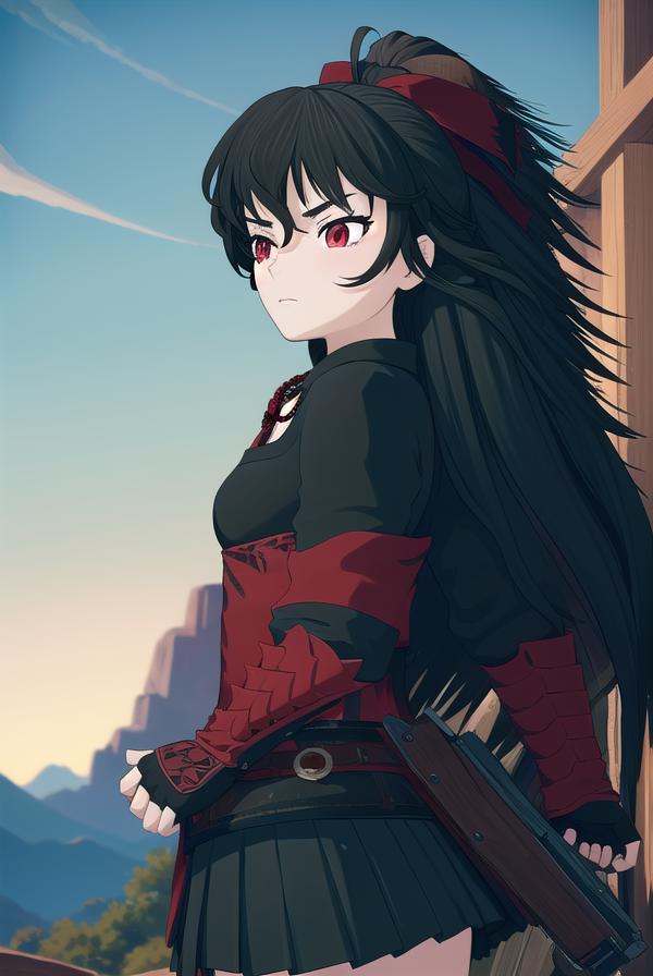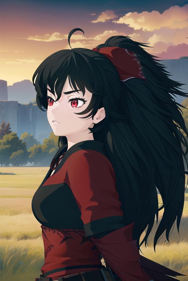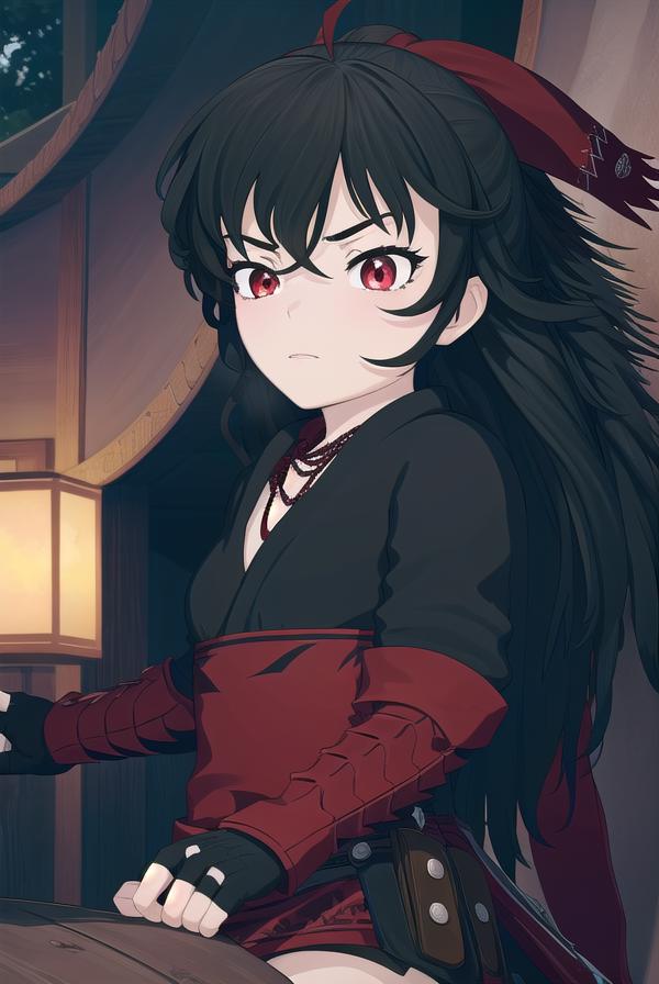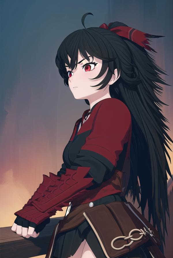raven branwen, long hair, black hair, ponytail, hair ribbon, ribbon, (red eyes:1.2), ahoge,