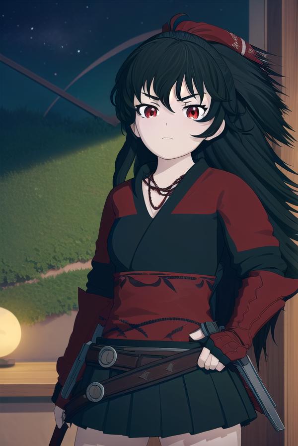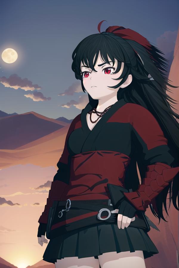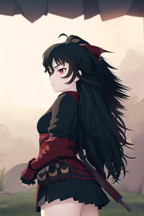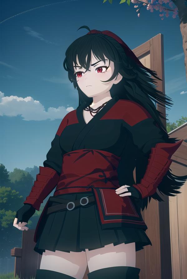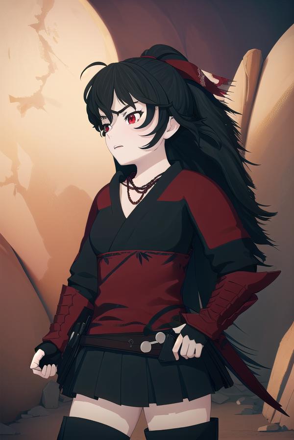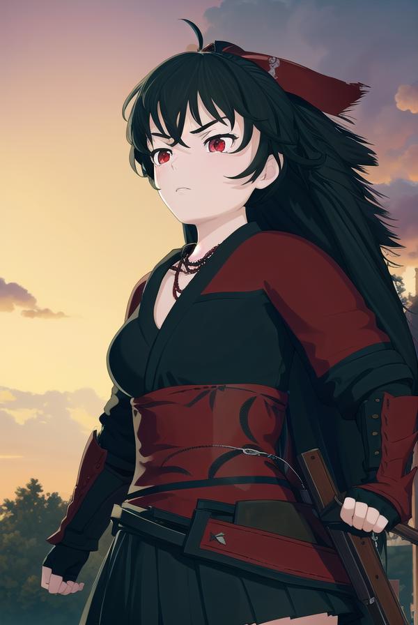 raven branwen, long hair, black hair, ponytail, hair ribbon, ribbon, (red eyes:1.2), ahoge,
