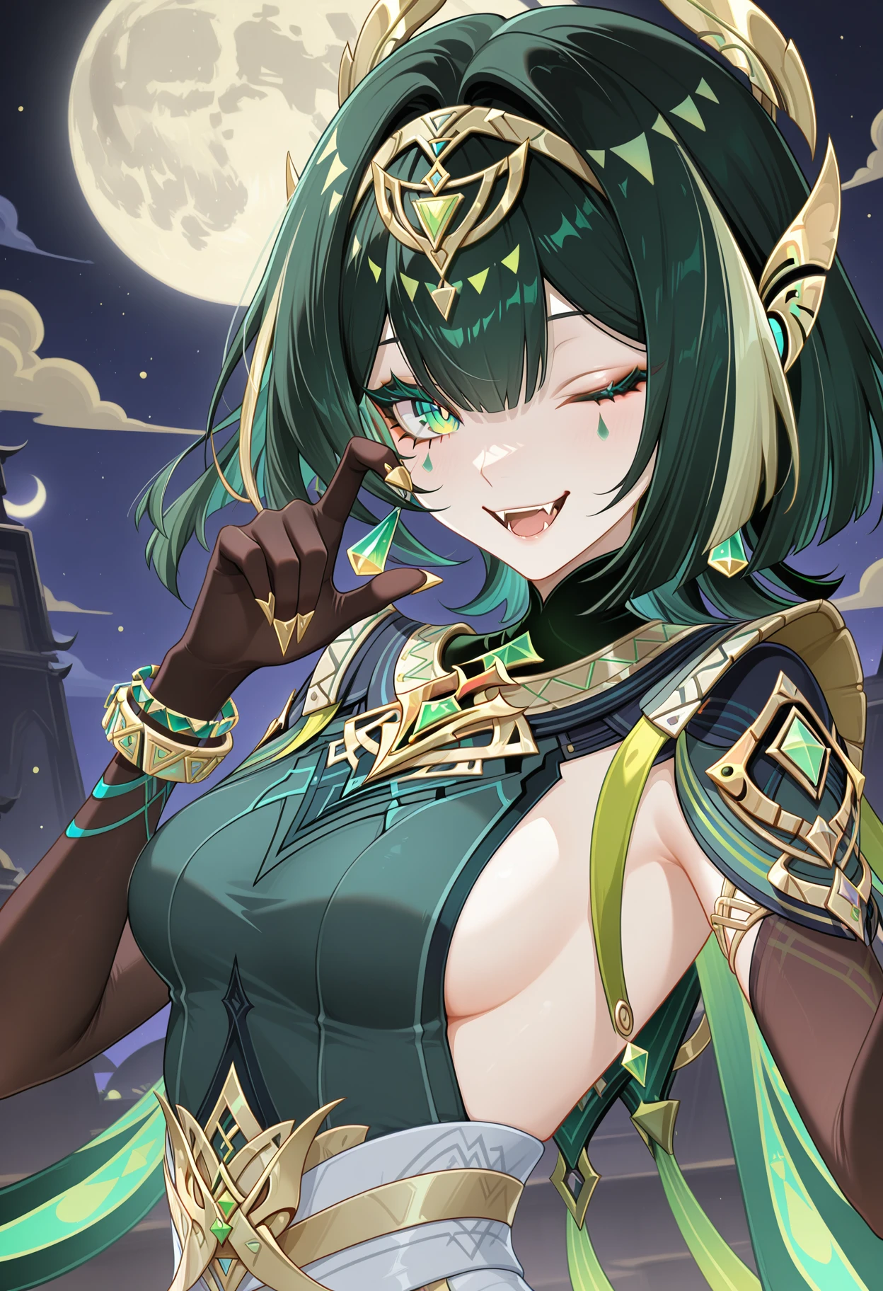 Nefer, 1girl, solo, breasts, gloves, one eye closed, jewelry, looking at viewer, black gloves, sideboob,  moon, elbow gloves, smile, open mouth, upper body, hair ornament, fangs, full moon, bracelet, earrings