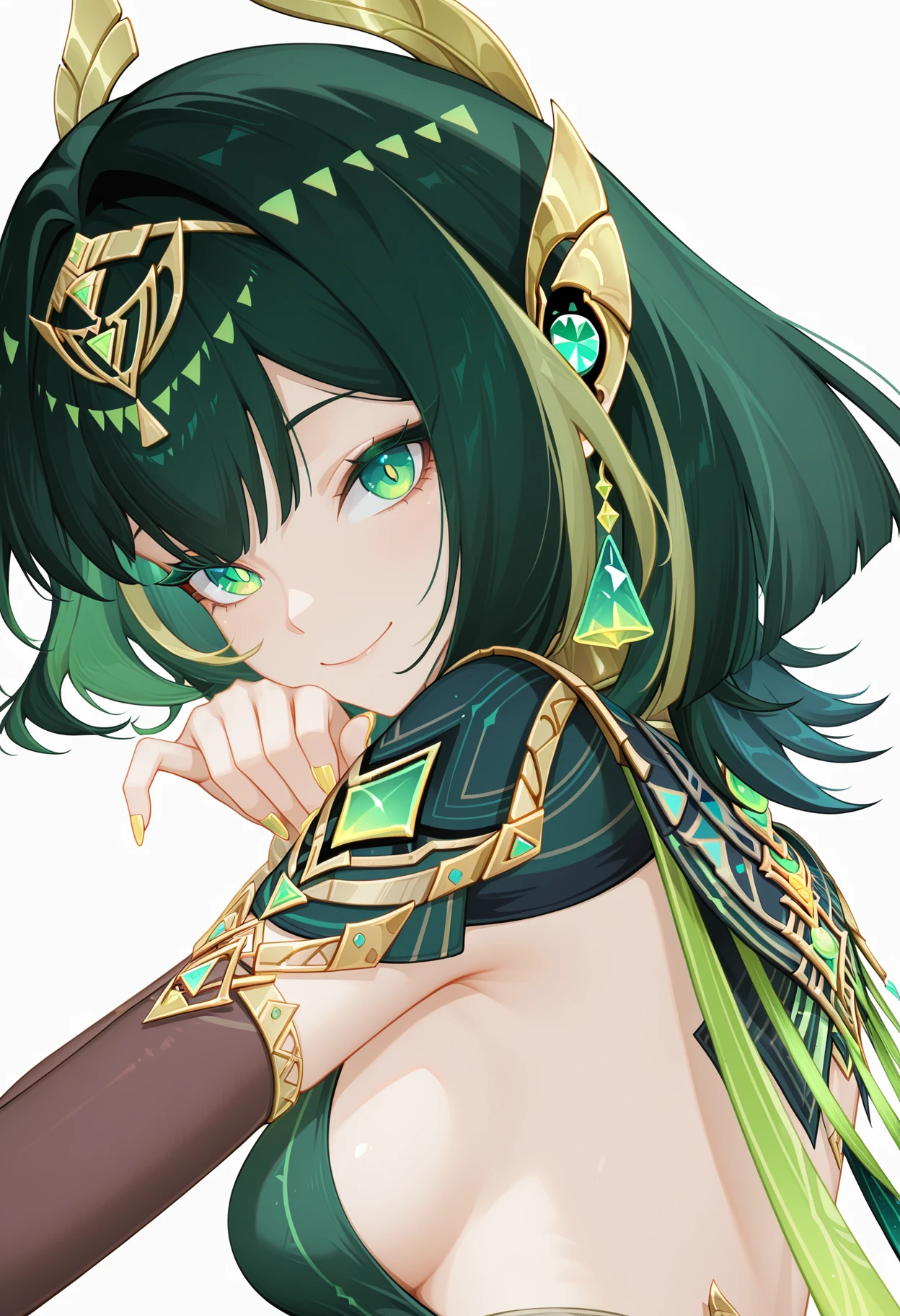 Nefer, 1girl, breasts, solo, white background, upper body, looking at viewer, simple background, smile, closed mouth, jewelry, hair ornament, earrings, medium hair, sideboob