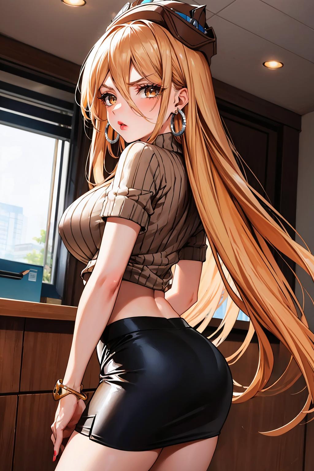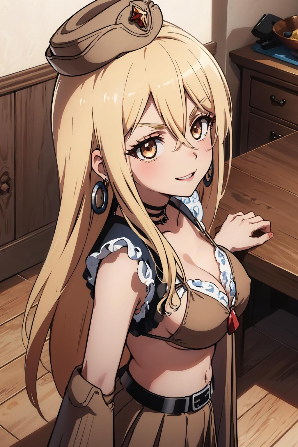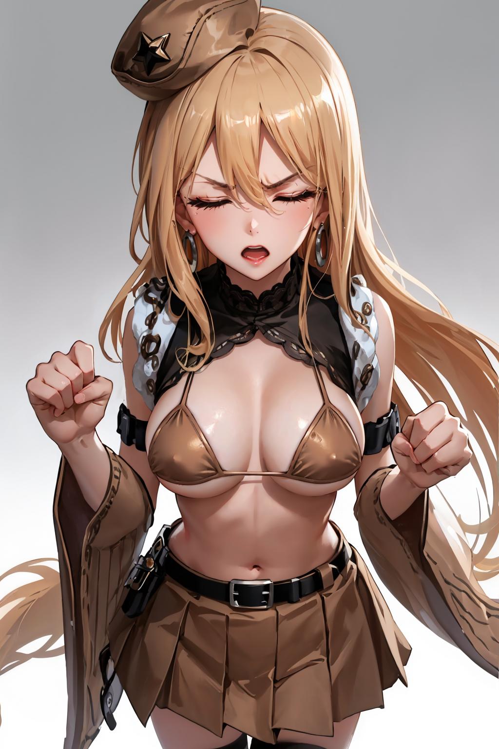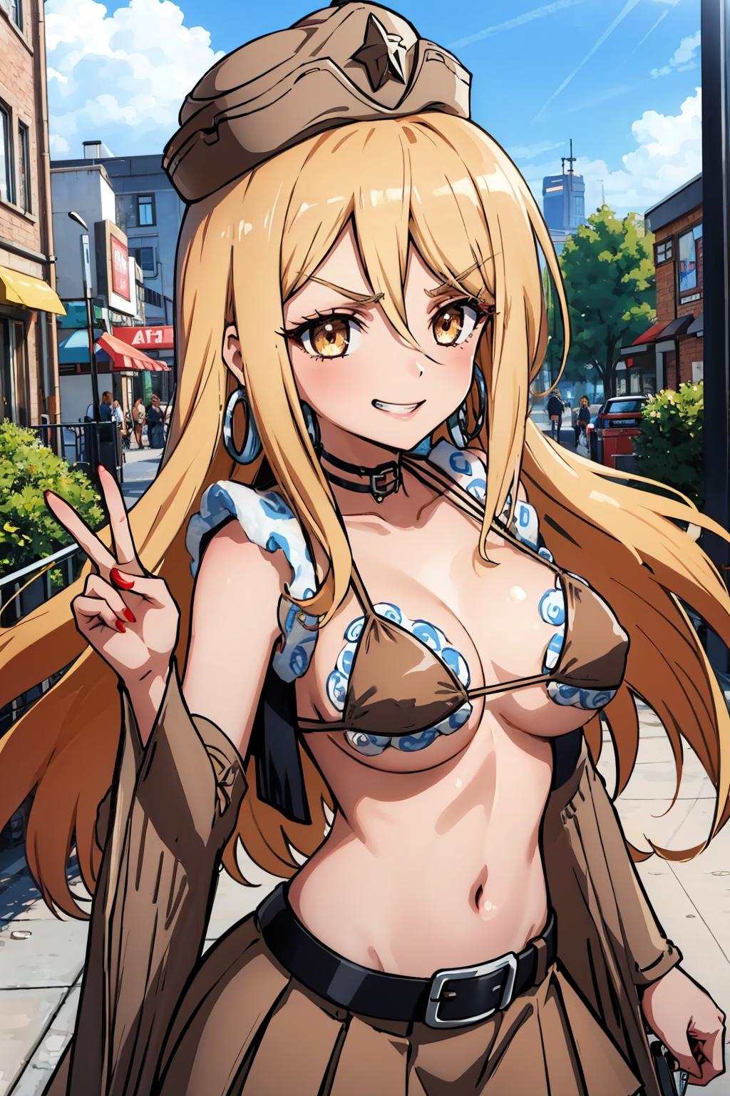 Add "mini hat, earrings, bikini, belt, pleated skirt, detached sleeves" for her typical look.