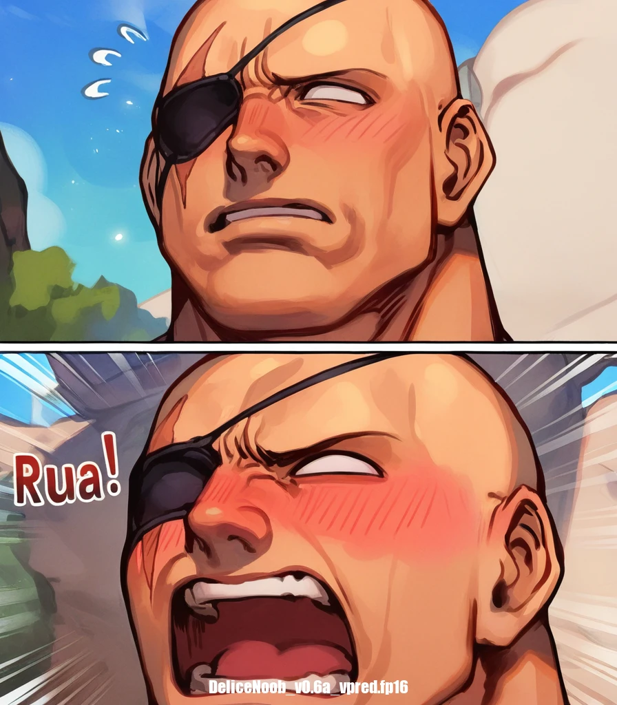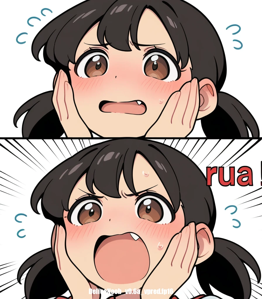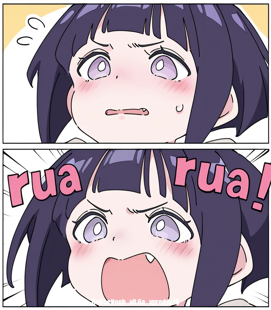 rua \(meme\), english text "rua", 2koma, emphasis lines, flying sweatdrops, blush, $charaname$