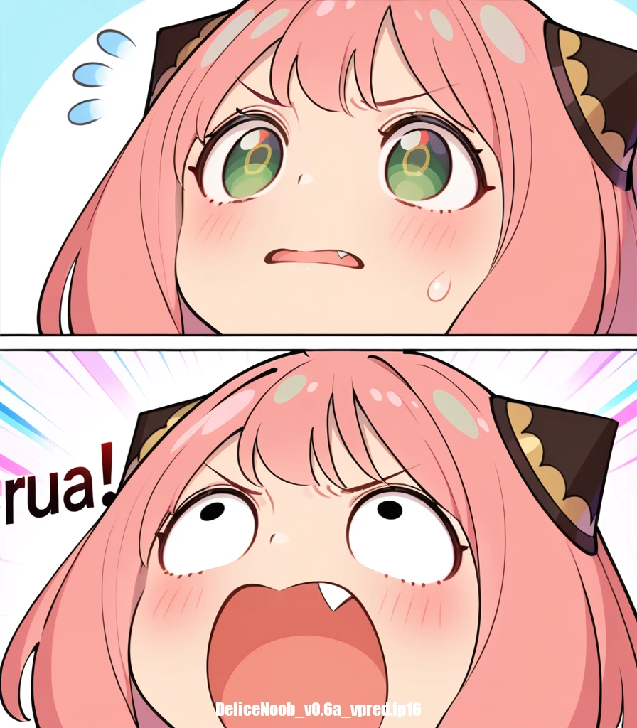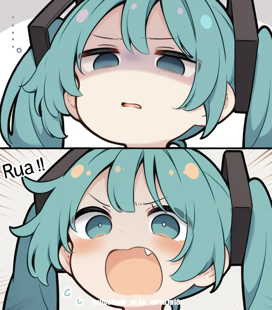 rua \(meme\), chibi-style, 2koma, flying sweatdrops, emphasis lines, english text:"rua", fang, simple background, white background, close-up, from below, $charaname$,