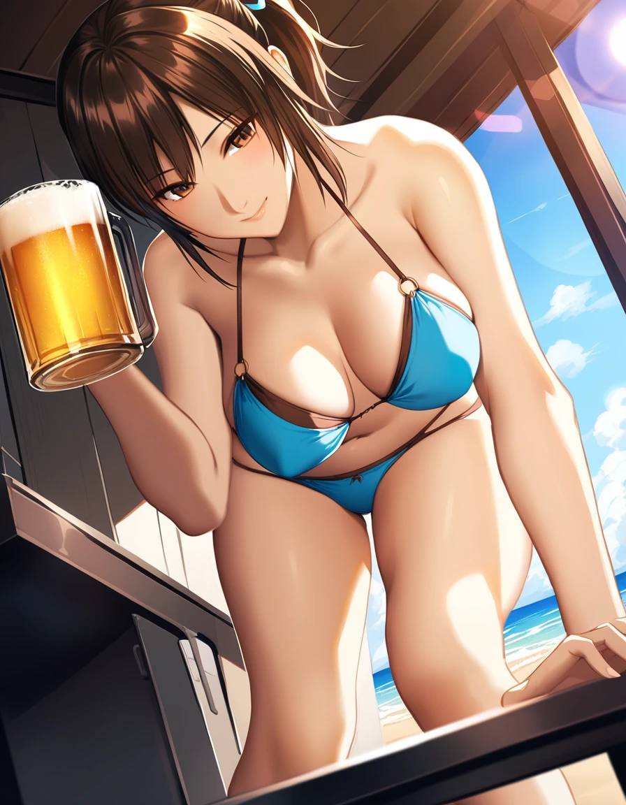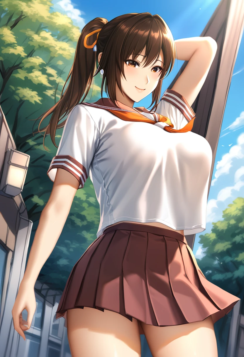 large breasts, brown hair, brown eyes, hair ribbon, ponytail,