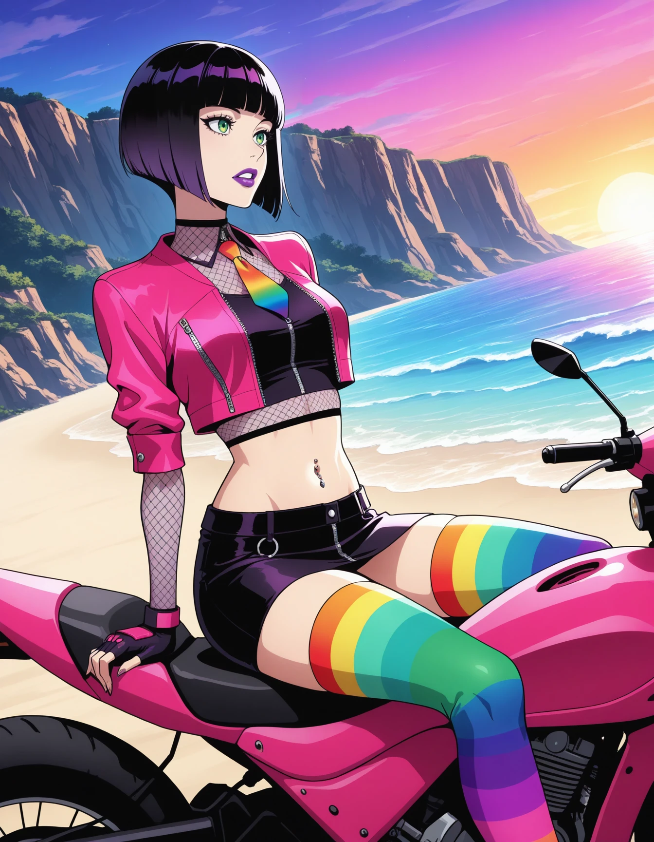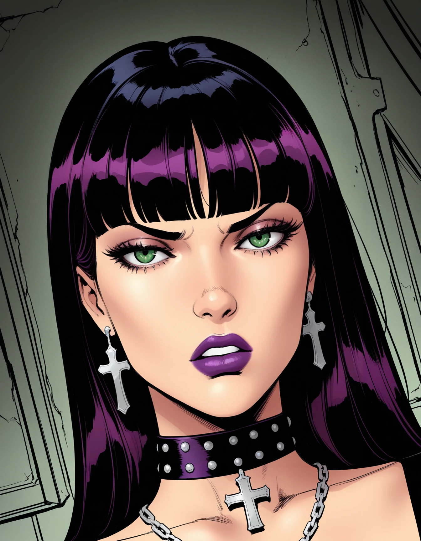 cl4r4, black hair, purple sheen hair, eyelashes, blunt bangs, purple lips, green eyes
