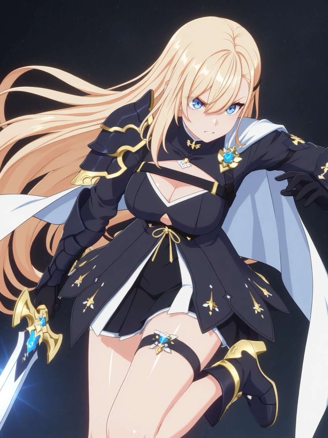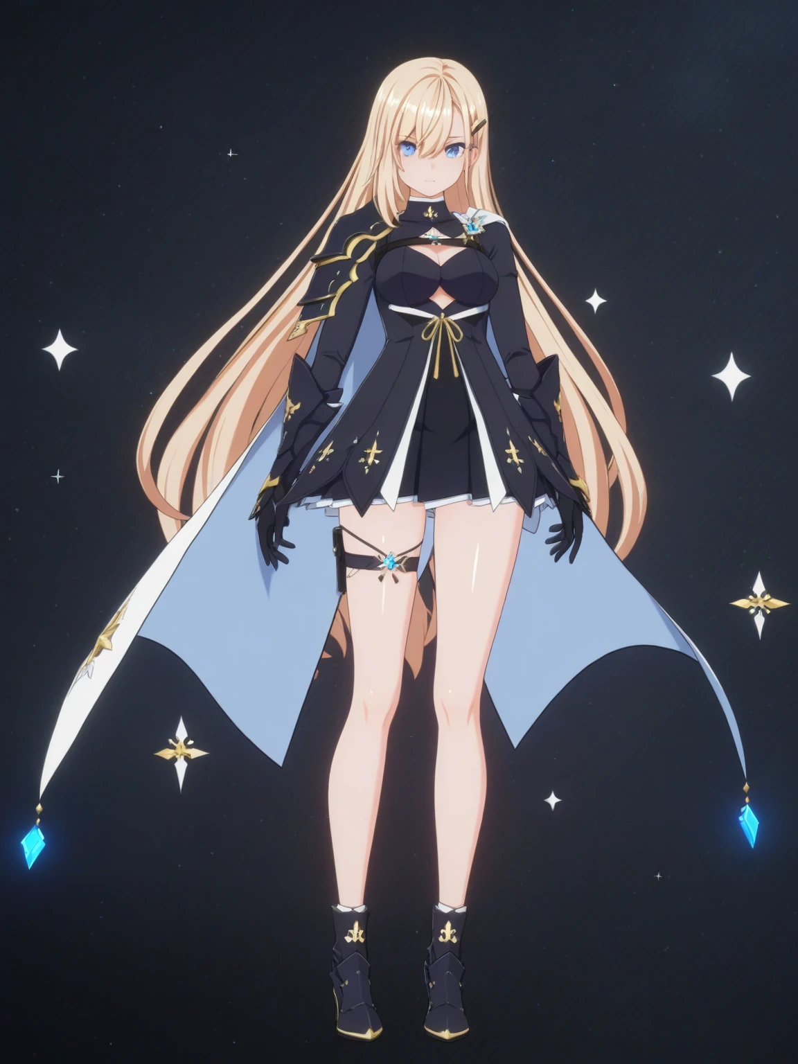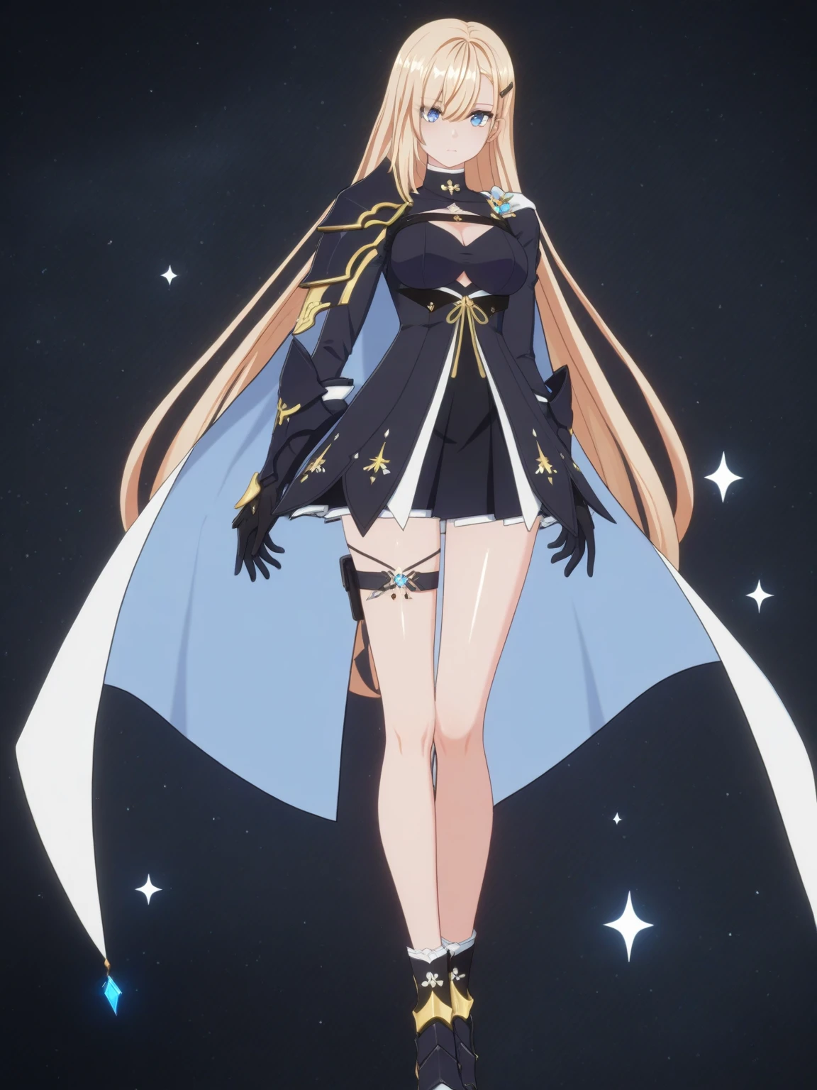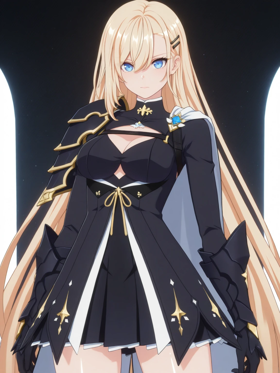 Clothes: black dress, cutout, (white cape, shoulder cape), (single pauldron), gloves, thigh strap, (ankle boots, high heel boots),
