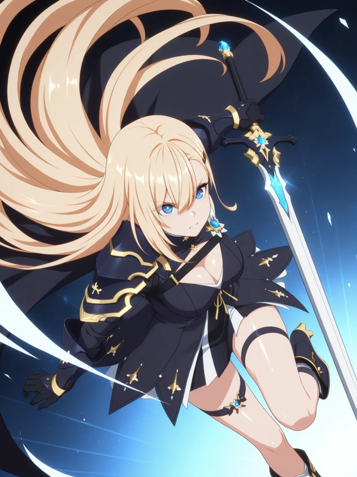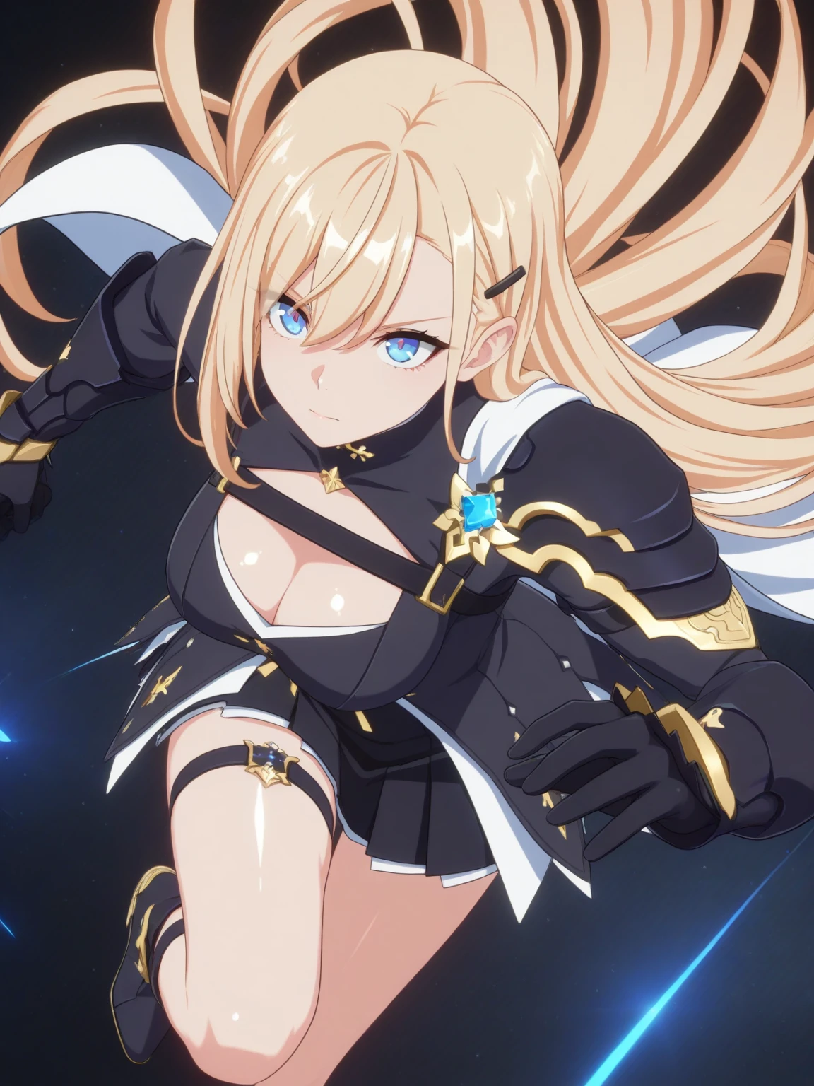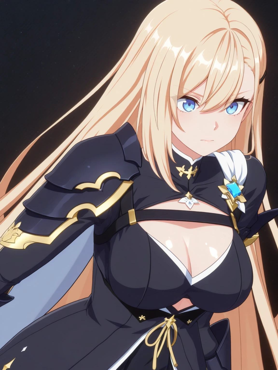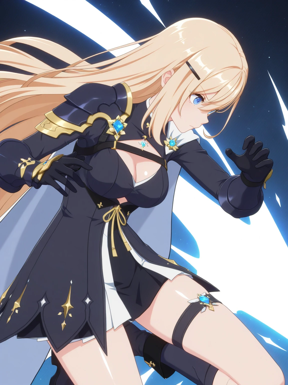 Clothes: black dress, cutout, (white cape, shoulder cape), (single pauldron), gloves, thigh strap, (ankle boots, high heel boots),
