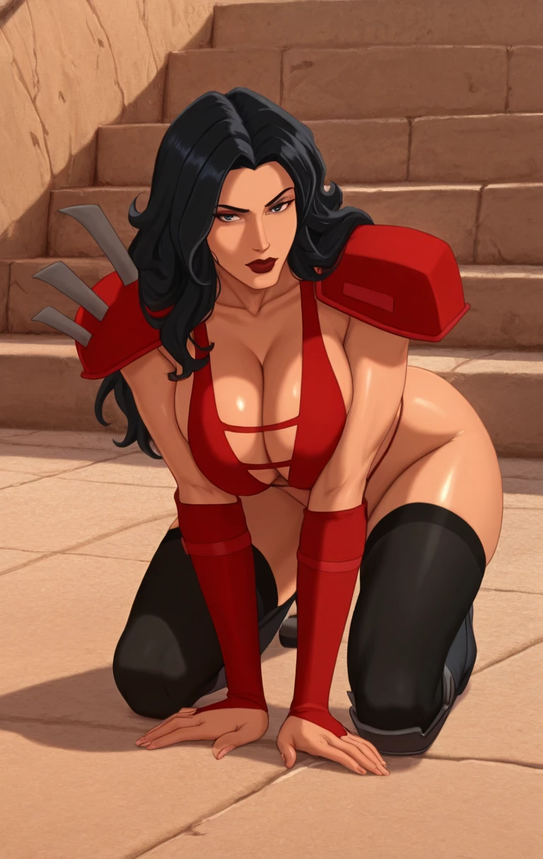 1girl, solo, long hair, breasts, looking at viewer, large breasts, black hair, thighhighs, navel, cleavage, jewelry, bare shoulders, large breasts, collarbone, thighs, cowboy shot, dark skin, detached sleeves, dark-skinned, pauldrons, muscular female, red lips, pelvic curtain, red armor,h3avym3t4l,