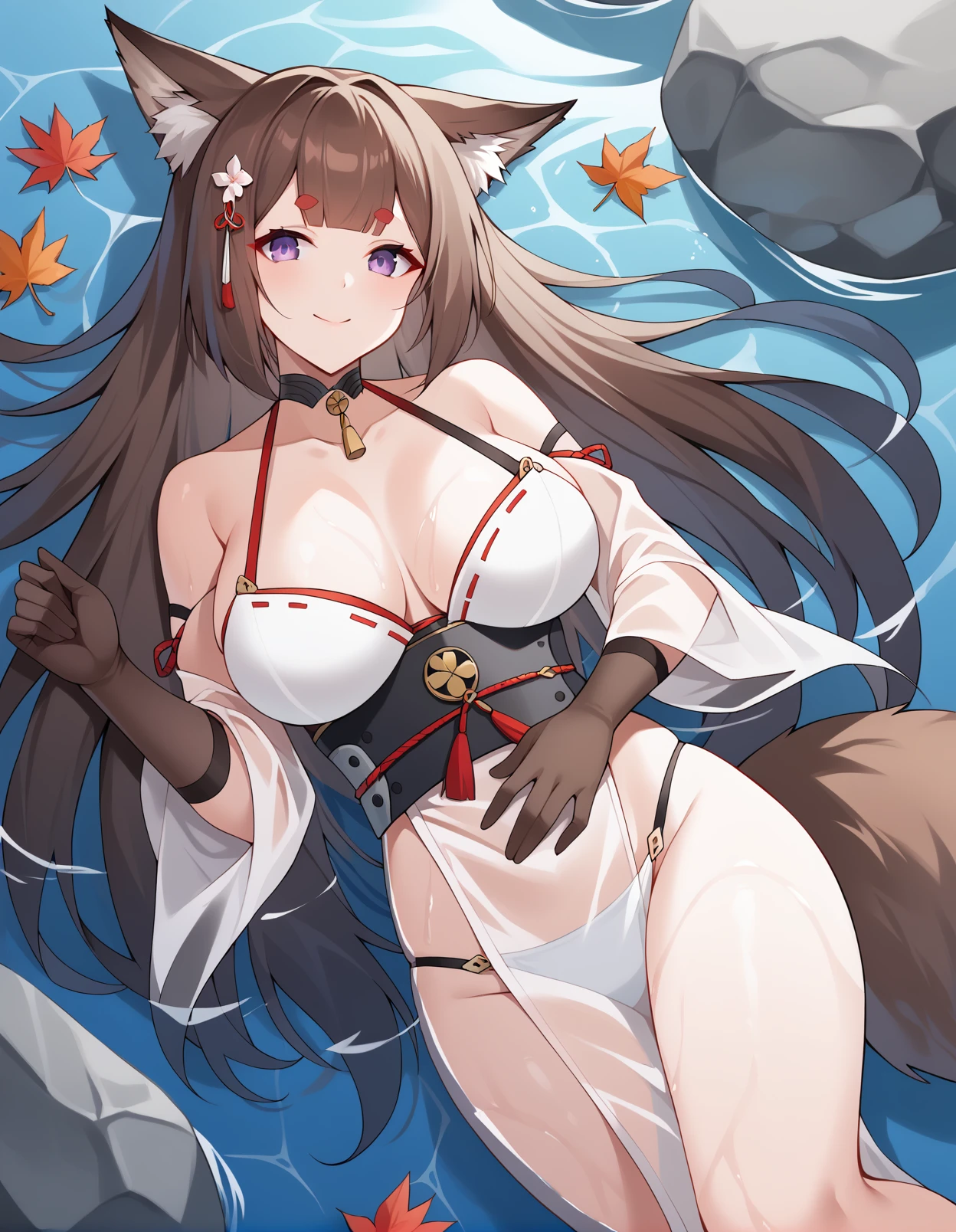 Trigger Words: amagi \(azur lane\), 1girl, fox girl, fox ears, long hair, brown hair, blunt bangs, purple eyes, fox tail, multiple tails, thick eyebrows, hair ornament
