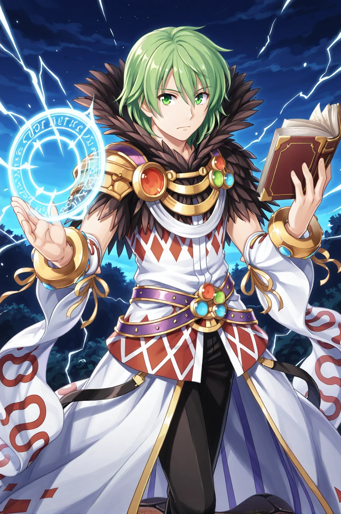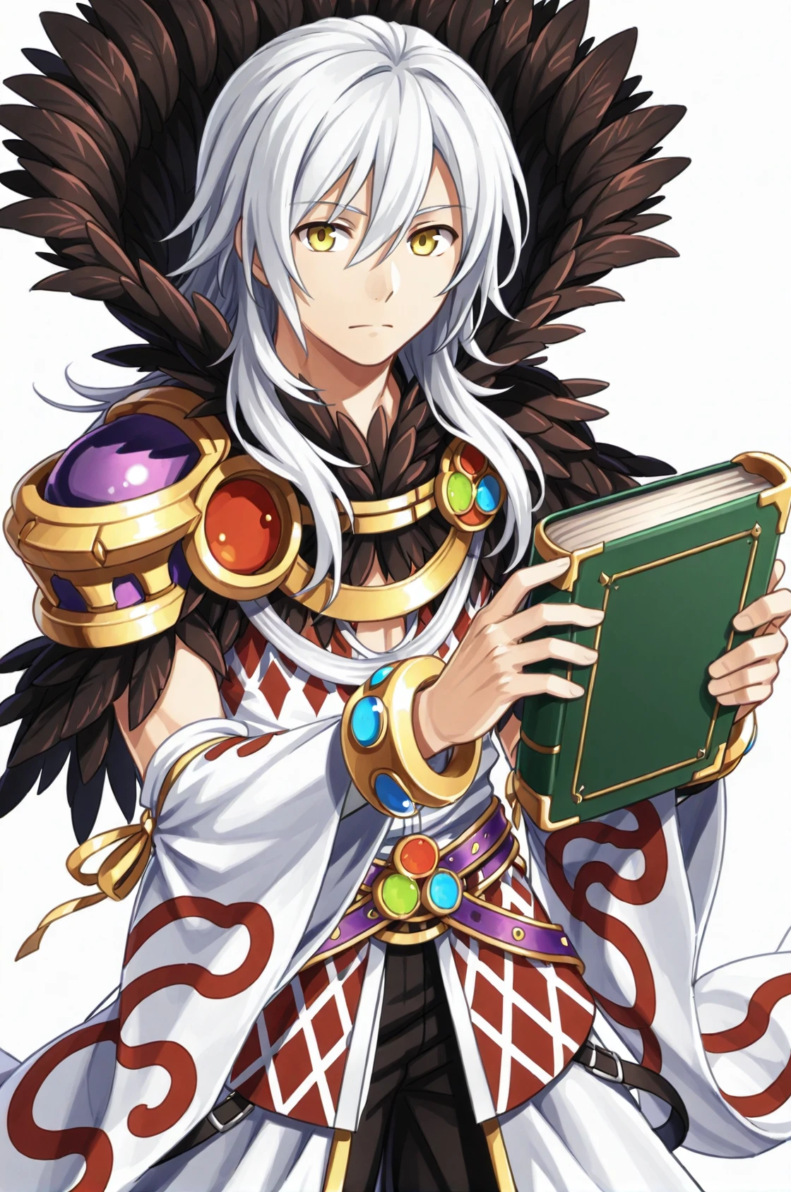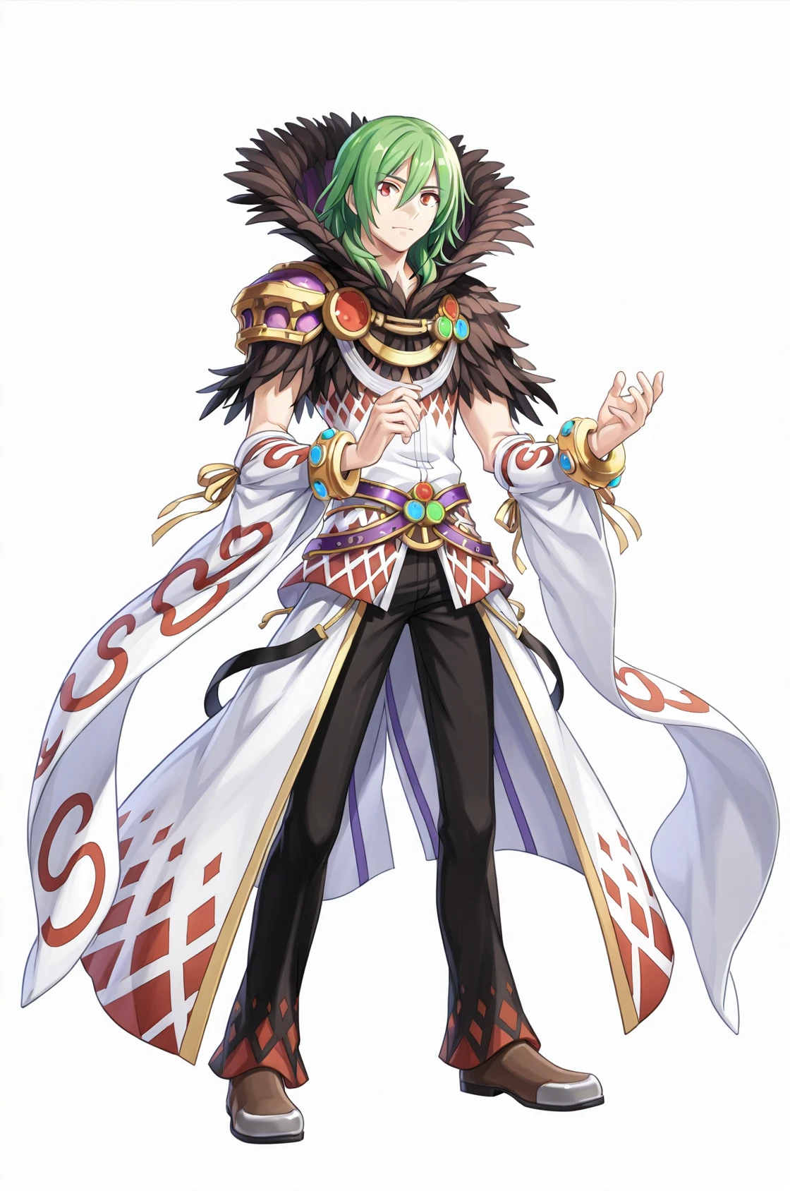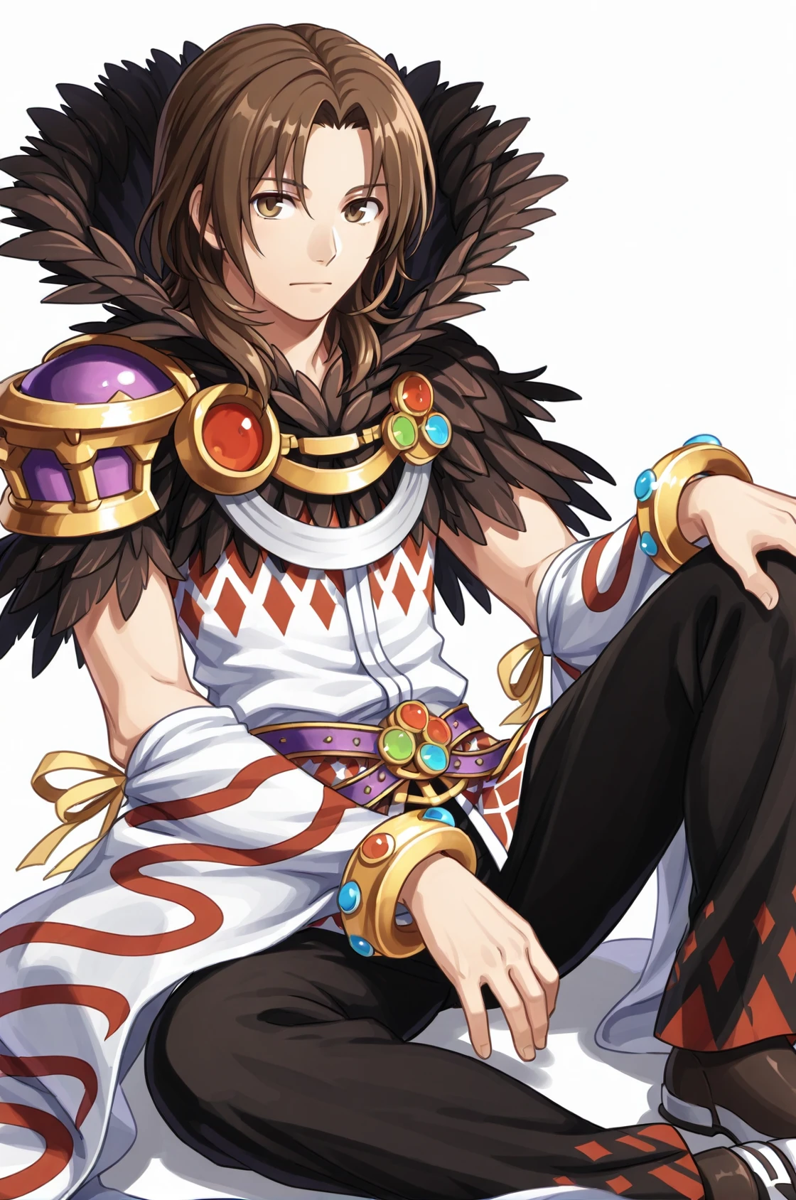 prompt: sorROMale, mystical high collar, shoulder armor, black feather trim, detached sleeves, bracelet, white sleeves, wide sleeve, arm warmers, bangle, white argyle dress, belt, black pants, shoes