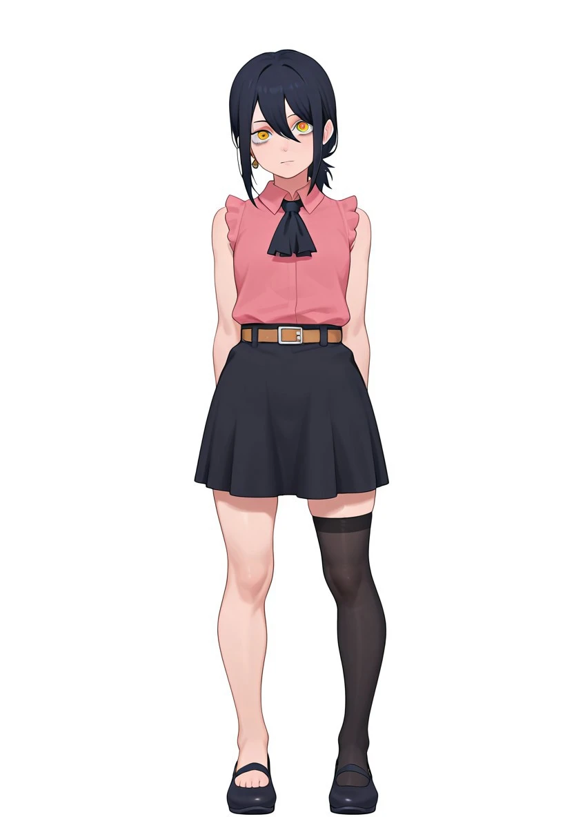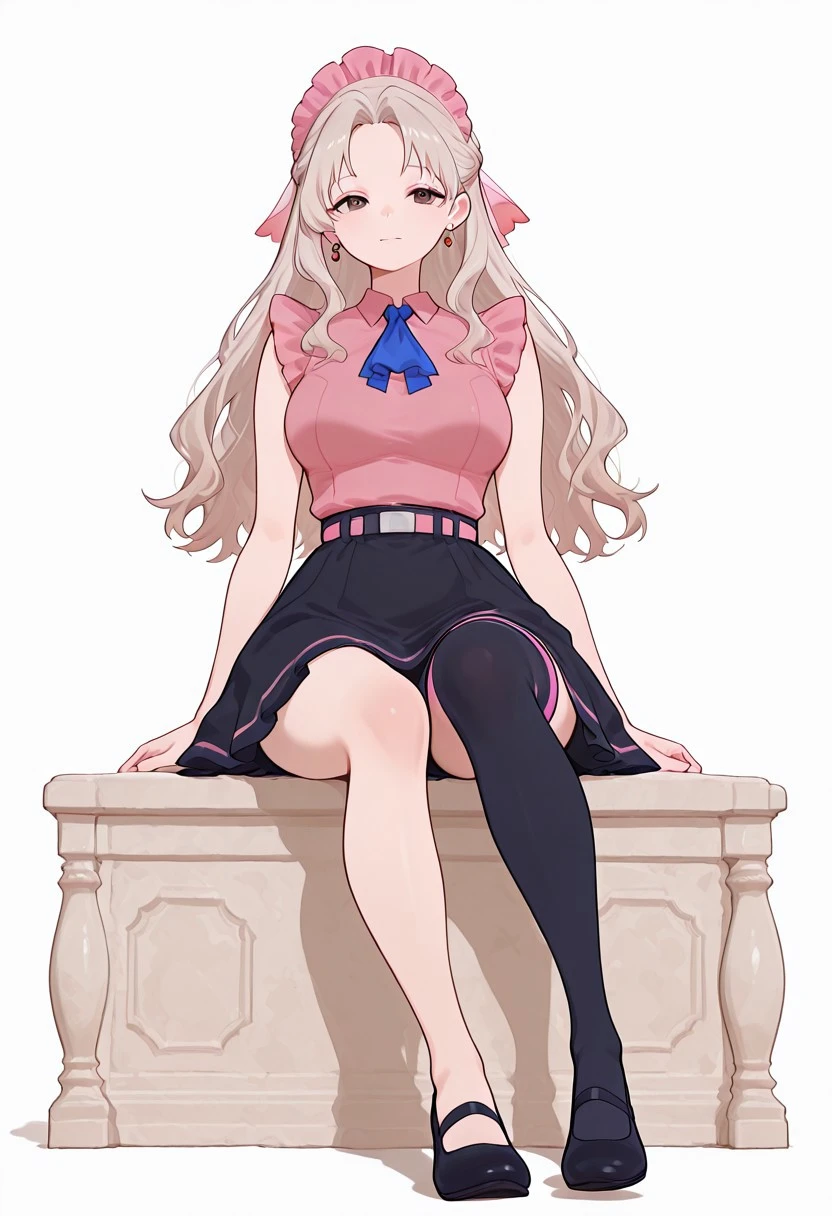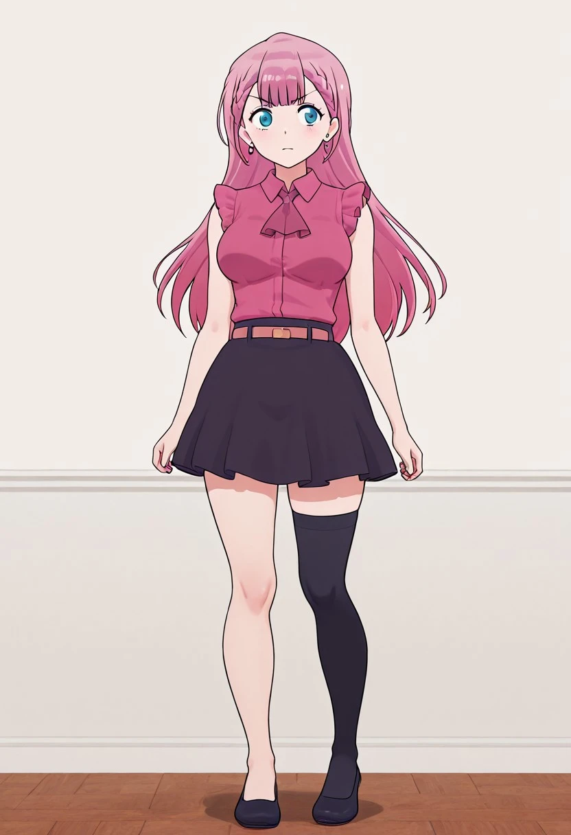 <lora:Elizabeth-C-V1>,top,pink top, sleeveless, ascot,skirt, black skirt, belt, high stocking,(one stocking),black stocking, stocking on left leg, earring,earring in left ear,ballet shoes,black shoe,((left white shoe))