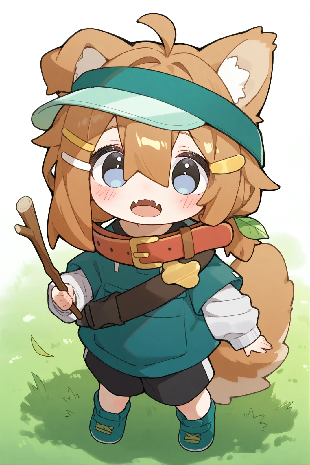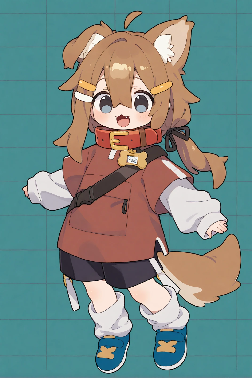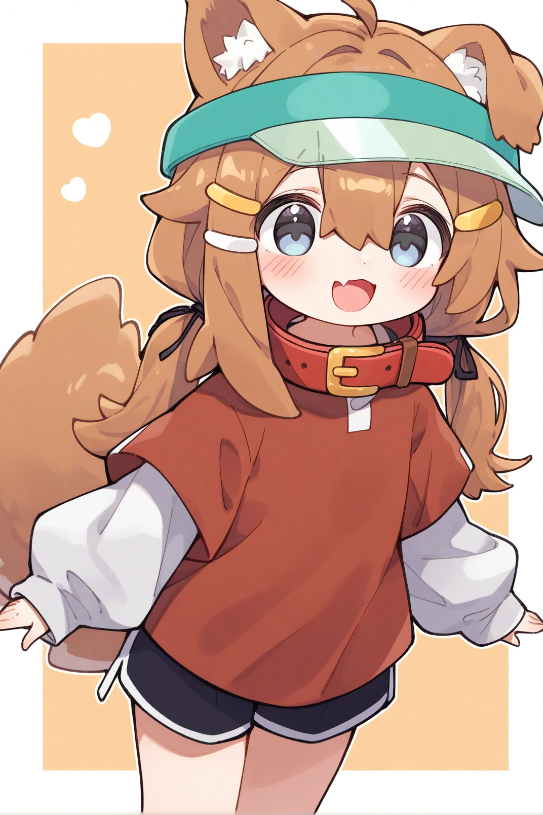 mamehinata, animal ears, blue eyes, brown hair, tail, 1girl,solo, short over long sleeves, visor cap, shorts, layered sleeves, hair ornament, collar, ahoge, shirt, black shorts, short sleeves, red shirt, long sleeves, dog tail, shoes, fang, loose socks, cup, hairclip, paw print, dog ears, hair between eyes, sleeves past wrists, red collar, pocket, blue footwear, bag, socks, white socks