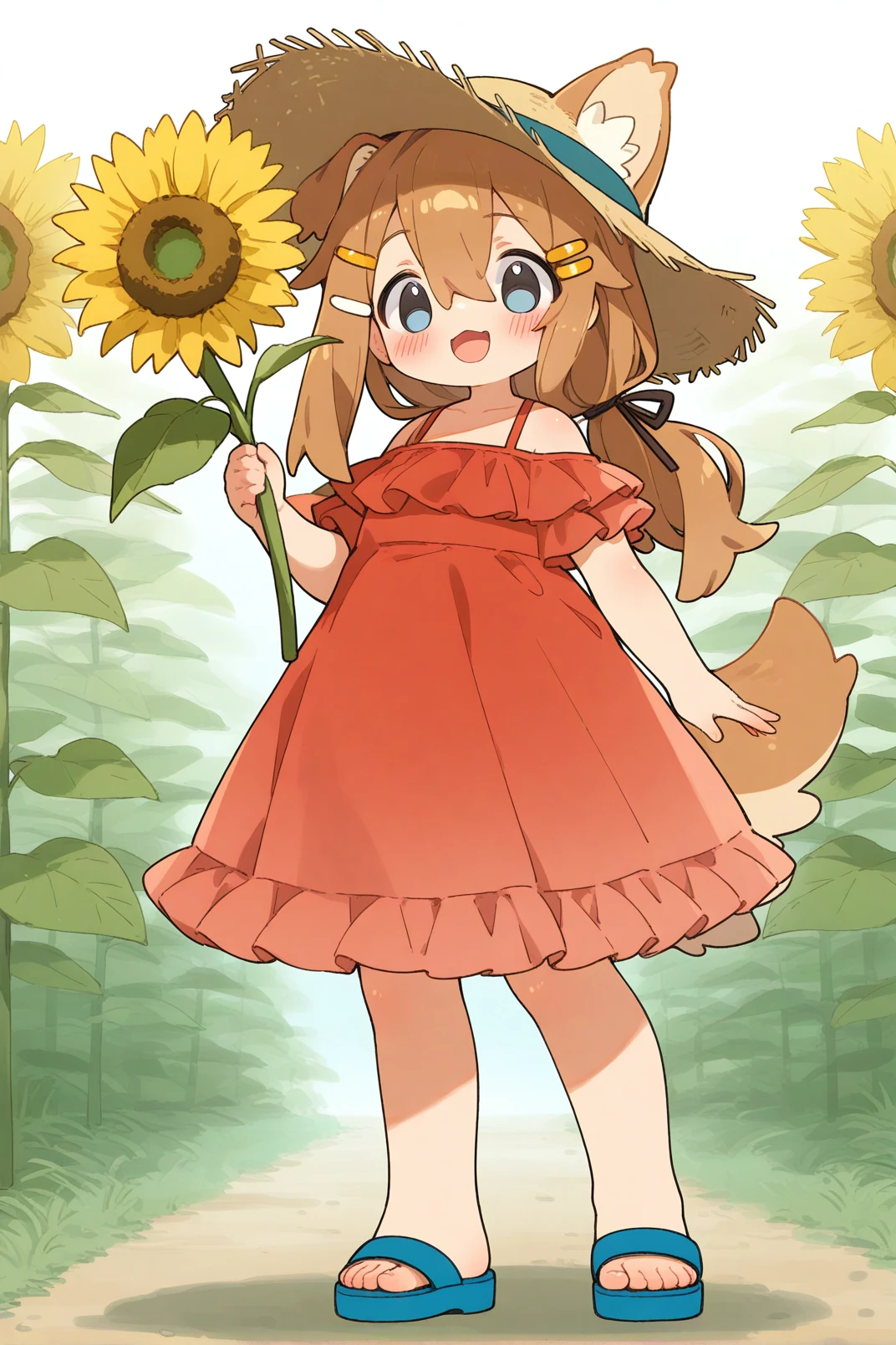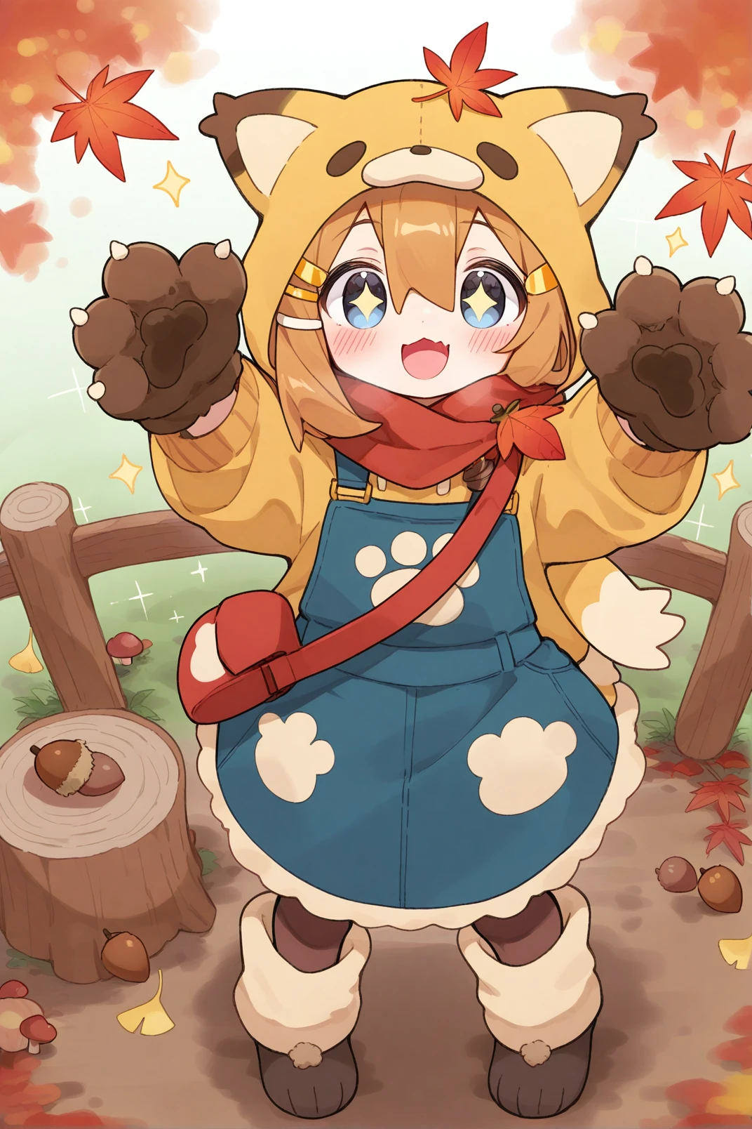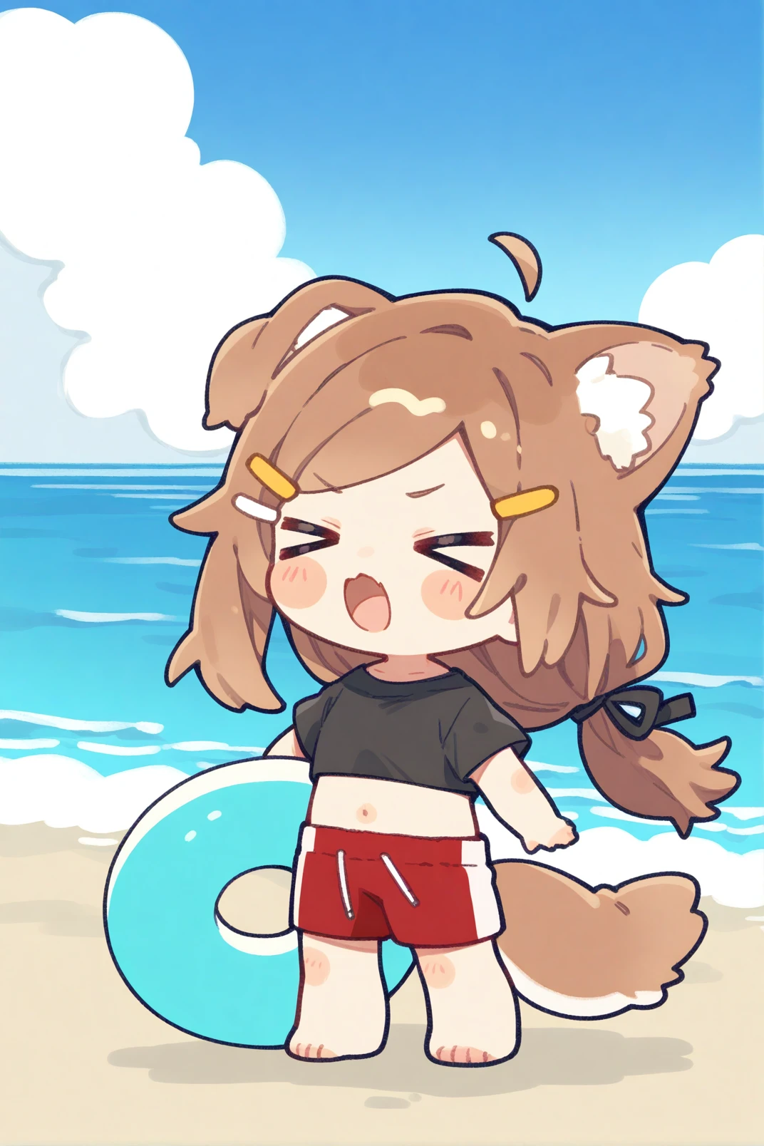 mamehinata, animal ears, blue eyes, brown hair, tail, 1girl,solo, short over long sleeves, visor cap, shorts, layered sleeves, hair ornament, collar, ahoge, shirt, black shorts, short sleeves, red shirt, long sleeves, dog tail, shoes, fang, loose socks, cup, hairclip, paw print, dog ears, hair between eyes, sleeves past wrists, red collar, pocket, blue footwear, bag, socks, white socks