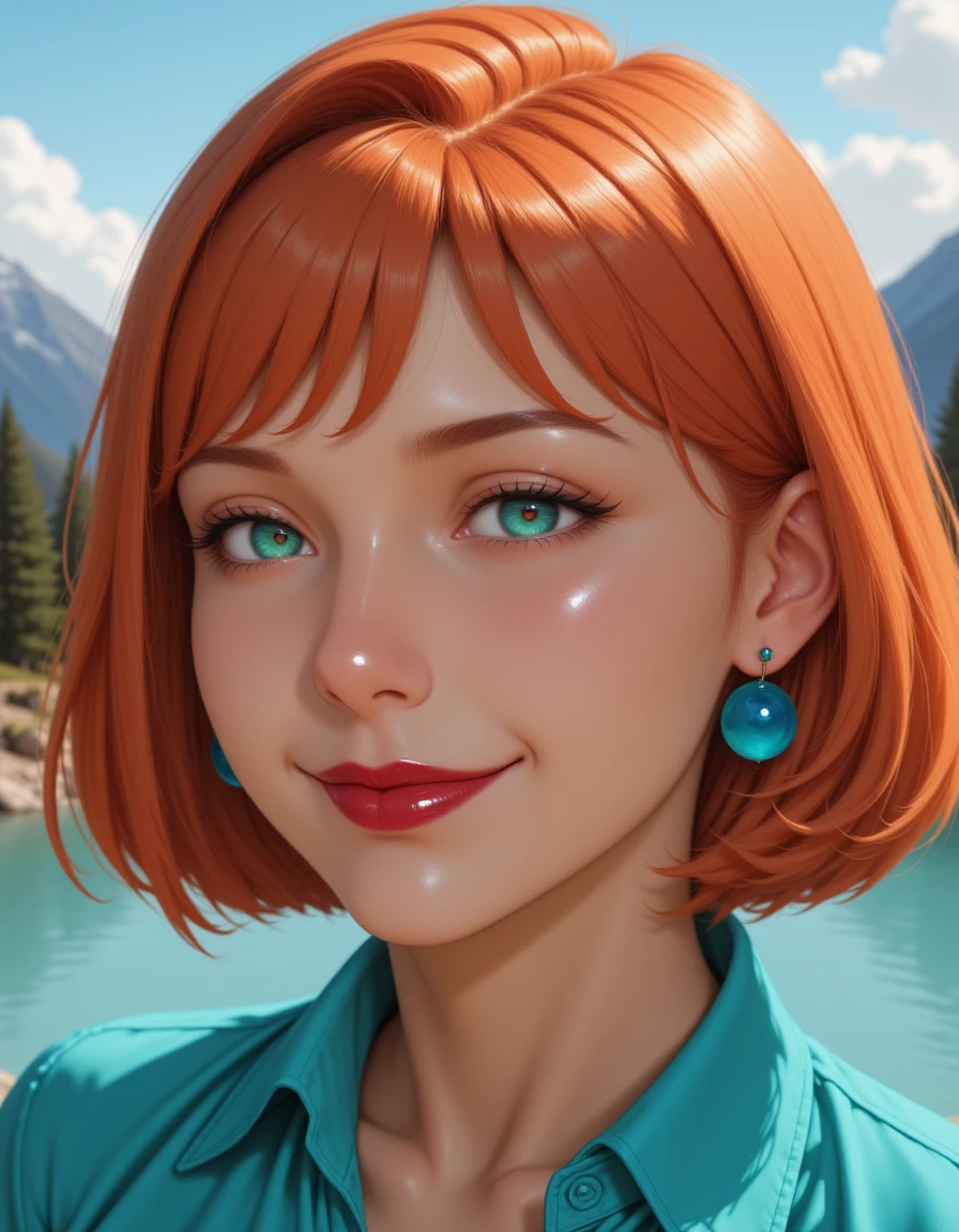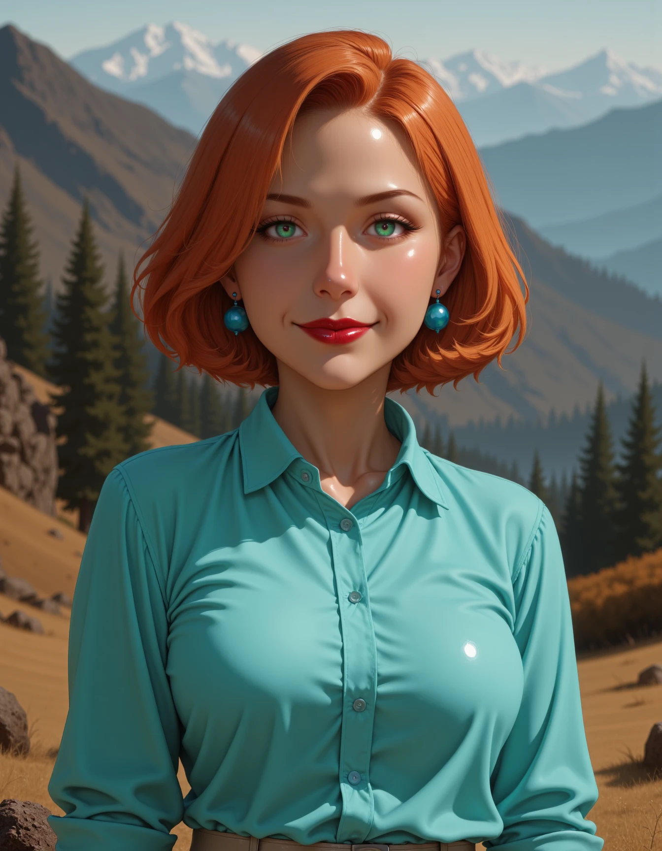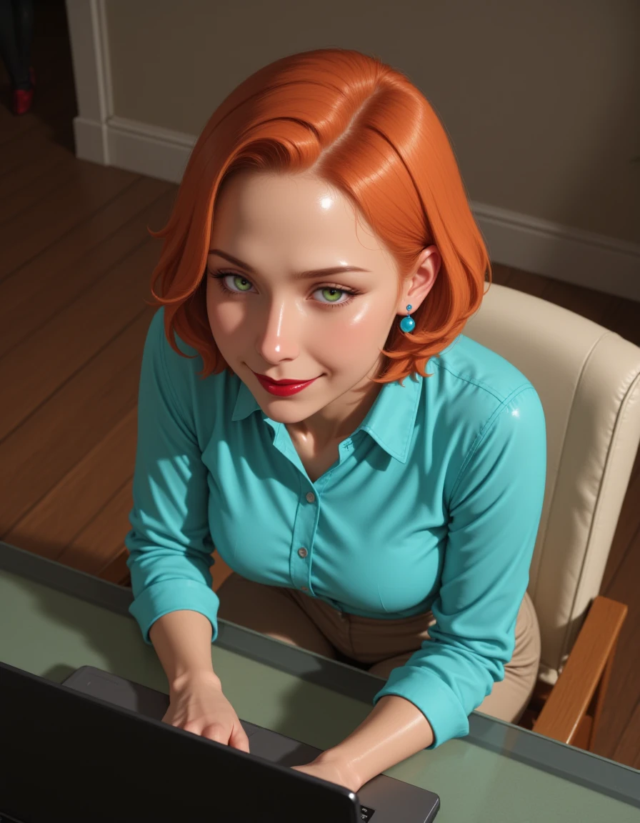 blue earrings, short orange hair, red lipstick, shiny green eyes, beige pants and a blue collared shirt
