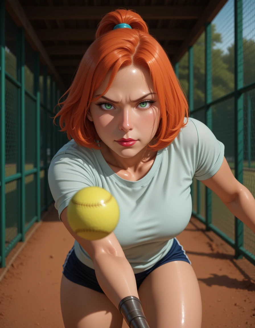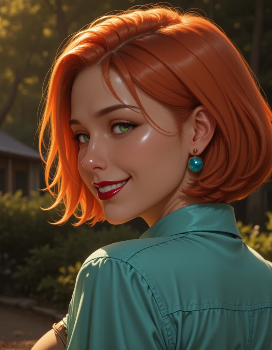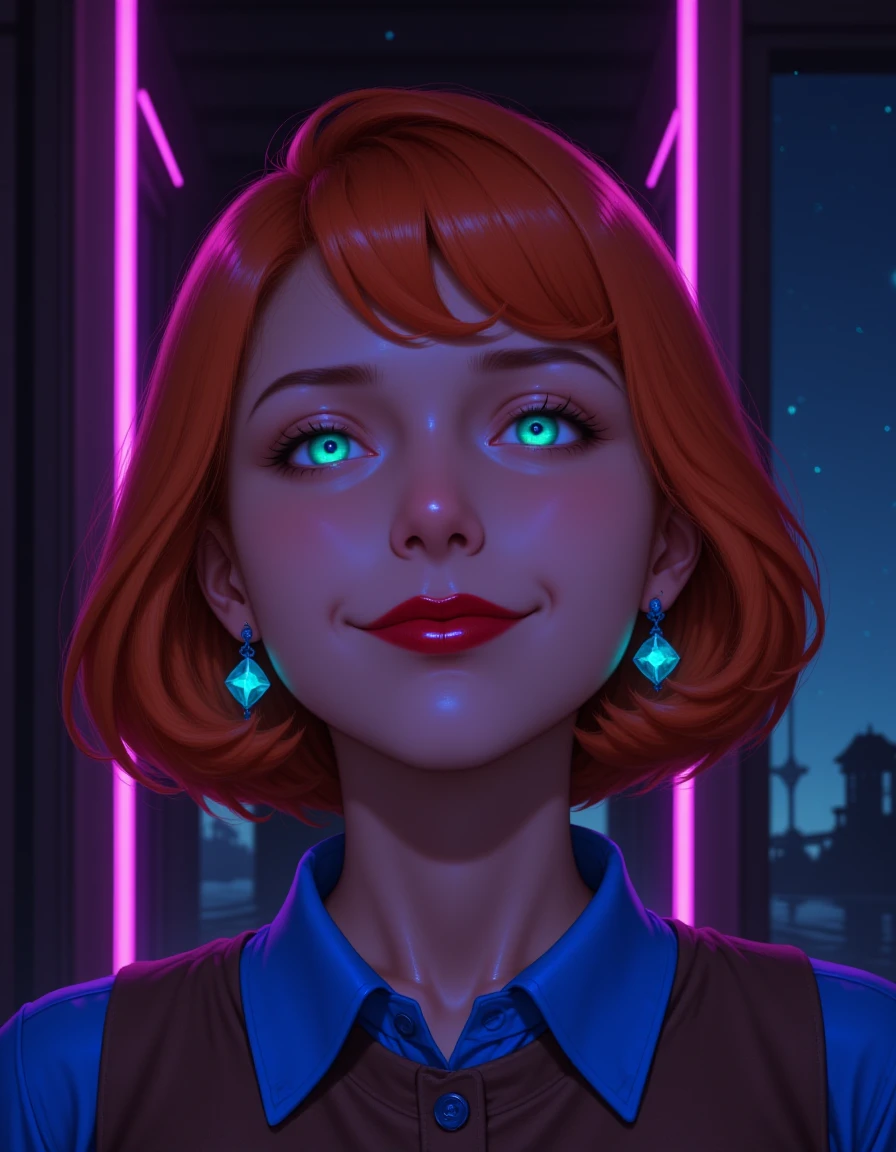 blue earrings, short orange hair, red lipstick, shiny green eyes, beige pants and a blue collared shirt