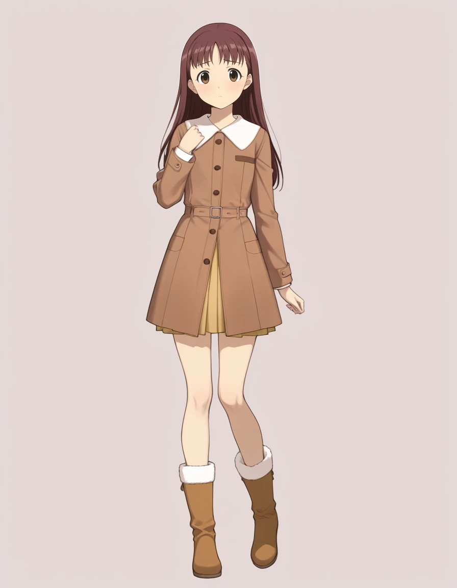 mai_iwka,mai_misakiwk,long_hair,brown_hair,brown_eyes,long_sleeves,short_coat,pleated_skirt,short_skirt,yellow_skirt,fur_bootsAkane